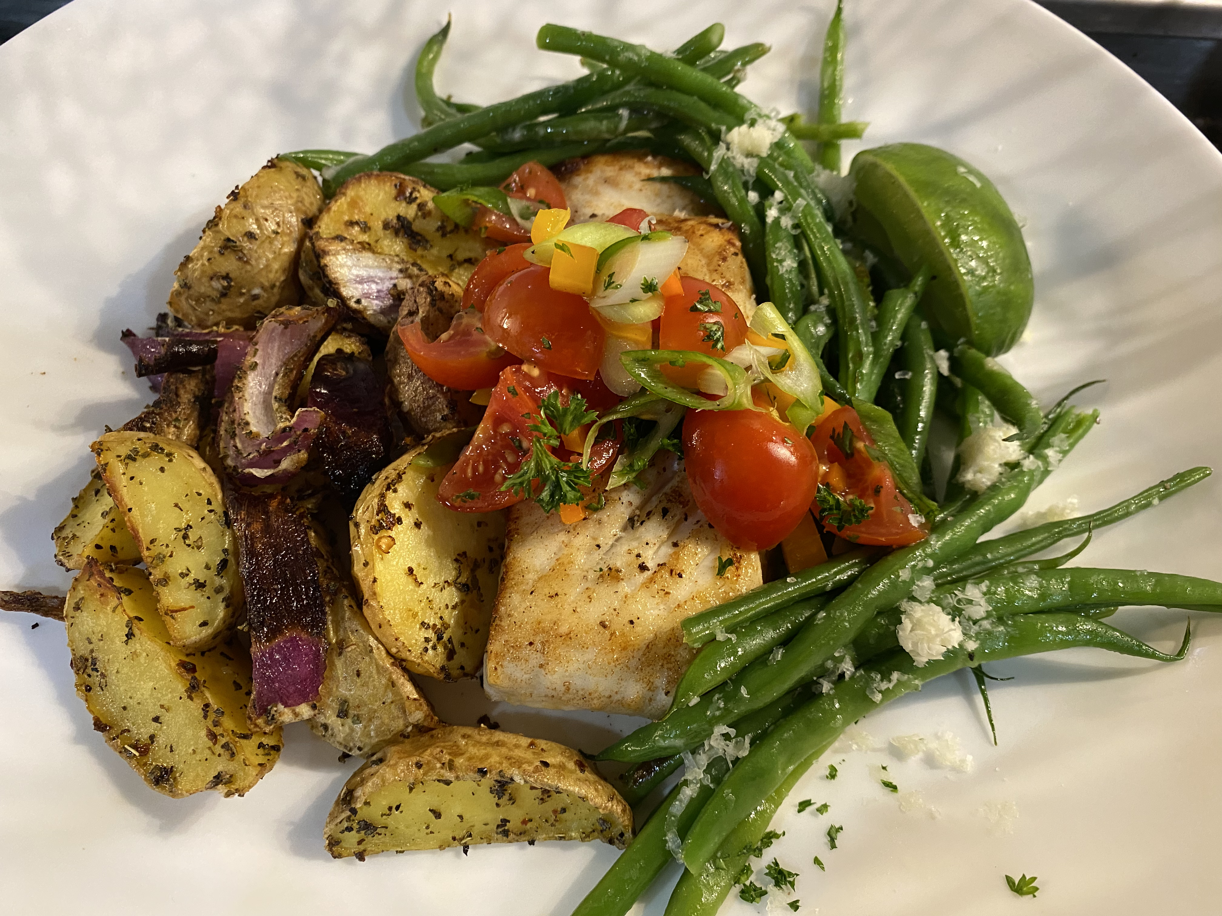 - SERVE FISH WITH SALSA: Place each fillet on a plate and top generously with the reserved salsa. Serve hot or warm with a reserved wedge of lemon, lime, or orange along with Red Onion-Oregano Potatoes and Cheesy Green Beans, if desired. (Directions in notes.)
