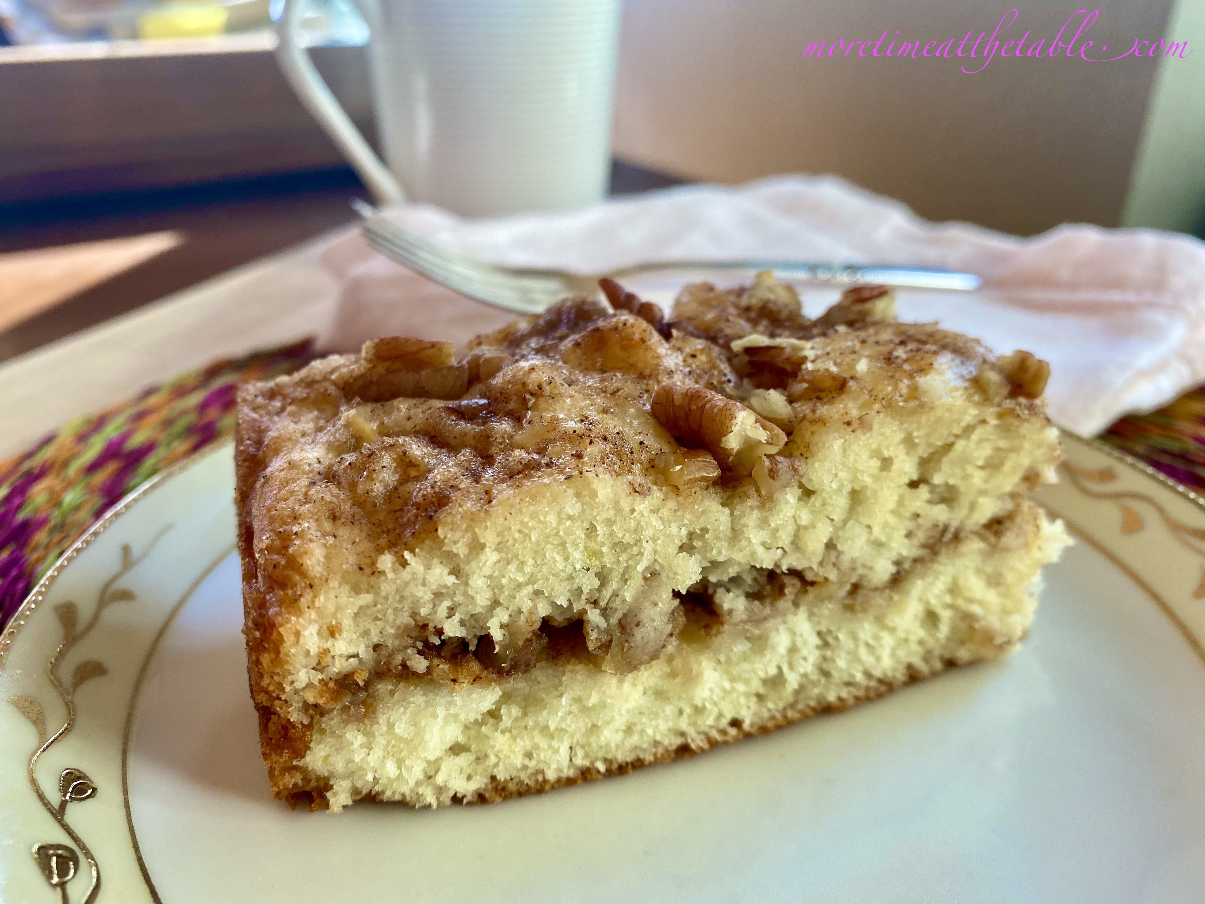 By this time, I hope you’re seriously considering brunch at home for Mother’s or even Father’s Day. Wondering where the tablecloth or mats might be. Cleaning a candlestick. Dreaming about breakfast tacos or a veggie frittata. A big pan full of scrambled eggs would be wonderful and quick. What about fried potatoes or sangria? Crustless quiche with shrimp and green chiles? (See photo above. Can be made with cooked salmon, too.) A bowl of cuties for a centerpiece –or even a pot of flowers mom can plant outside later on. An easy coffeecake is the perfect homemade make-ahead sweet for such a meal. My Apple-Pecan Coffeecake is simple enough for kids to make (with a bit of help chopping if they aren’t knife-savvy yet, though I’m fond of the food processor for this chore) and even adults will like making it because it’s just that good without much effort. That there are 12 servings makes everyone happy as this cake is better leftover than fresh. There’s no butter to cream as the cake is made with oil. Electric mixer? Fine. Wooden spoon or whisk? Just as good. The ingredients are basics you probably have on hand anyway. Flour, sugar, eggs, milk, nuts, spices, and two cups of finely chopped apples (any will do and you needn’t peel them.) There’s some streusel that is tucked into the center of the cake along with the apples so that when you bite into it, the goodies are not all on top but also all the way through. Coffee cake. It’s not just for coffee any more.