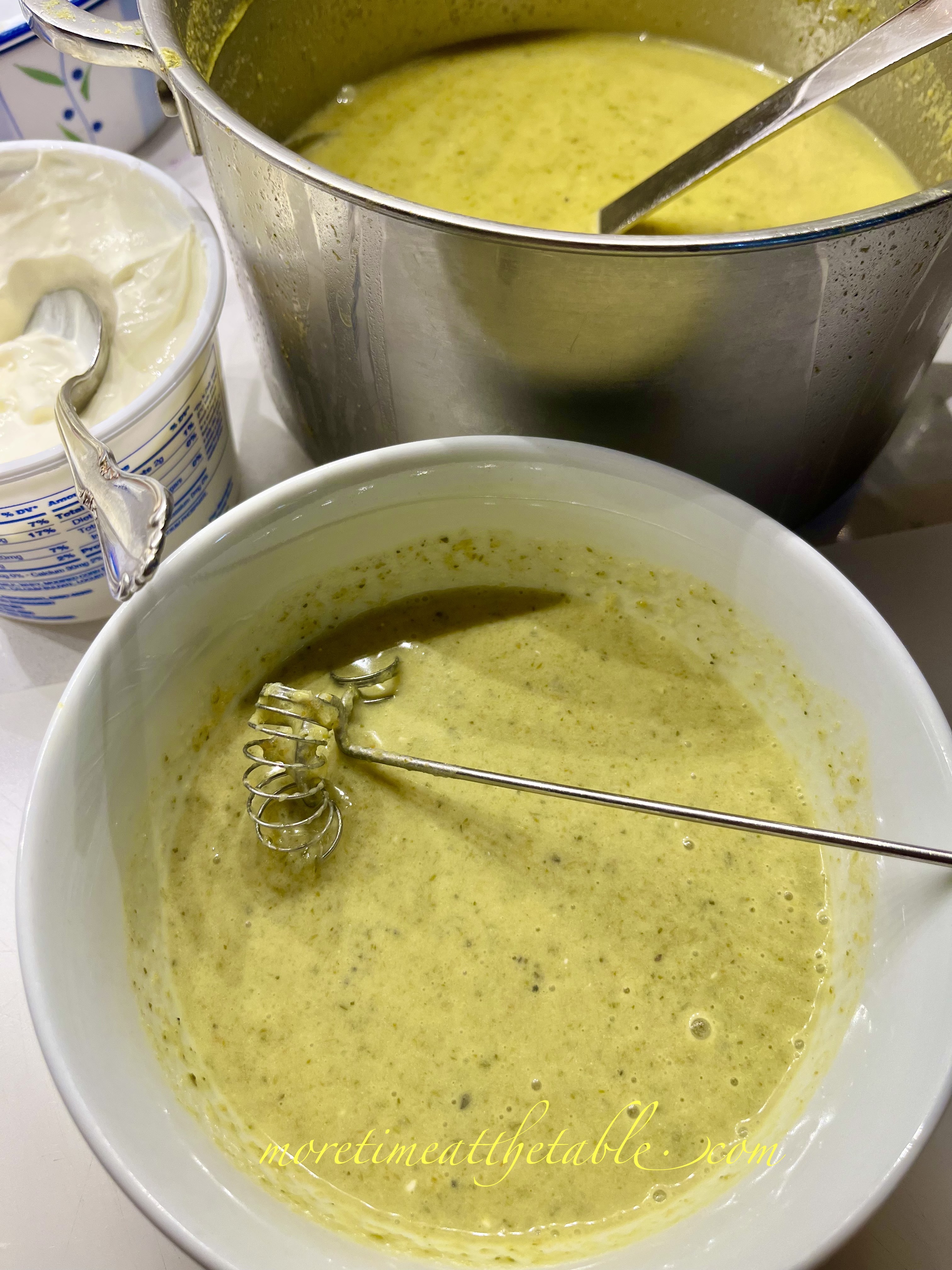 And while this particular soup is perhaps weirdly named “Sour Cream of Asparagus,” you can leave the pot of soup cream-free (it will freeze like that and it won’t freeze with the sour cream without breaking or curdling) and then whisk in the sour cream into each bowl as you serve it–see below. Or even, as you’ll read in the recipe, only dollop in sour cream on top and skim your spoon through the soup adding only a tiny bit of cream at a time to each bite. And, naturally, the sour cream can be skipped all together if you’re not into it. I promise you’ll like the soup with or without when you try this: