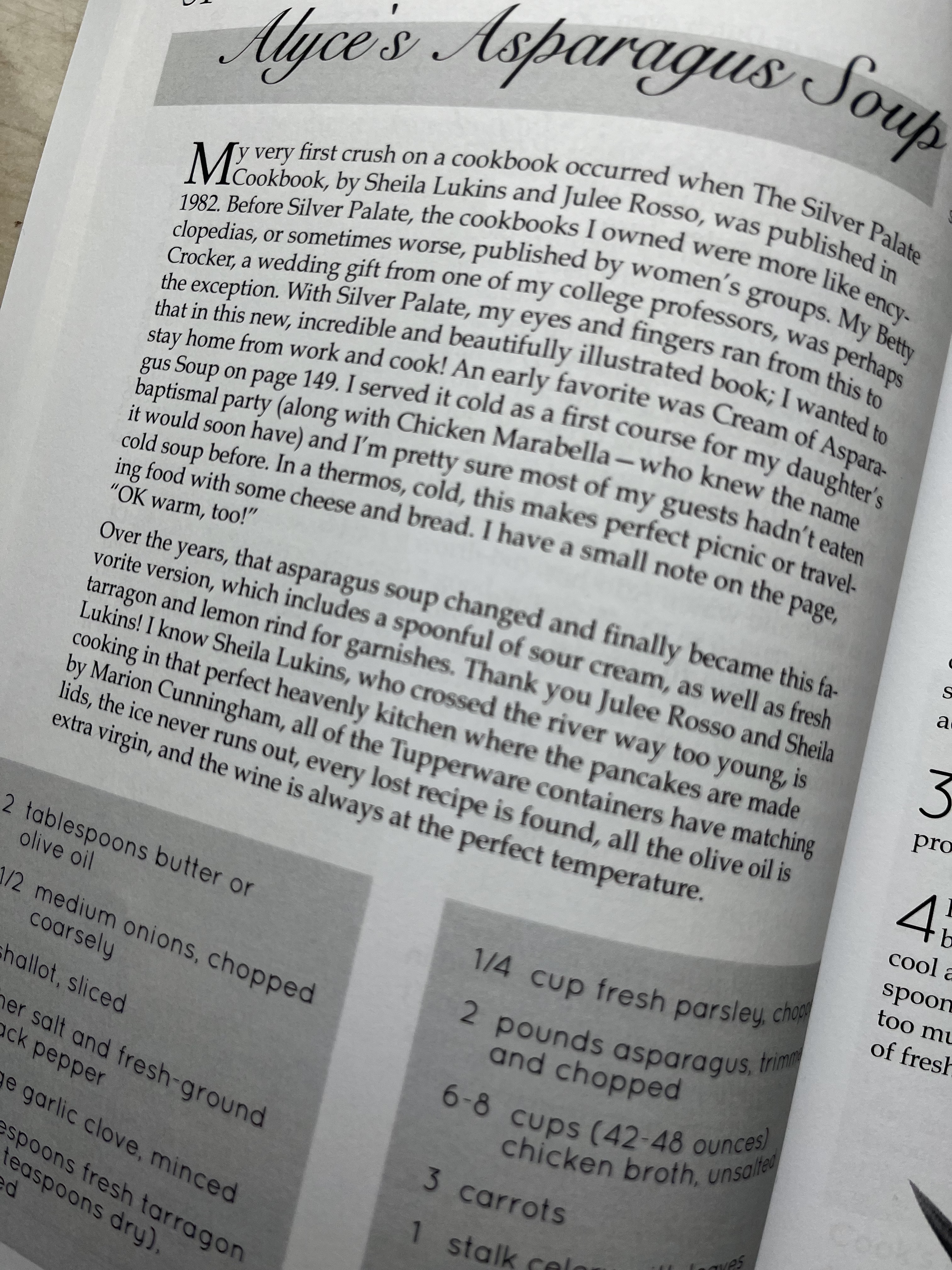 Jump to RecipeMy own first asparagus soup from 1986, inspired by SILVER PALATE’S, was first on the blog (scroll down), but also ended up in my soup book: