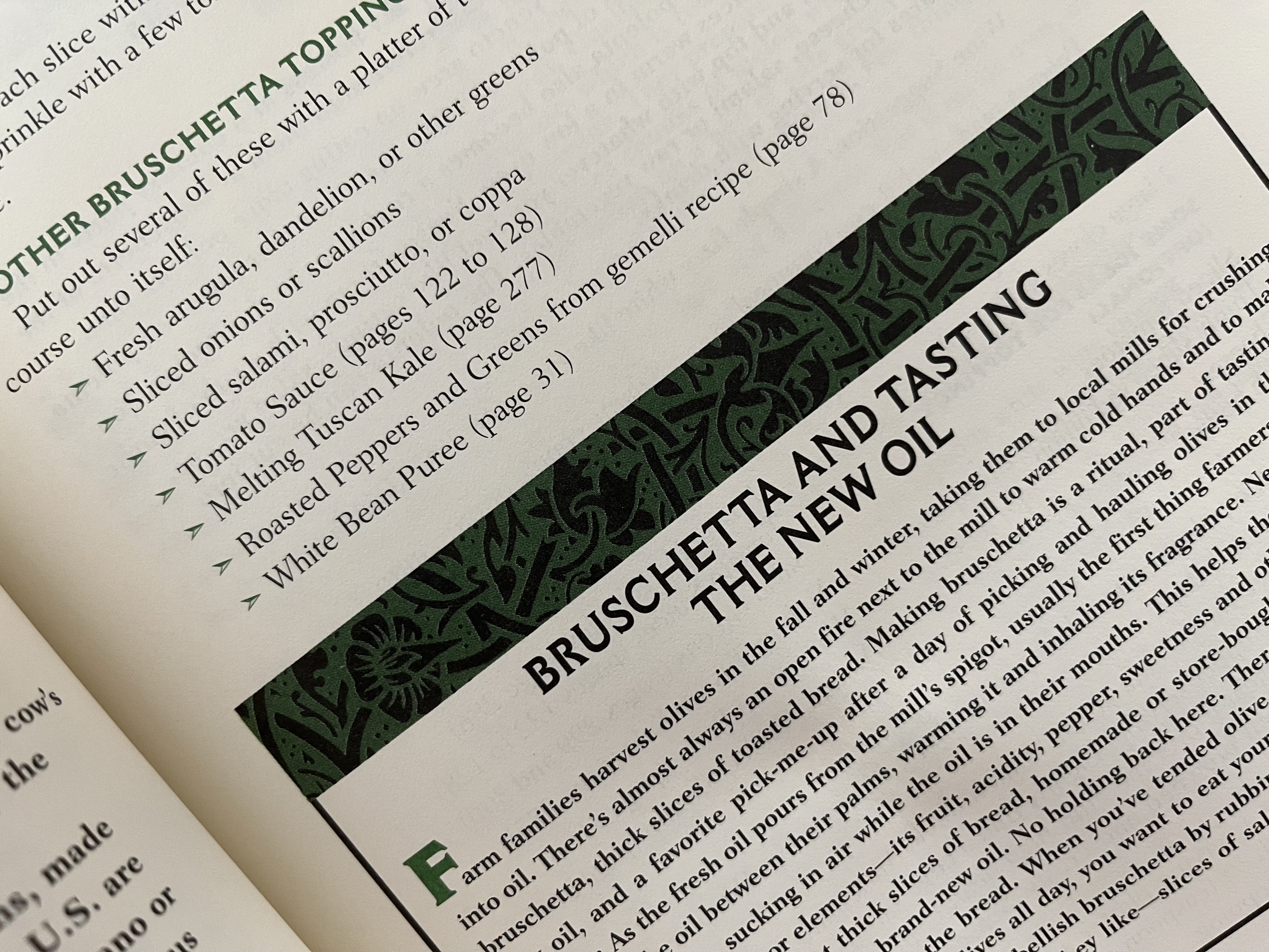 I adored what I found out about bruschetta — that it’s a part of the fall olive oil making tradition. That not just a smear of oil goes on the open fire-toasted bread, but a generous, lush-y pour covers the bread so the new oil can be well-tasted and likely judged. (A drizzle or a brushing won’t accomplish that.) It’s all about the oil. Not so much about the bread, though there’s no reason to make bruschetta with schlock bread. I think I get it. It’s like harvest at the winery — a little sip isn’t enough to give you a really good taste of the new wine. I’ll admit here — I rarely like new wine. You won’t see me running out to buy Beaujolais Nouveau, for instance. People who make wine will feel differently and be in love with the promise in the taste.