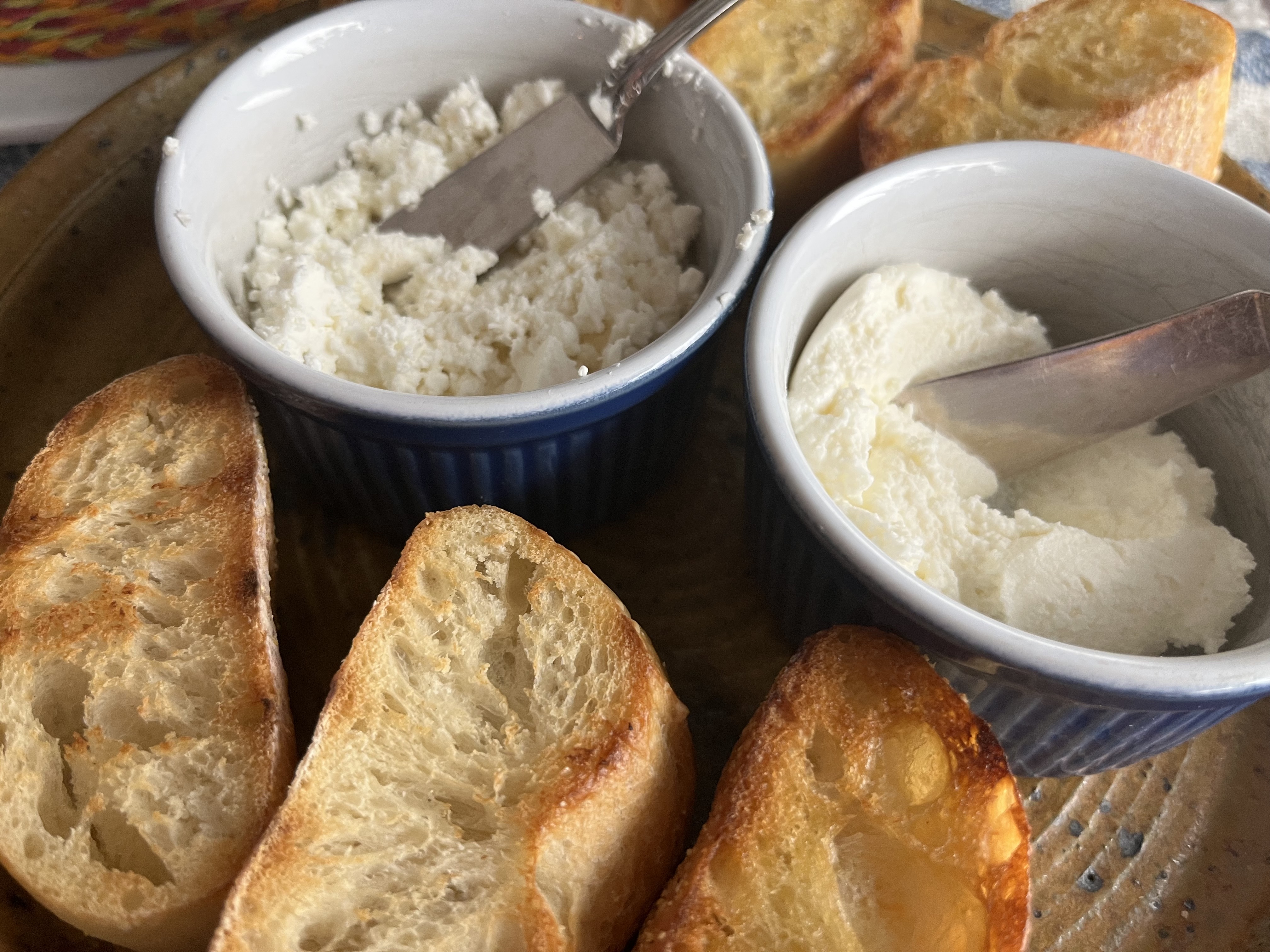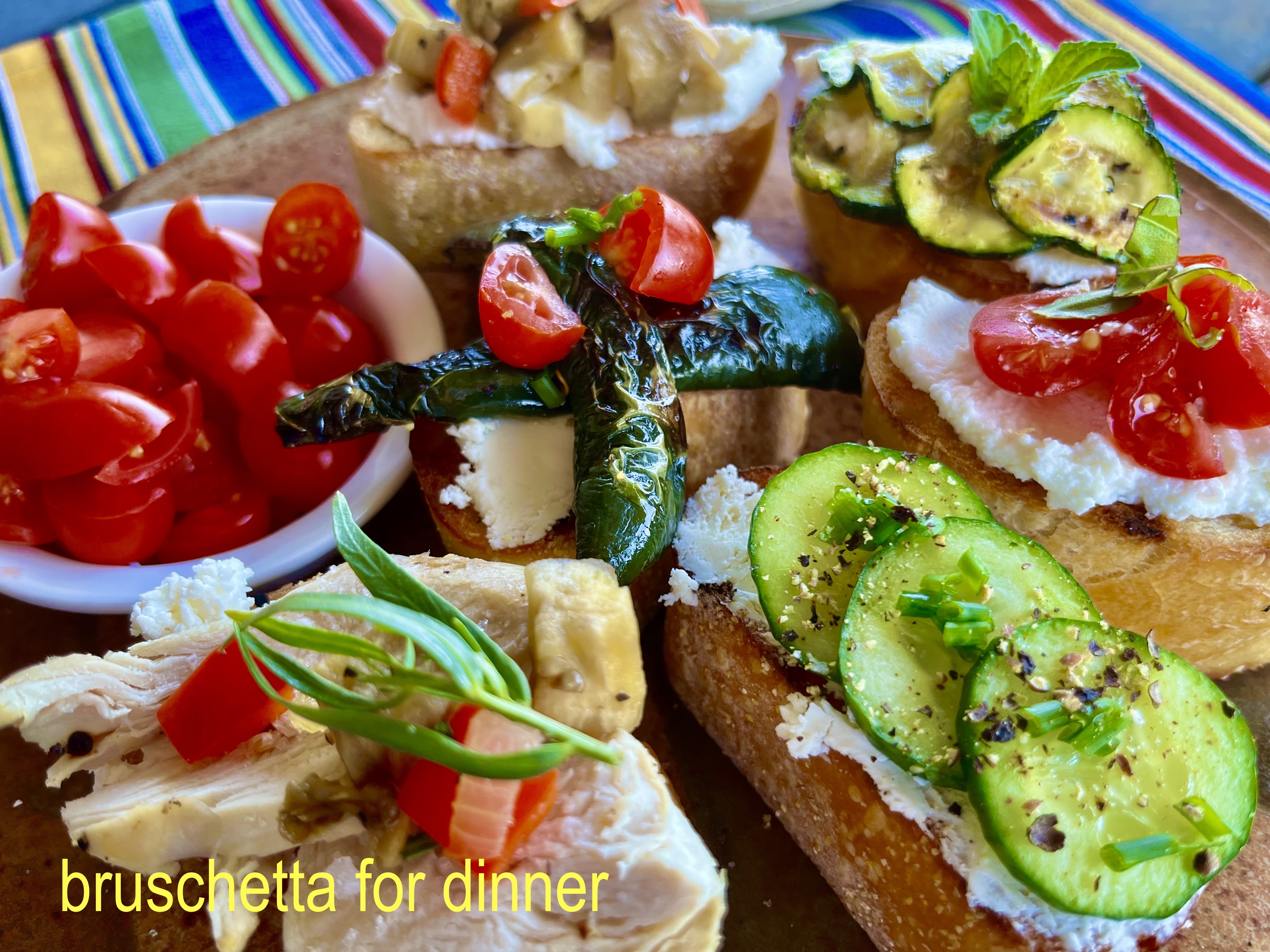 -A choice of spreadable cheeses (ricotta, goat, etc.) or other soft cheeses such as fresh mozzarella or feta. A tablespoon or two — or a small slice — for each bruschetta is plenty. Go out on a limb and add my Green Chile-Pimento Cheese or Salmon Cheese Spread. Hummus or other bean spreads are other yummy bases for your toppings and will be perfect for your vegan guests or anyone avoiding dairy.