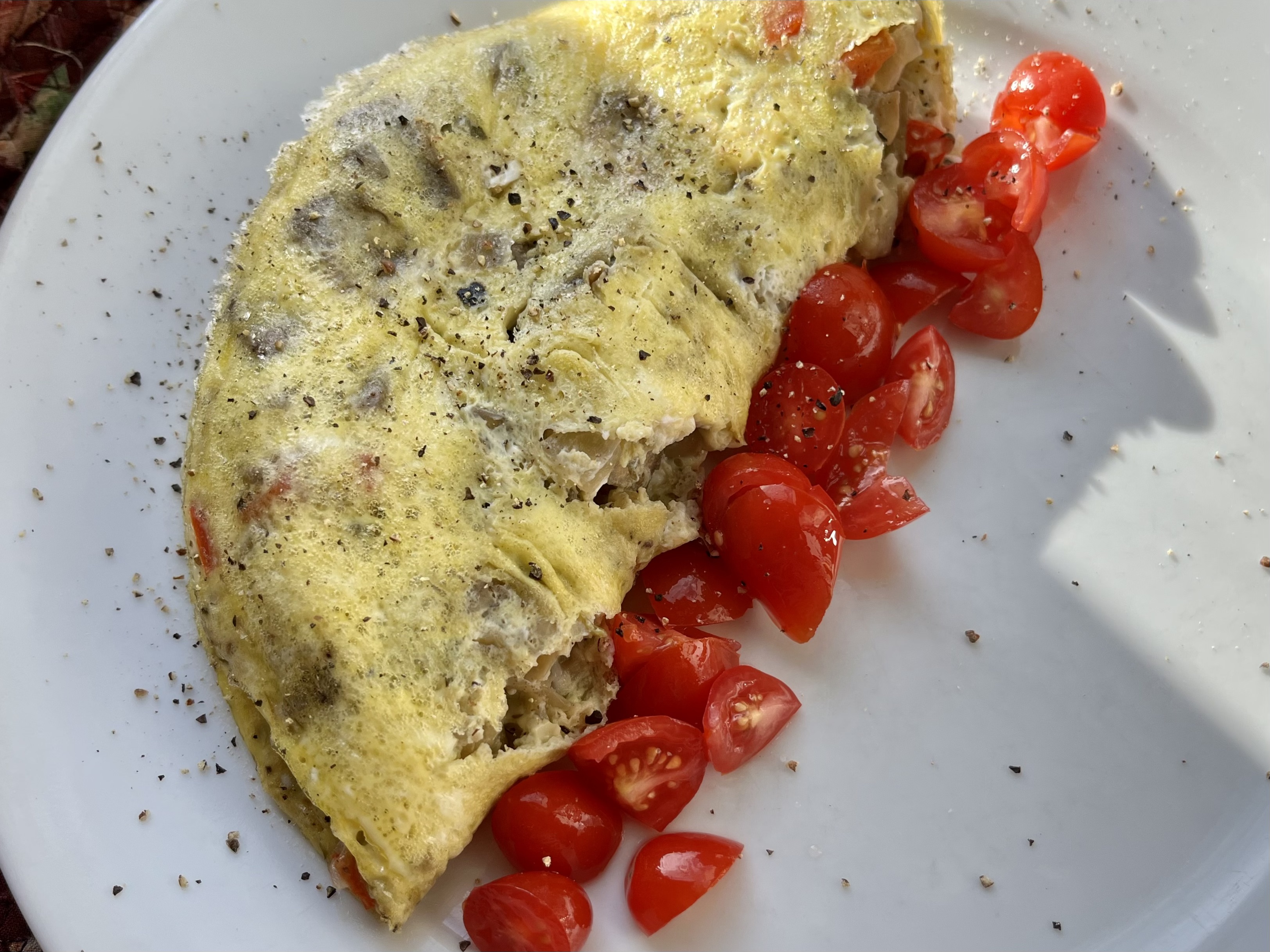 CUTTING FOOD COSTS/AVOIDING WASTE FOR THIS DISH (see graphic at right above): If you planned this ahead and made a list, you get an A. Def V for value as there’ll be leftovers of some sorts. Bread can be fried into croutons, sliced into a strata, grated into crumbs and frozen, or made into French toast for breakfast. Most of the other ingredients are perfect for salads (pasta?) or could be tossed into soup or omelets–see photo above. Goat cheese can be frozen in a pinch. If you’ve skipped the meat, you get E for Every week have 1 veggie meal.
