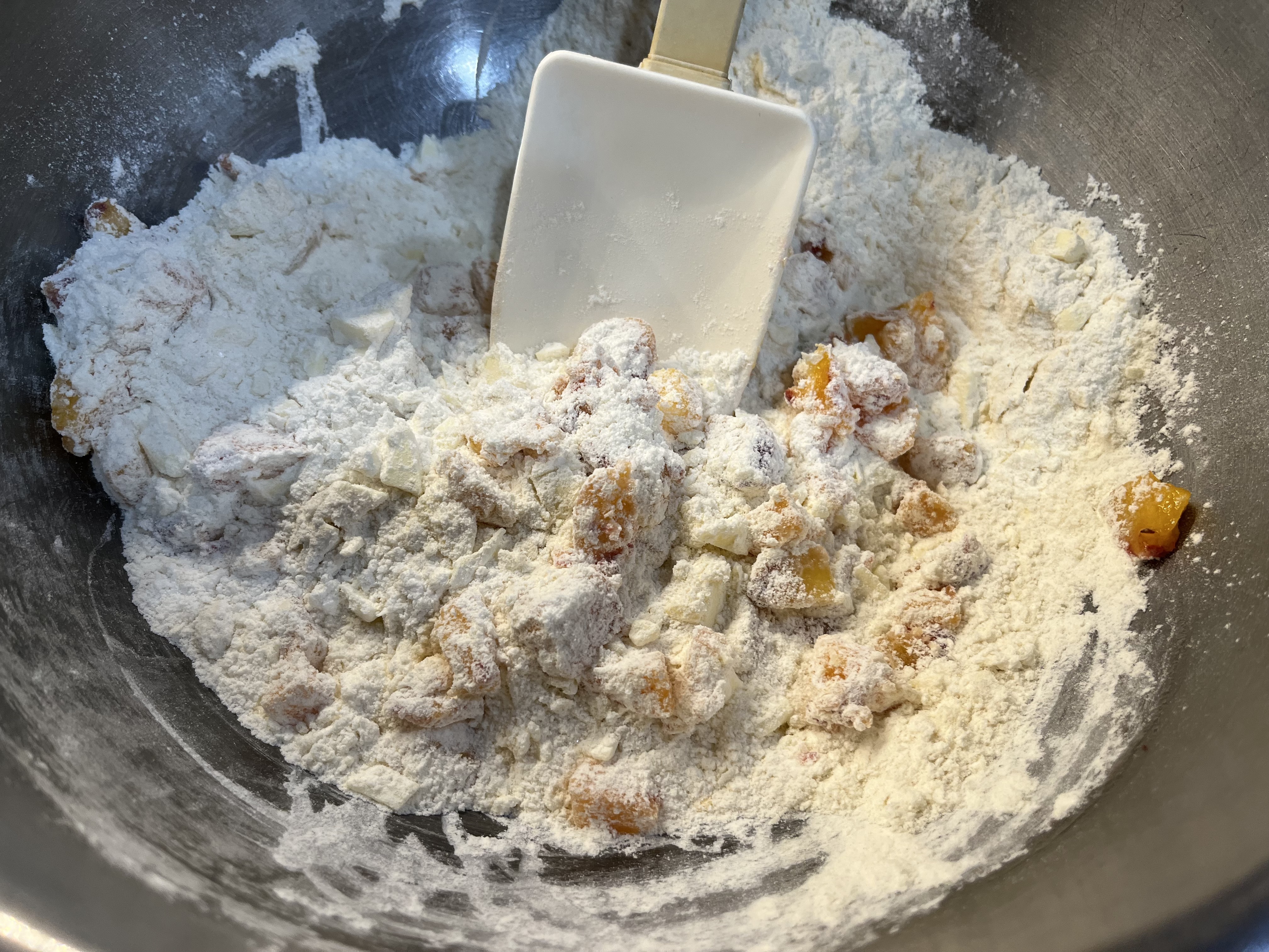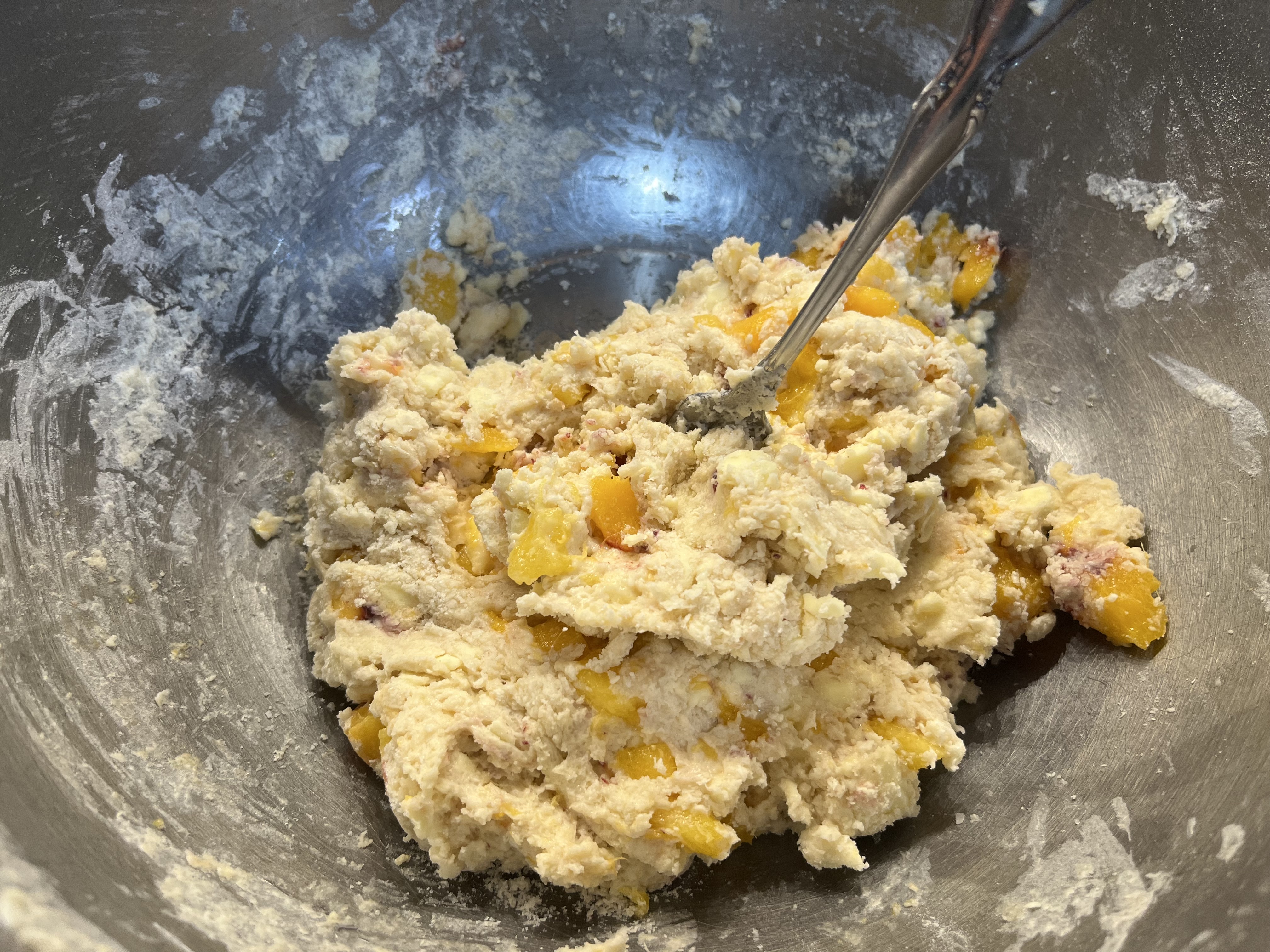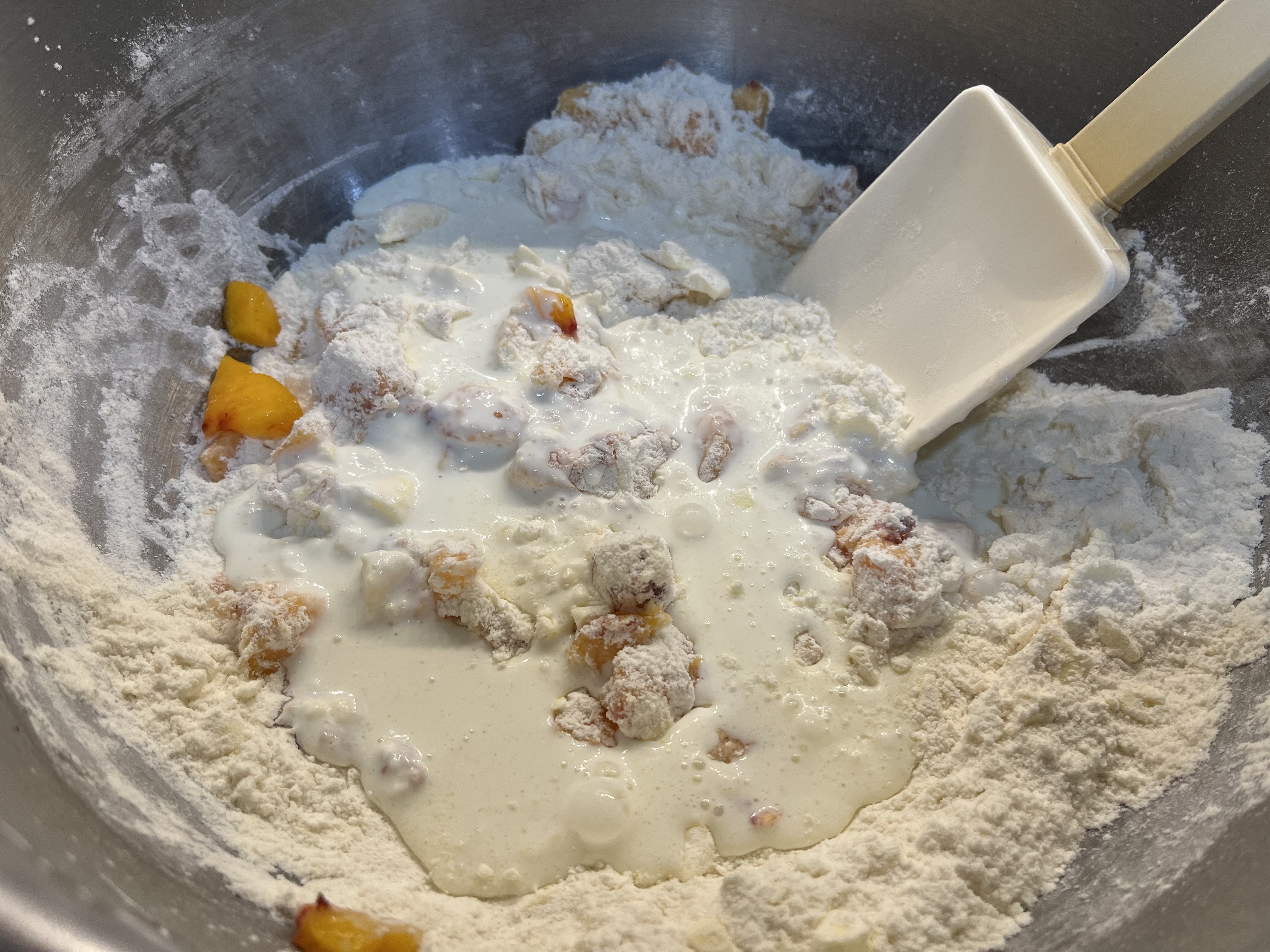 - TURN FLOUR MIXTURE OUT INTO A LARGE BOWL and gently stir in the peaches. In a small bowl, whisk together the sour cream or yogurt and milk and tip that into the flour mixture. Using a table fork, stir until all the dry bits are incorporated but the dough is still shaggy. (Takes a minute or two; be patient.) Knead a few times until the dough barely holds together, then turn the dough out onto a lightly floured counter or board. The dough needn't be uniform or neat. These are rather rustic scones.