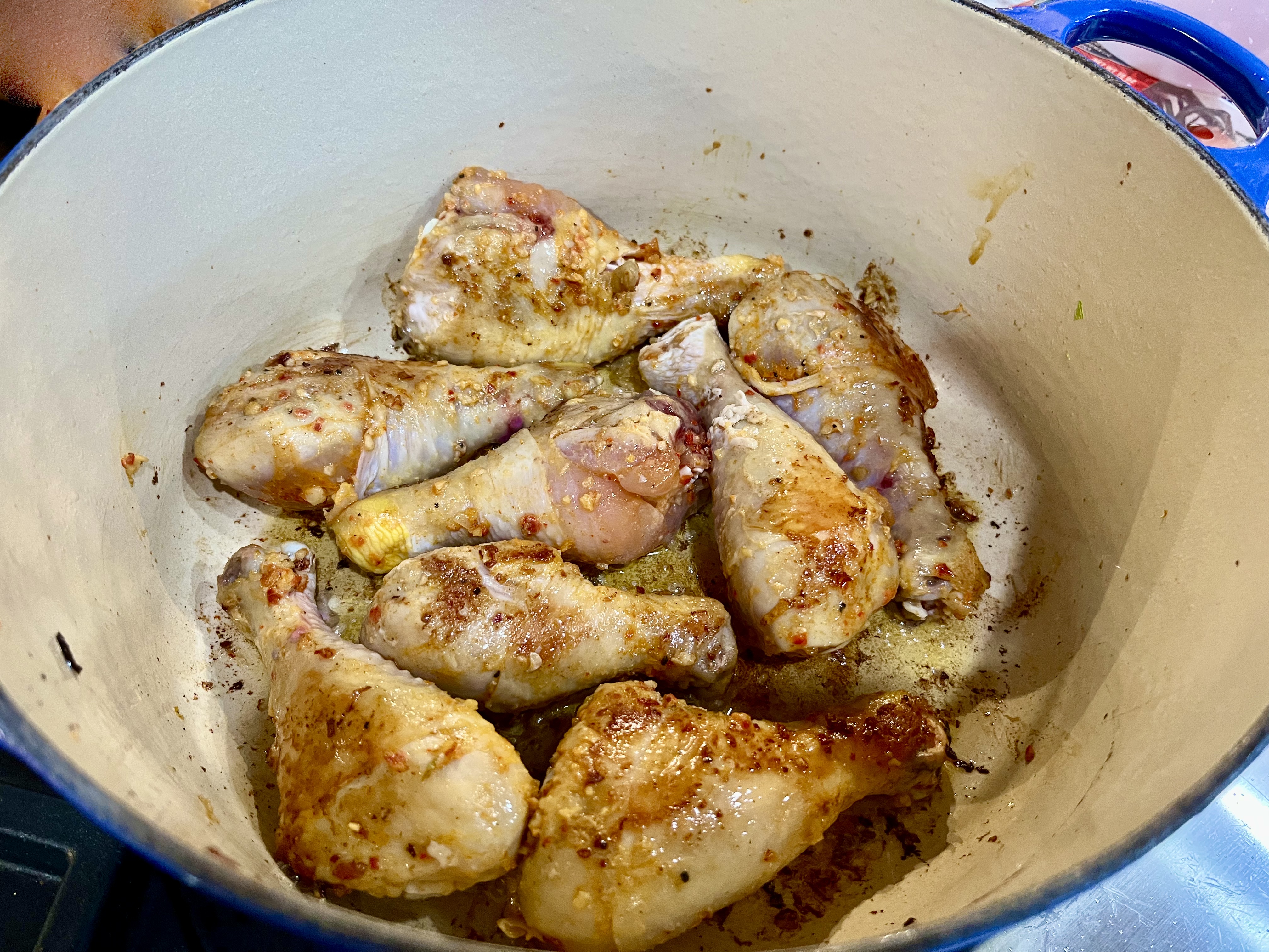 - HEAT A 6-QUART DUTCH OVEN with the oil and butter over medium-high heat for two minutes. Sprinkle the drumsticks with kosher salt and fresh ground pepper, along with the pinch of crushed red pepper. * Add the seasoned chicken to the hot pan and cook for about 5 minutes or until well-browned on one side. Turn and brown the other side. Remove chicken to a plate and cover.