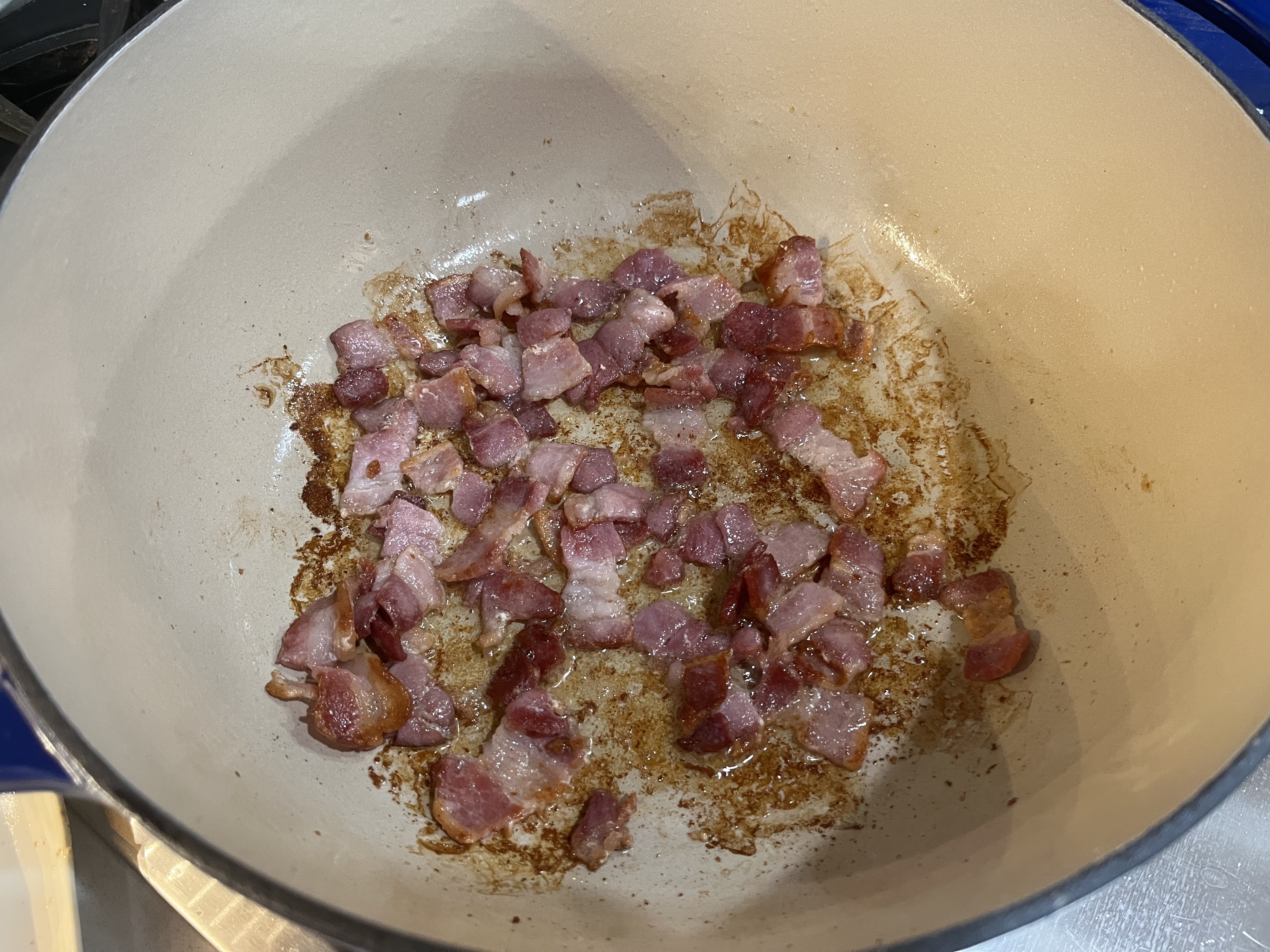 - COOK BACON AND MUSHROOMS: Drizzle a tablespoon of oil into the bottom of a warmed Dutch oven or large, heavy pot; let warm through over medium heat. Add diced bacon and cook, stirring regularly, until well-browned. Remove bacon to a paper towel-lined bowl. Spoon or pour out half of the bacon fat into a cup and save for another use or discard in trash once cool. Toss the mushrooms into the pot and cook, stirring once or twice, until well-browned. Sprinkle with salt and pepper. Spoon the mushrooms into the bowl with the bacon and set aside.