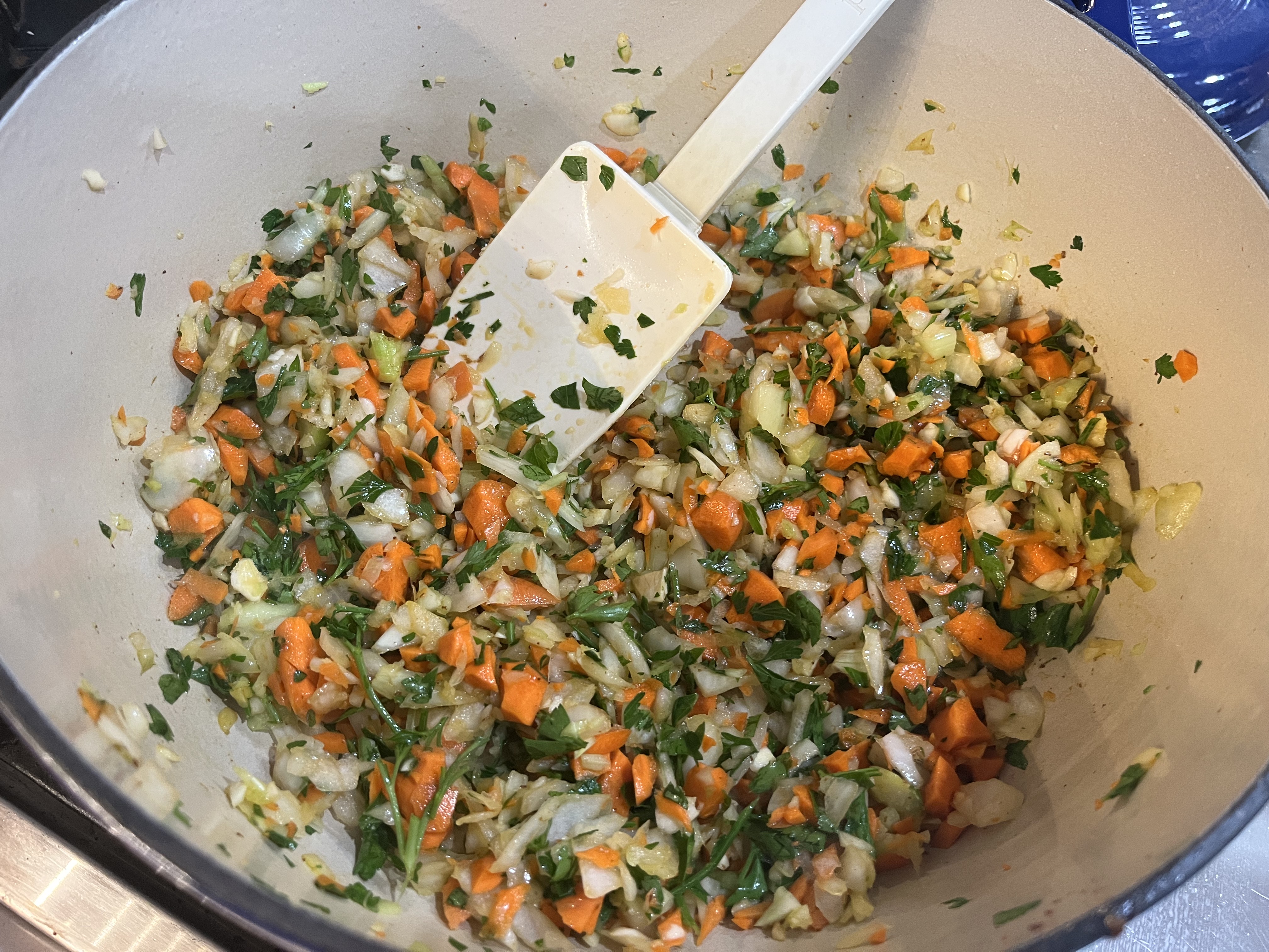 - COOK THE VEGETABLES: Add another 2 tablespoons of olive oil to the pot and let warm through. Add the onion, carrots, celery, parsley, a ½ teaspoon EACH of kosher salt and fresh ground pepper and 1/8 teaspoon crushed red pepper. Cook, stirring often, for about 10 minutes or until softened (not browned), adding garlic for the last minute or so.