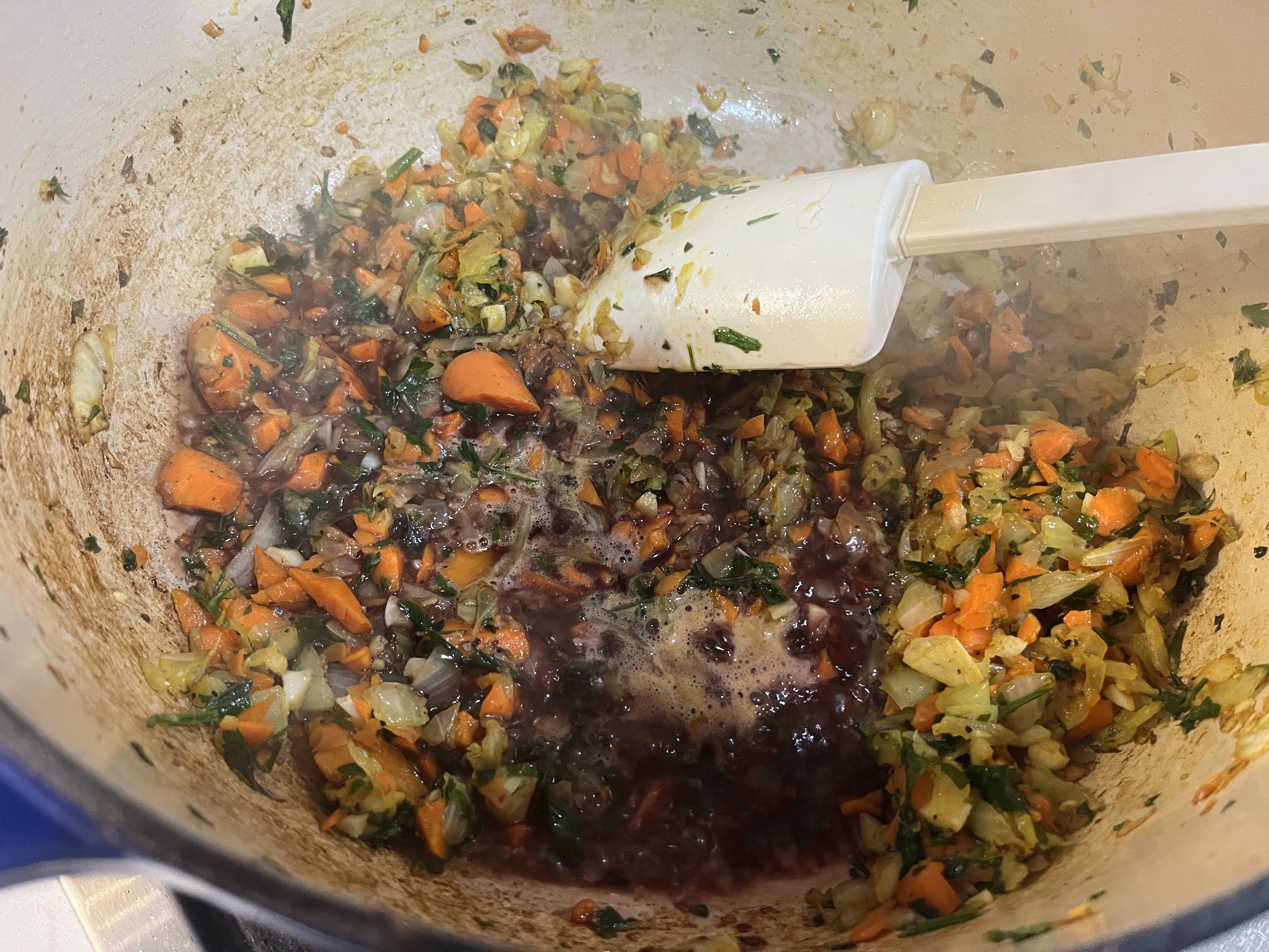- POUR IN THE RED WINE and cook for a few minutes until the wine is absorbed by the vegetables.
