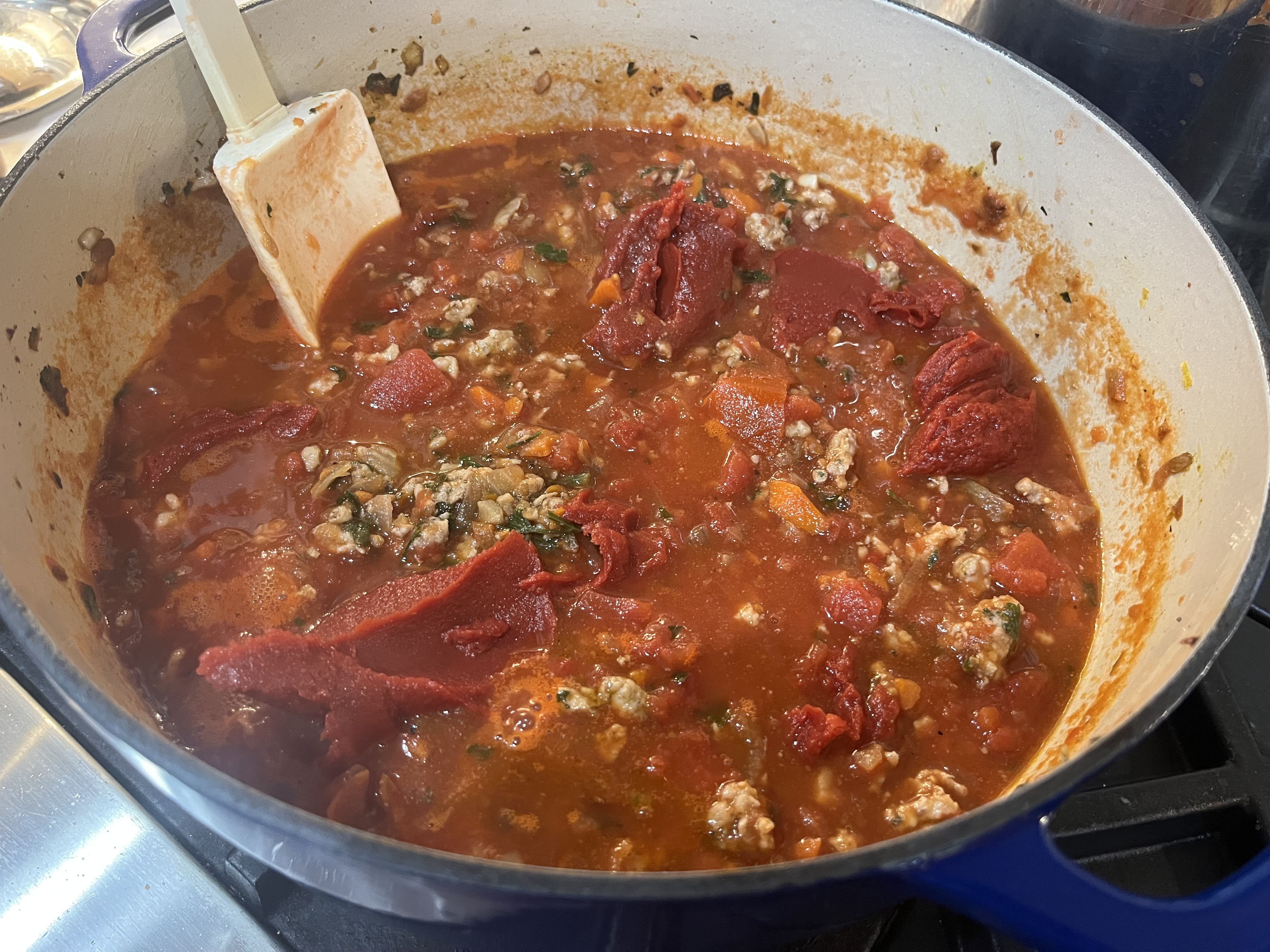 - ADD THE GROUND CHICKEN to the pot, breaking it up with a wooden spoon, and cooking until no pink remains in the meat.