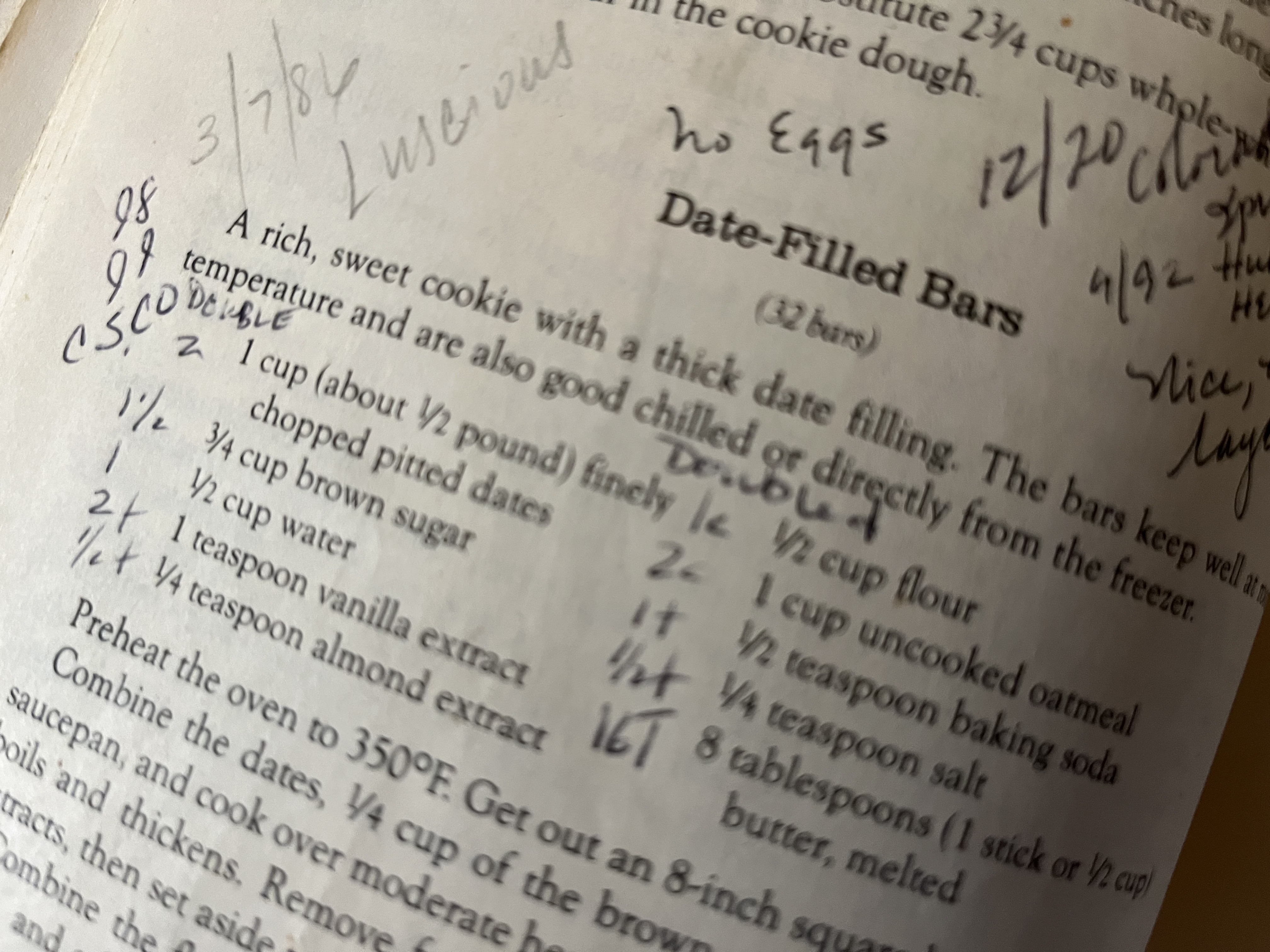 At our house, there are surely a few such sweets like my ginger cookies or some version of “Chocolate Covered Cherry Oatmeal Cookies.” But the other day when I asked my husband which cookie he really wanted for December (time was running out or, as we sing around our house, “Christmas is coming; the goose is getting fat!”), he said, “Date Bars.” I know he loves date bars and maybe I knew they were at the top of his cookie monster list, but I still thought about it for a moment or two. No longer, though, because sometime over the next few days, I jumped out of bed at o’dark early and slid a quick pan into the oven so it was baking when he woke up. “The house smells so good,” is my favorite compliment. For the blog, I’m calling them “Dave’s Date Bars” because that’s how I think of them in my mind. I don’t believe the famous cook-writer who first dreamed them up would be offended. She was all for the home cook her entire career and has been one of my strongest cooking mentors. If you’re a longtime blog reader, you’ll recognize her name from other posts.