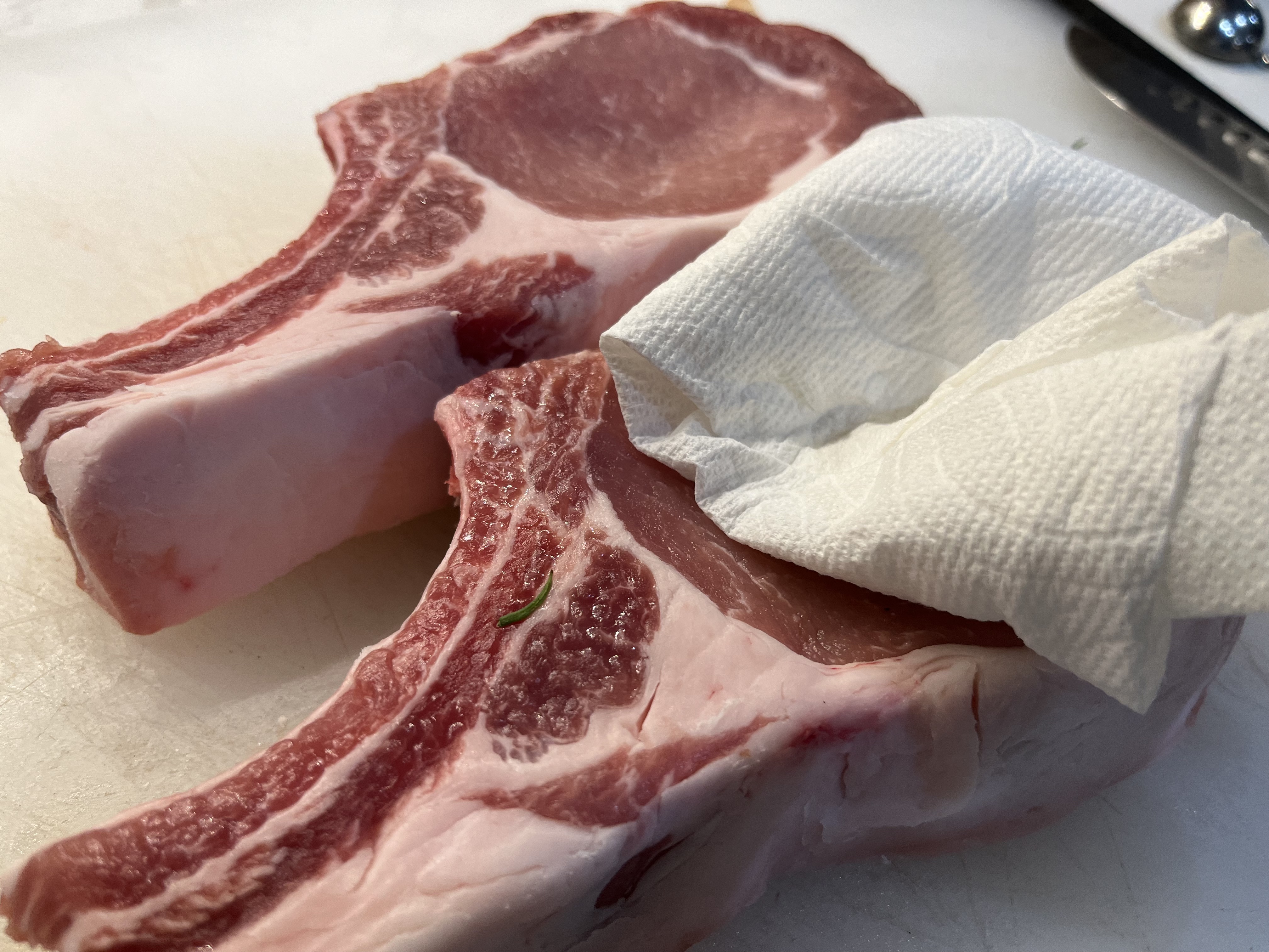 - PREP + SEAR THE PORK CHOPS ON THE STOVETOP: Heat a small grill pan or cast iron skillet over medium-high heat for 2 minutes. In the meanwhile, blot dry the chops with a paper towel, drizzle them with a teaspoon of olive oil on each side, and sprinkle both sides with salt and pepper. When the pan is hot, add the pork chops and sear on each side for 2 minutes or until you see golden brown grill marks.