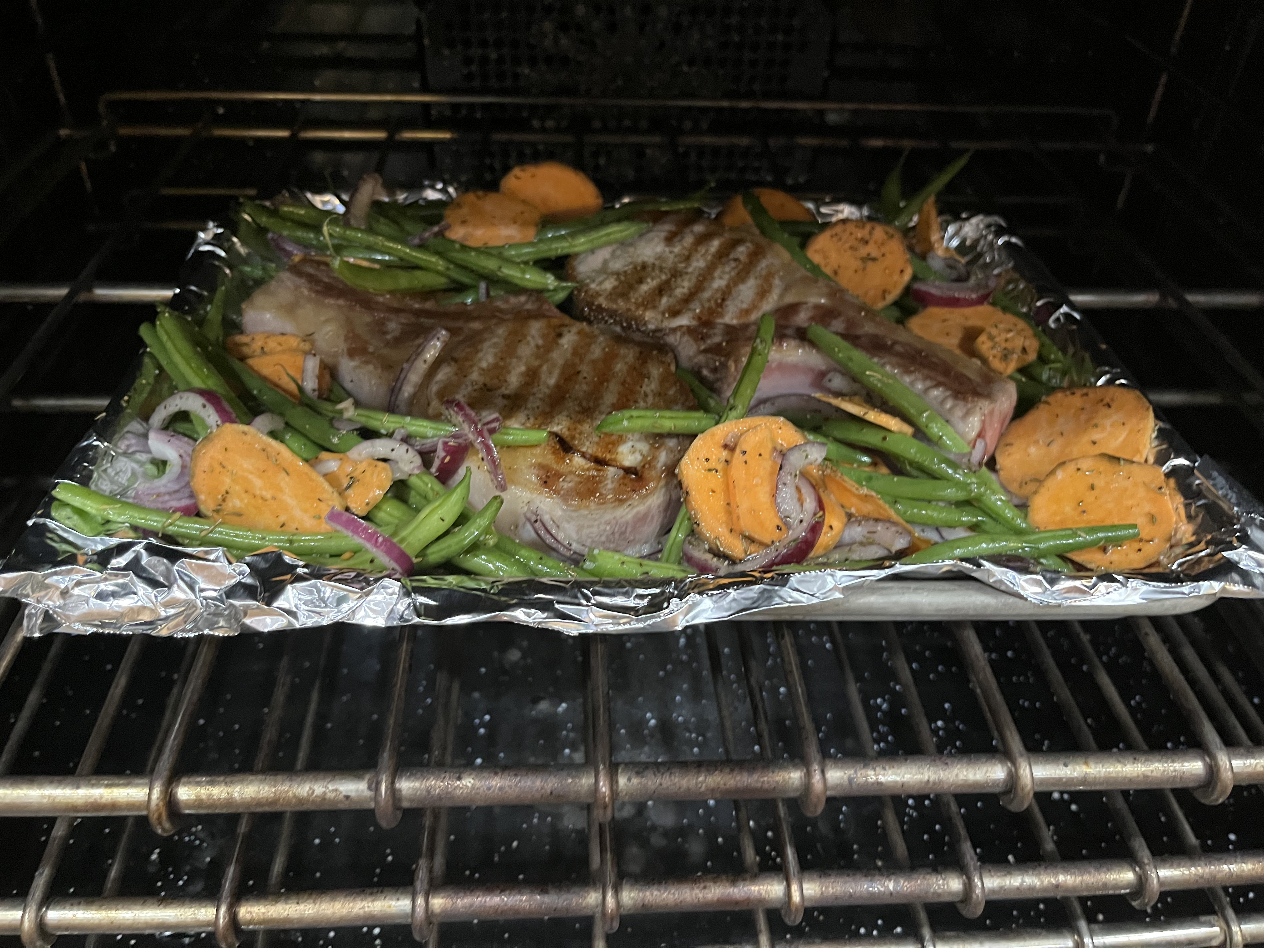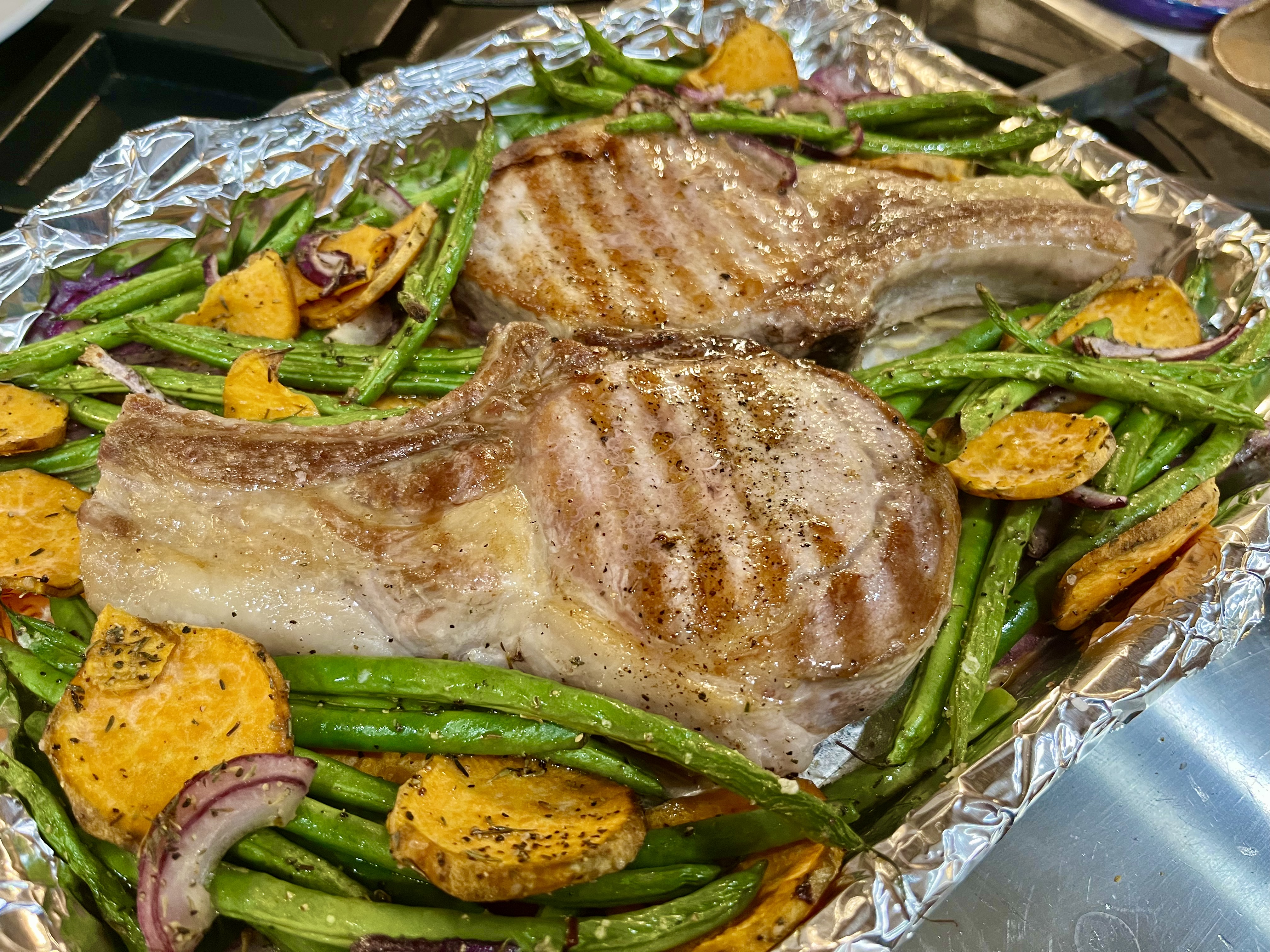 Quarter-Sheet Pan Pork Chop Dinner for Two (with Green Beans and Sweet Potatoes)