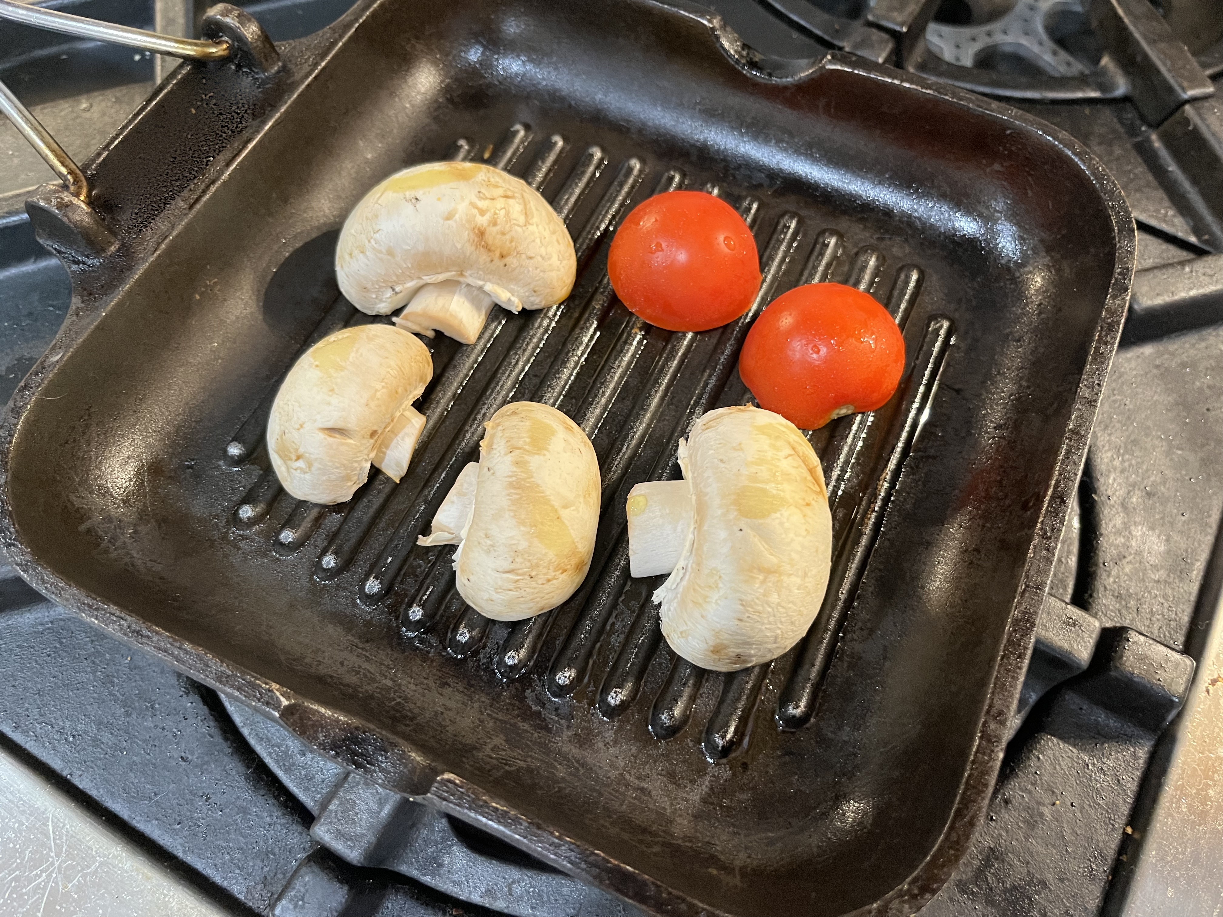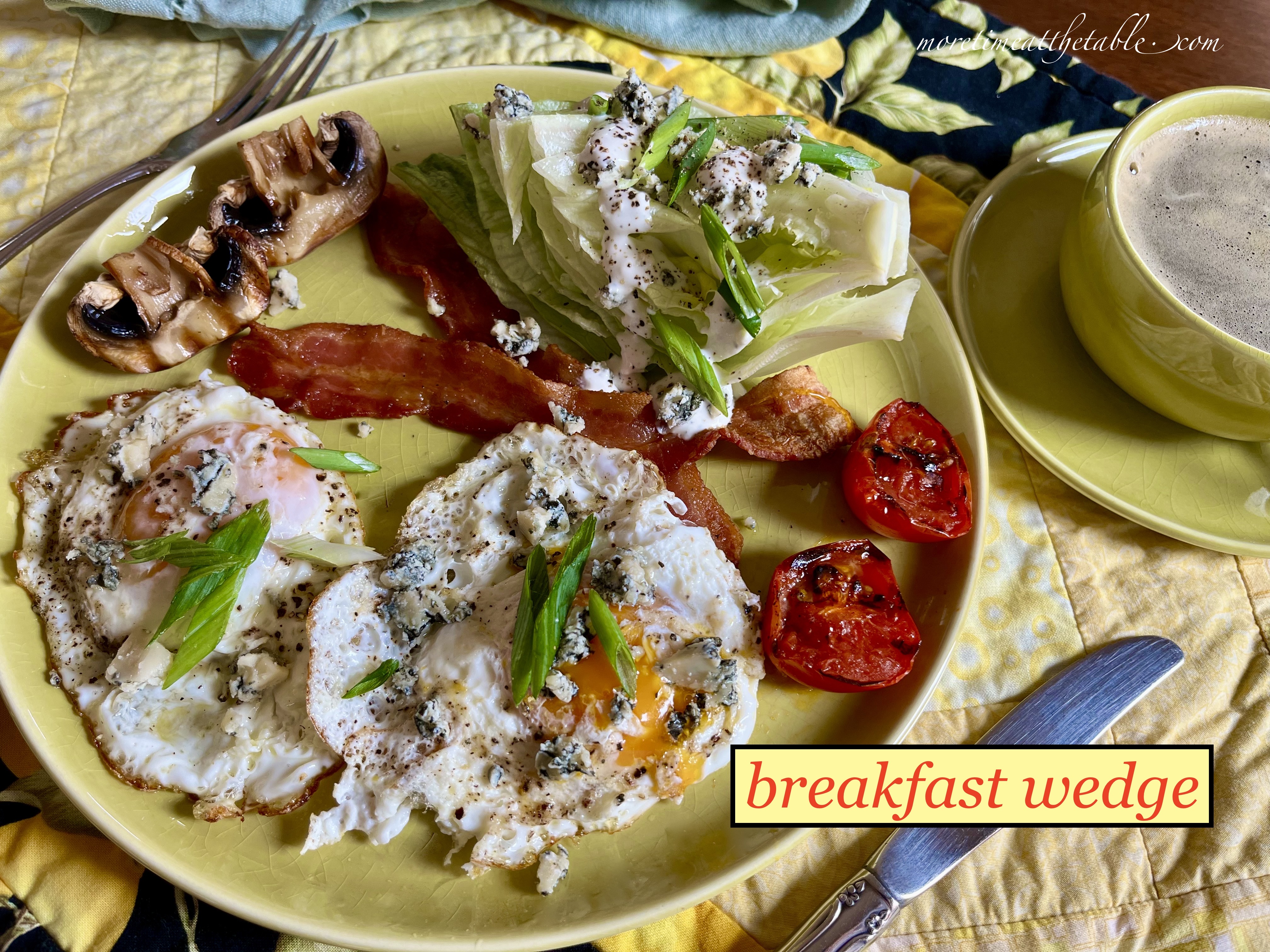 At our house, a wedge salad shows up most often in the good ol’ summertime. One week there’s a run on BLTs and the next, wedge salads begin to appear at the side of grilled burgers or chops. There’s no good reason not have them come winter, but maybe it’s about tomatoes? I would, however, be the first person to tell you homegrown Colorado tomatoes are not so terribly wonderful even in high summer. So, no. They are not Illinois tomatoes, nor are they New Jersey tomatoes. They crack from overwatering or they wait for October snows only to be ushered into the house for a very sad and slow paper bag ripening. Sometimes they’re ready (or rotted) by Thanksgiving. That said, I’ve not a true complaint as I keep a large carton of Campari tomatoes on hand 52 weeks a year. Which is why, once in a happy while during January, a summer-ish wedge makes an appearance on our dinner table, much to my husband’s thrilled amazement and big-eyed wonder. (He’s a big wedge fan because #1 he loves blue cheese and #2 he loves bacon more. If there’s a wedge on a restaurant menu, he’ll order it. Almost always.) And when I was pondering all of this the other day, ready for our January splurge, I wondered why we couldn’t have a wedge for breakfast? I love eggs with any vegetables; you might remember. I mean, nearly everyone eats Huevos Rancheros with lettuce and tomato, don’t they? Some breakfast tacos come with shredded lettuce and tiny diced tomatoes, too. What about veggie benedicts? Our favorite breakfast place serves a ton of salads with fried eggs, or avocado toast, or omelets. And anyway, bacon — a main wedge ingredient — is for sure breakfast food. So why not a BREAKFAST WEDGE? A nice hunk of blue-cheesy lettuce and some lacy fried eggs. Really crisp bacon. I couldn’t stop thinking about the idea. Maybe a side of UK grilled mushrooms and tomatoes?