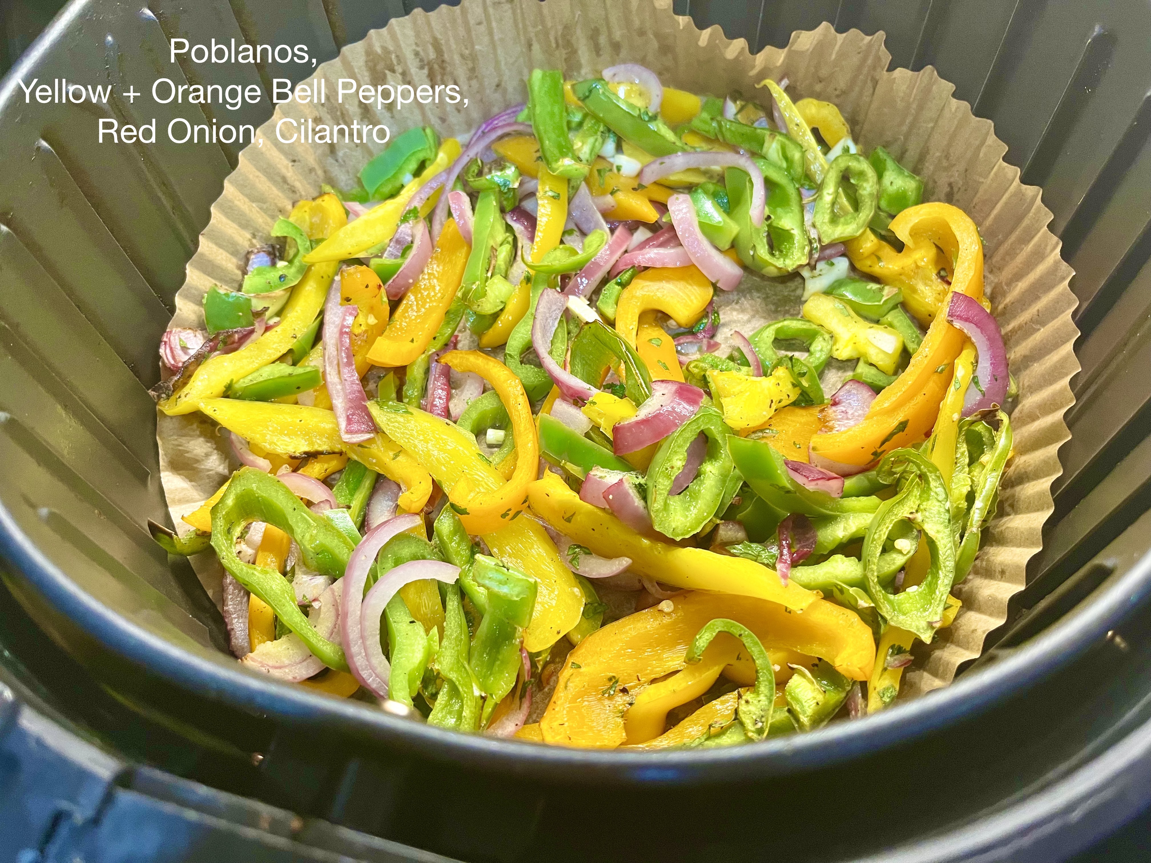 The fajita part of Fish Fajitas is the cooked peppers and onions. Easy to make in a skillet, they’re even easier — no stirring — in the air fryer. Here, I’ve lined the air fryer with some liners I bought at our fine downtown kitchen shop, Sparrow and Hawk, and are a lot like coffee filters though larger. Saves clean up. (You can also use parchment paper. Don’t preheat the air fryer with any liners as they can catch fire. Take my word for it!) Cover them and stick in the oven to keep warm — as long as you’re making your fish in the air fryer and not in the oven. They could certainly be done a day ahead and reheated in the microwave.