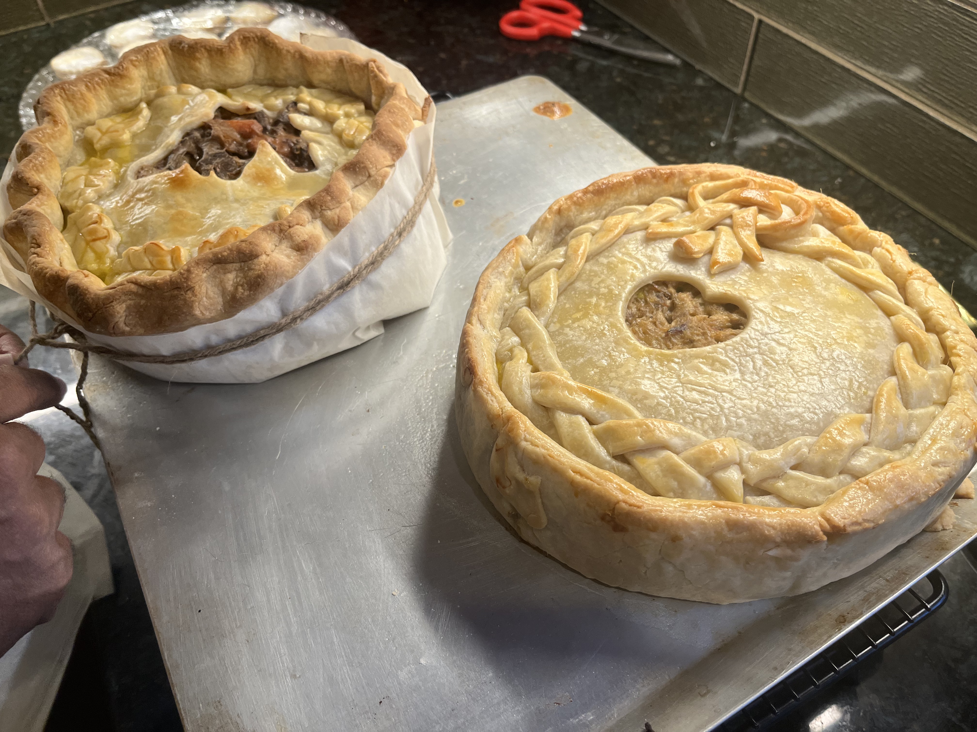 Our Cork Play Wine Group dinner at friends Jerome’s and Chris’ house last weekend included a gorgeous salmon-many ways appetizer from Pam, luscious veggies from Jill and Chris, and (see below) these two stunning savory pies from stellar baker Jerome Carter — elk at left and pheasant at right. Game was provided from Pam’s husband, our personal hunter, Lee Lehmkuhl. WOW! Talk about full and blowing the diet. For the bakers on the blog, these pies were made with hot water dough and baked free form — no pan used, just tied parchment paper.