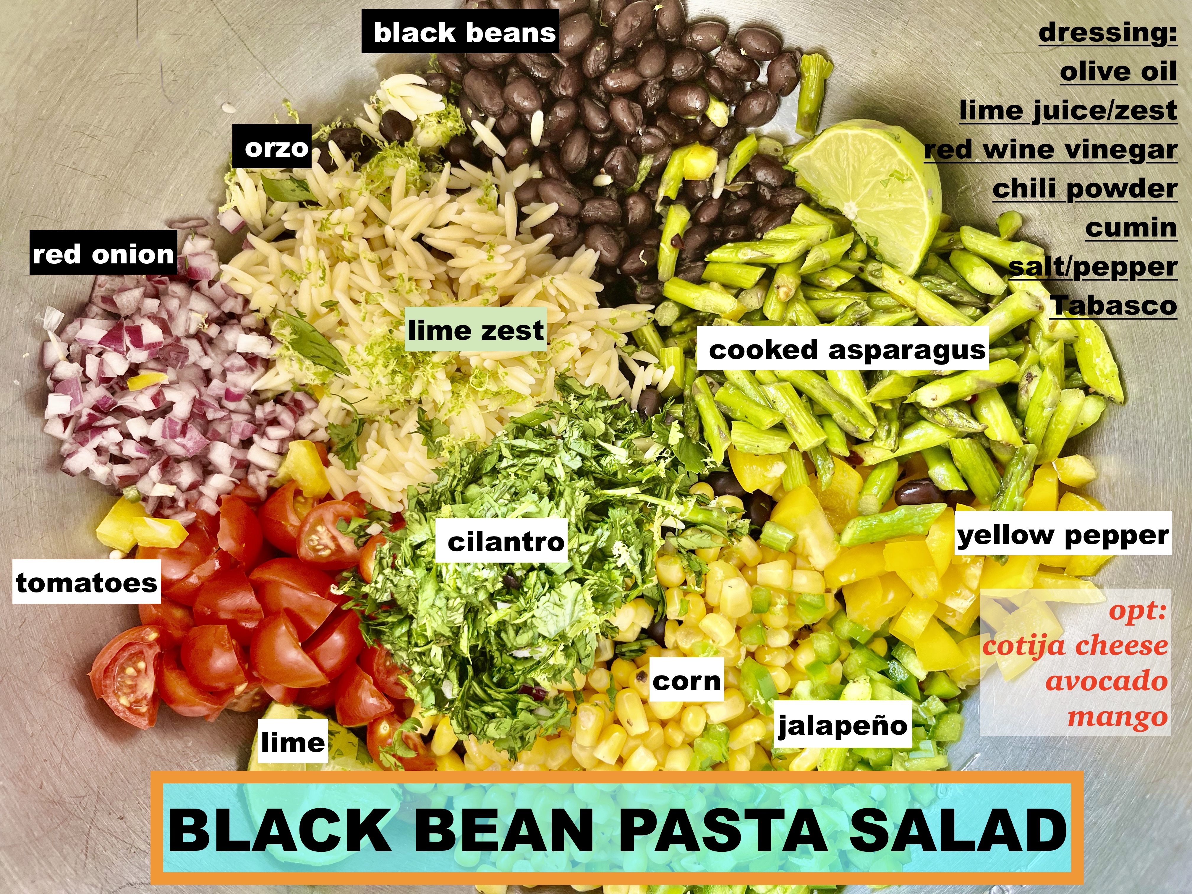 Not having made a black bean salad in a while, I googled up a few versions (many were similar to one another/people love this stuff) but none of them seemed a perfect match. Two felt close, but I wanted my salad to be a little bigger than the basic version, perhaps with the addition of rice or pasta so that it would better satisfy a vegetarian or vegan guest who would be skipping the pork tacos. I settled on whole wheat orzo as 1. I had two bags and 2. It was the right size. For nutritional boost, color, and because it’s in season, I added a cup of sautéed chopped asparagus to the mix but left the remainder of the ingredients fairly simple to deal with as I needed to make over 50 servings. “The larger the party, the simpler the recipe” is my motto. Black Bean Pasta Salad doesn’t require a separate dressing either, everything is mixed together in one bowl–always an elegant solution for keeping things easy. For ideas about adding or changing ingredients, see CHANGE IT UP below the printable recipe.