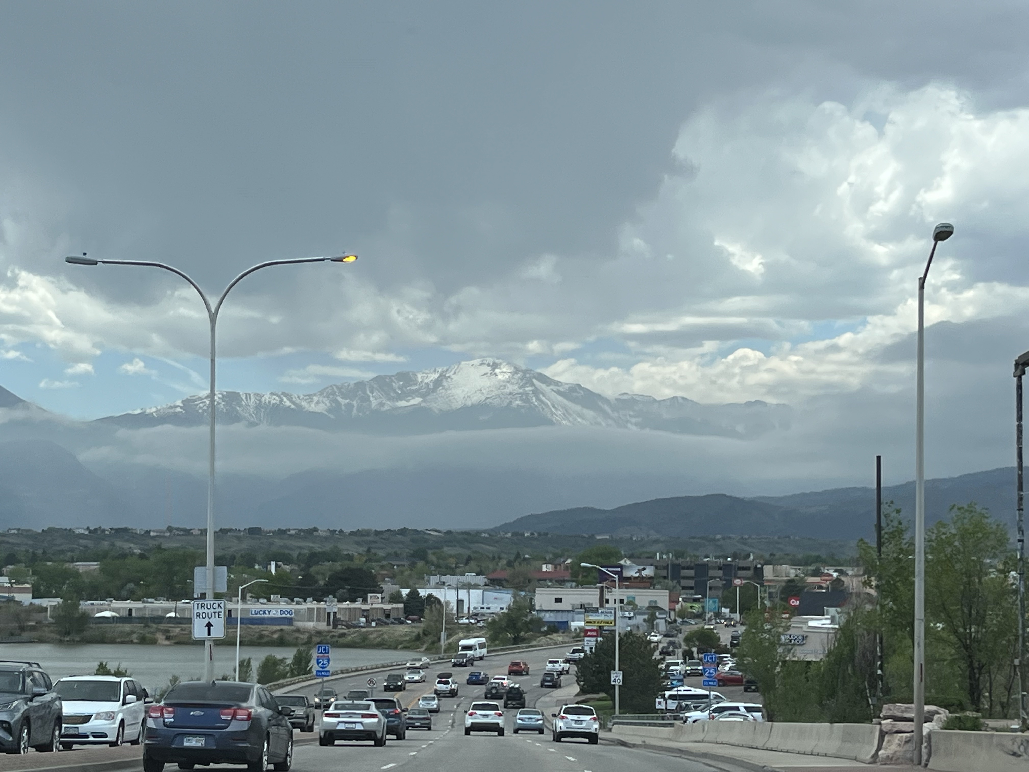 Nearly each week, we make a Costco run and often go out to lunch somewhere close and inexpensive. We have a choice of two routes home and this is one. Here we are heading west on Garden of the Gods Road in Colorado Springs which always has a stunning view of Pike’s Peak. One of the glorious things about America’s Mountain, as it’s called, is its ever-changing nature. You never look up and see it the same way twice. Here, there were “ground” clouds rising and upper clouds descending to frame the top of the peak still full of snow. There are those (many) with better cameras and photographic capabilities–it’s sort of a cult to photograph this mountain around here– but I was the one who snapped a quick pic with the iPhone.