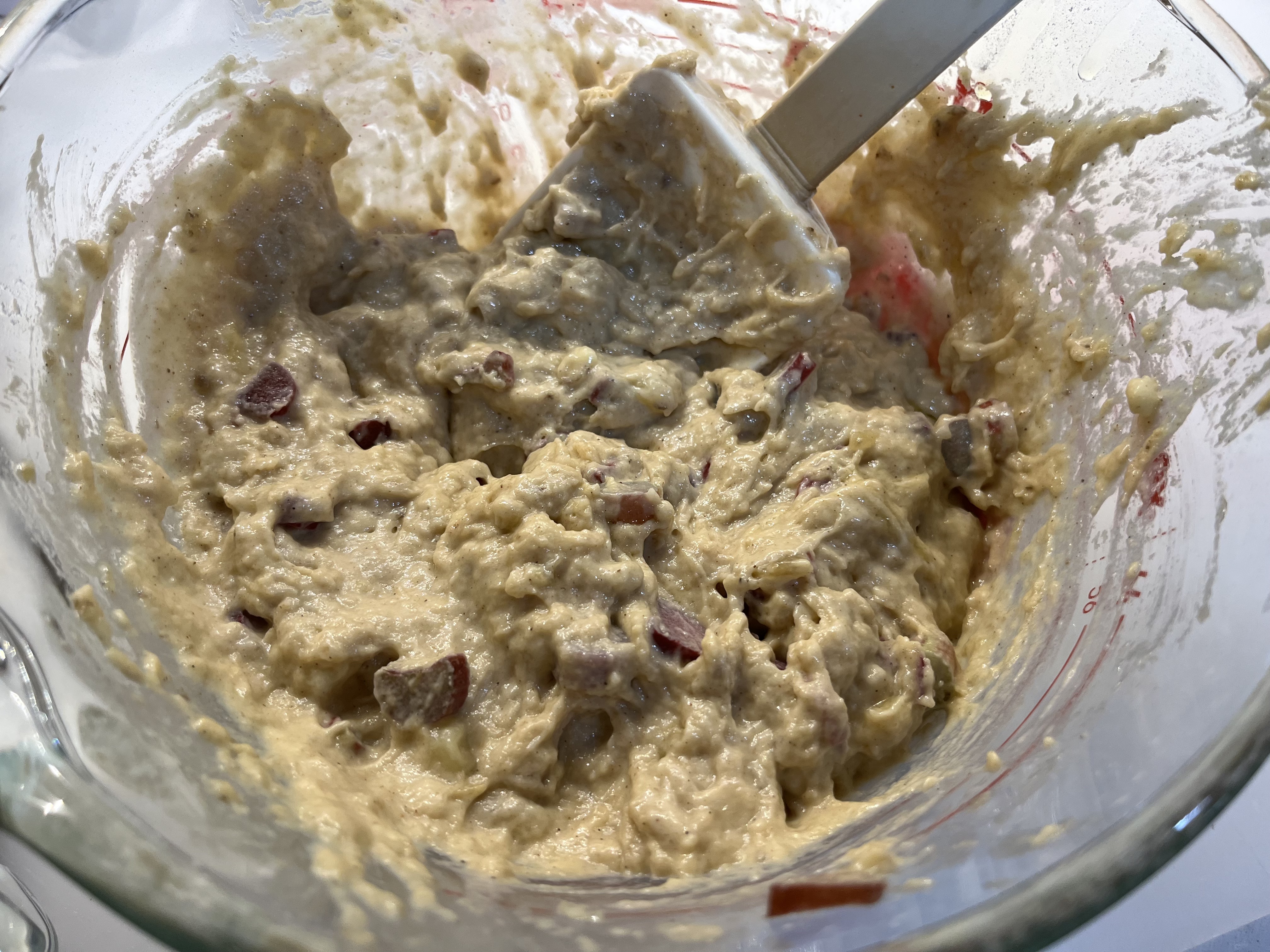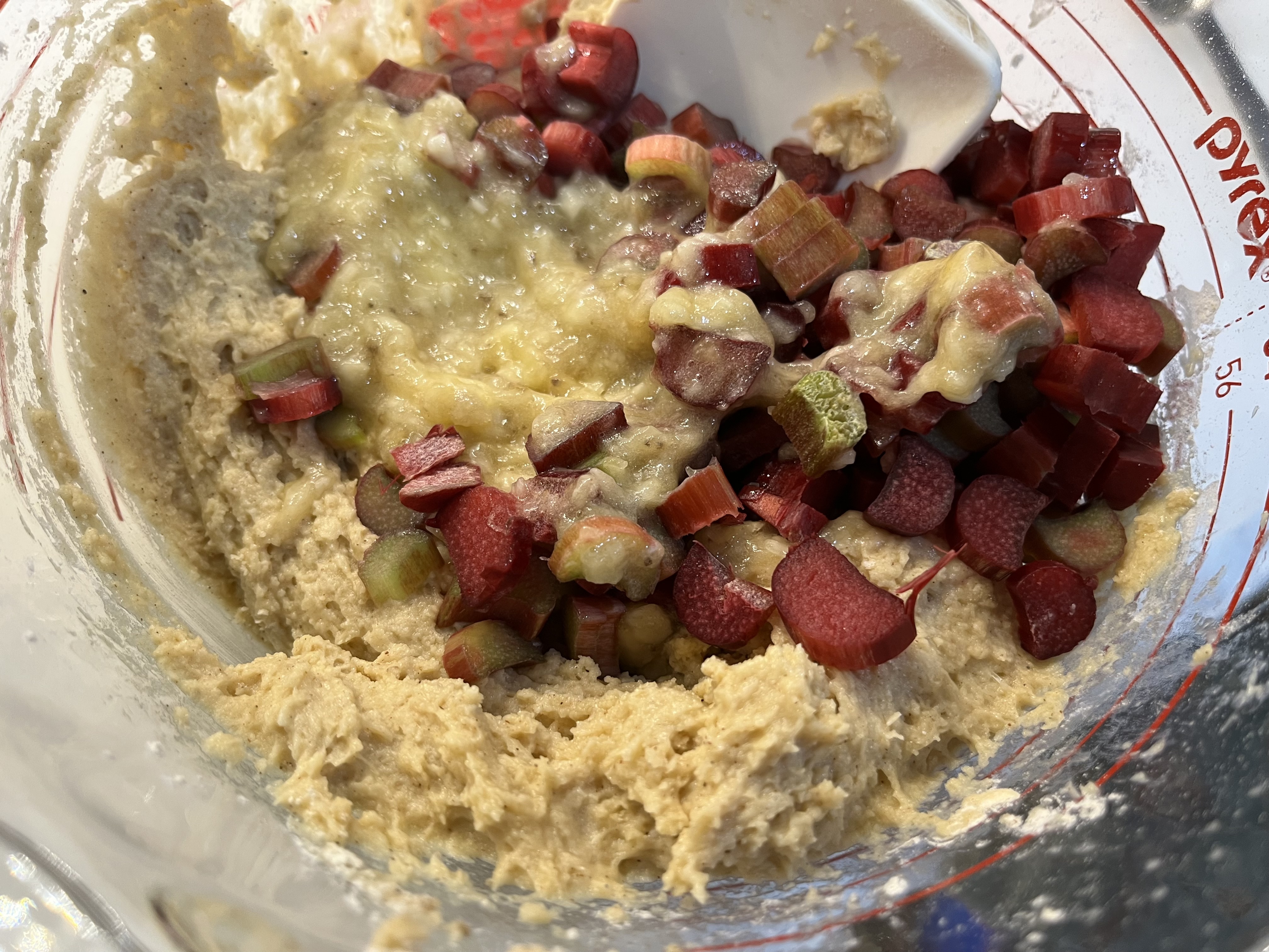 - STIR IN THE RHUBARB AND BANANA. The batter will be quite thick.