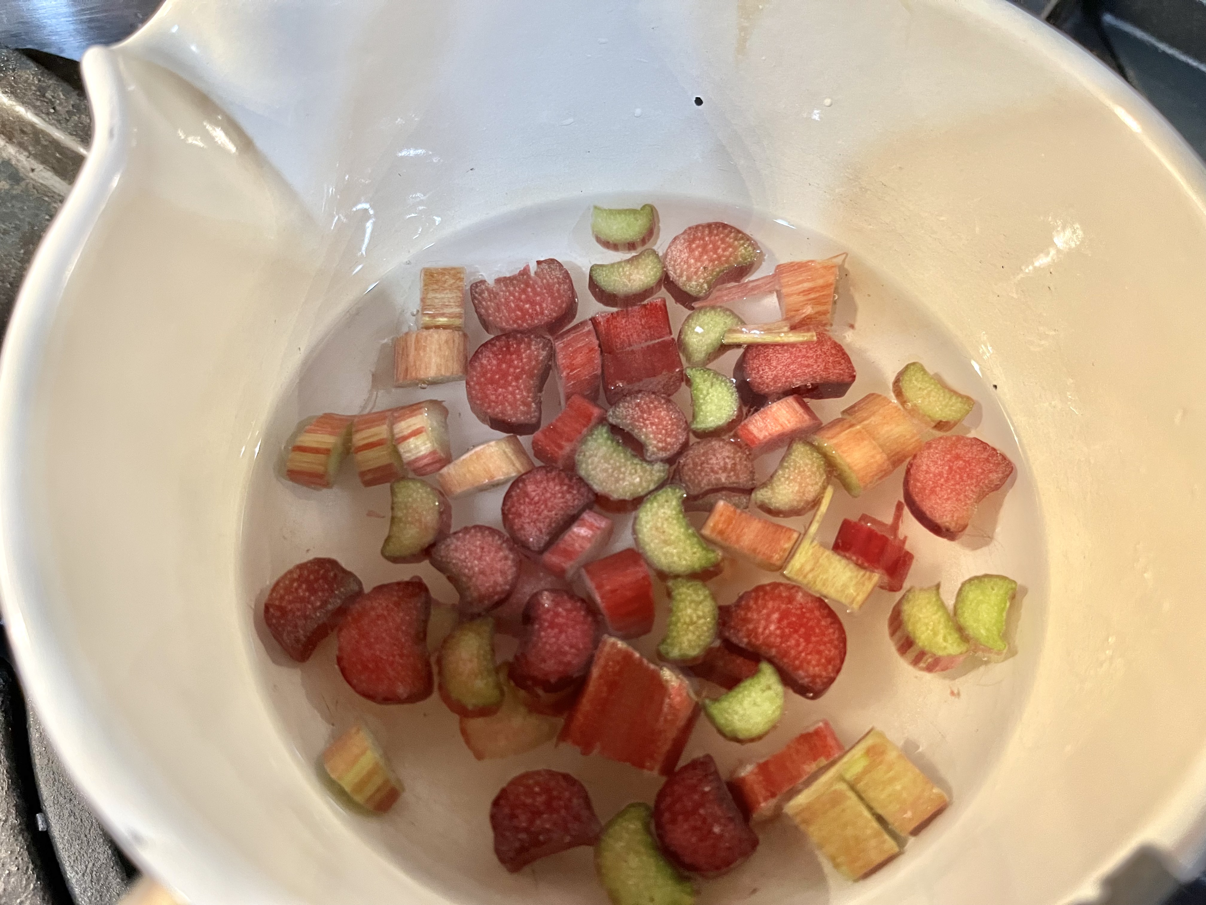 above: Should you have a little extra rhubarb, simmer it in a small pot with water and sugar to taste, until the rhubarb is tender–perhaps 10 minutes. This might be 1/2 cup rhubarb with a tablespoon or two of sugar and water to cover. You can adjust the sweetening after it’s cooked, too. A piece of cinnamon stick cooked along with the rhubarb is tasty, if you like. It’ll then be lovely spooned on top of ice cream, yogurt, or even toast. You can do it with other fruit, too, but other fruit is easy to eat out of hand — isn’t it? Rhubarb isn’t! This is “stewed rhubarb.”