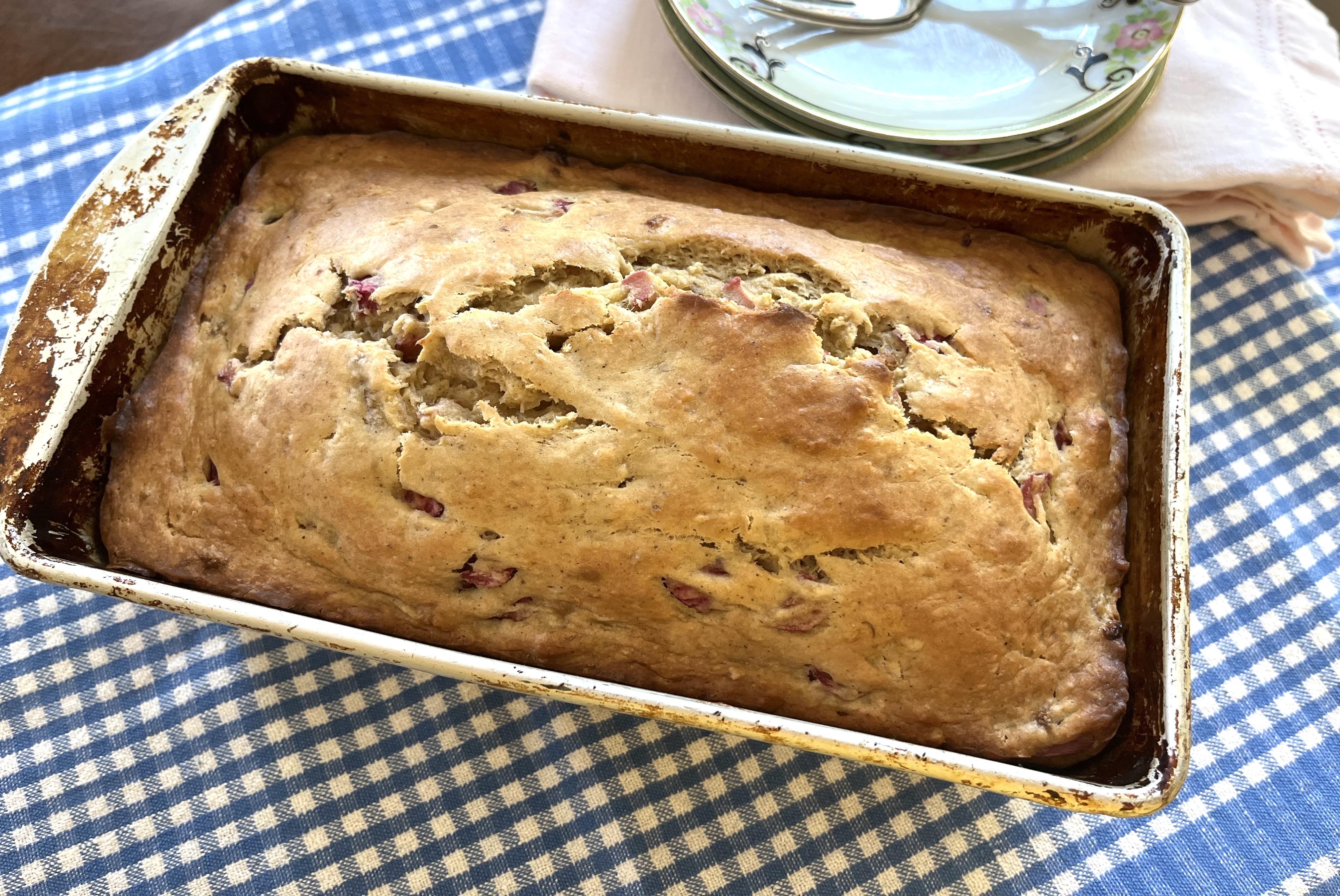 My friend Pam is a multi-talented woman. She enjoys a stunning alto solo voice; cooks like a fiend; entertains largely and comfortably; cultivates a wry wit; is an avid reader; makes a devoted wife, mom, church member, and friend; plays a mean piano, and –the thing I might most envy– is the epitome of organization. What most people don’t know about Miss Pam is she’s also a fine gardener who loves and generously shares the bounty of her craft. While summers here in the front range are late and short with cool nights, she still manages to get a crop or two in each year despite two black Labrador retrievers romping all over her big backyard. Best sous and husband Dave and I are often the recipients of her largesse when the weather warms and the other day Pam’s husband Lee drove over for a visit toting some of her rhubarb along as a gift to us. As rhubarb keeps pretty darned well in the fridge, I didn’t worry about using it quickly. Needing a snack on the not-too-sweet side yesterday, though, I soon heard that rhubarb calling my name, whispering, “bake, bake, bake…” and pulled it out to see just exactly how much she’d sent. To be on the safe side, I chopped it up and measured it to find I easily had a cup plus. Not enough for a pie or a cobbler, there was plenty for a simple cake or quick bread if I included another fruit in the mix. With a side-eyed sniff at the counter, it was apparent the partner needed to be bananas. Then again, I’d never heard of rhubarb and bananas. You? Turns out: It’s a match made in heaven.