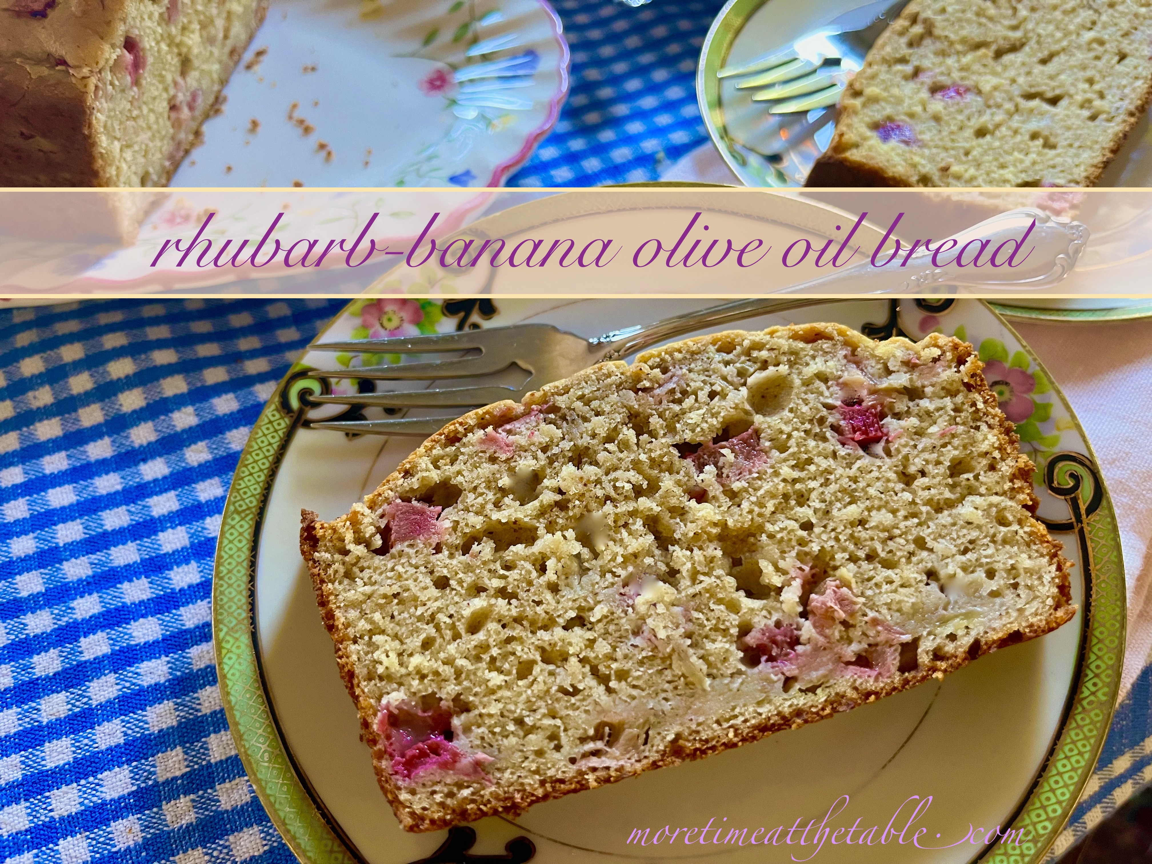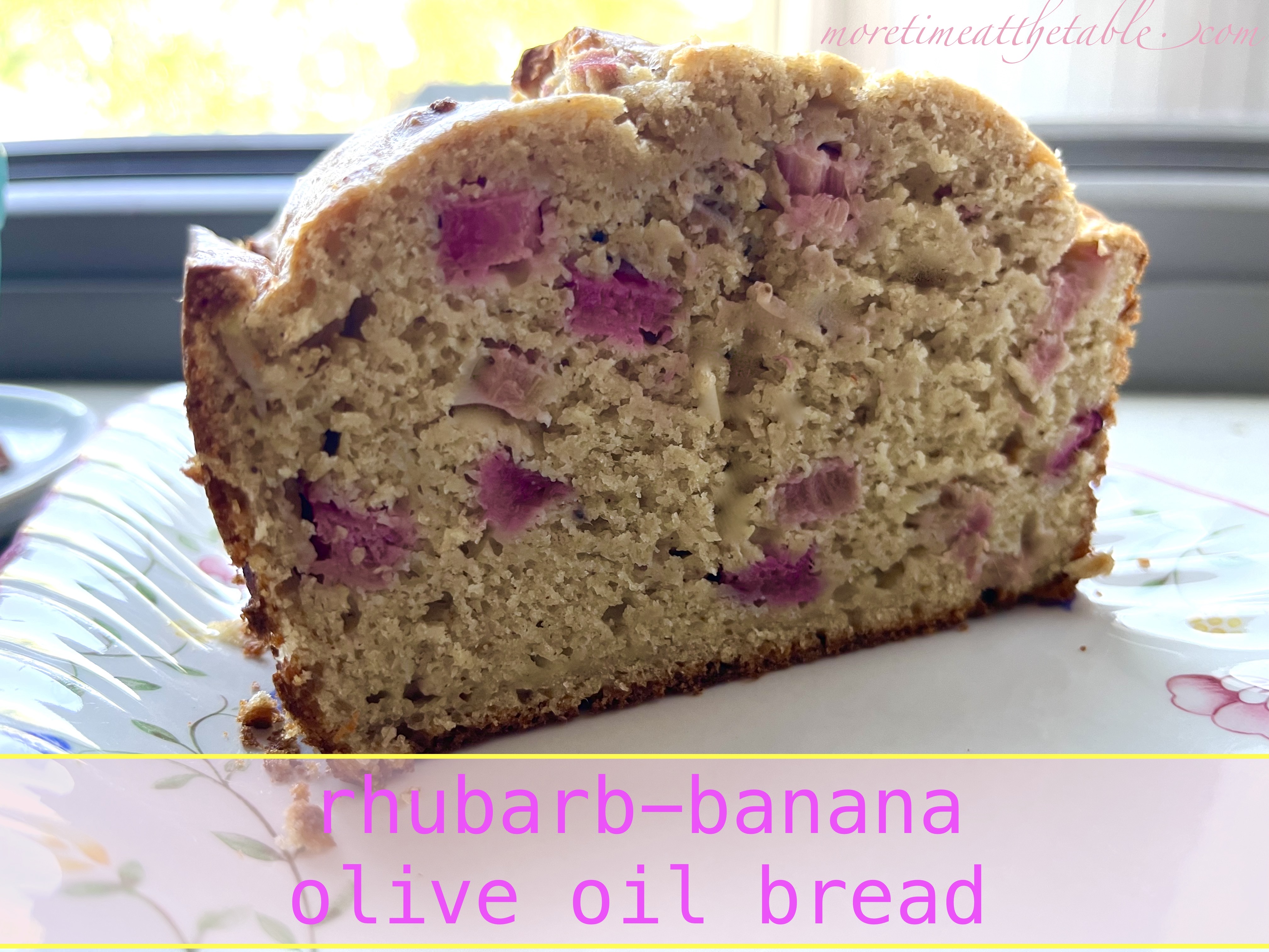 When Pam’s rhubarb sang its tart song, my mind did go straight to strawberries again. I mean, that’s the go-to for rhubarb marriage, right? And I had big, ripe strawberries in the fridge. Those berries were ready, willing, and able. But I was about to have to pitch or freeze the dark and increasingly fragrant bananas, so they instead headed up the list of unusual suspects much to my later happiness. We’re on a low fat diet for a couple of weeks around here (doctor’s orders for best sous and husband Dave) and Sabrina’s 9×5 loaf cake only called for 1/2 cup of fat — and it was olive oil, all the better for increasing health. I’m a big butter baker but when I need to, I’ll run fast with olive oil.