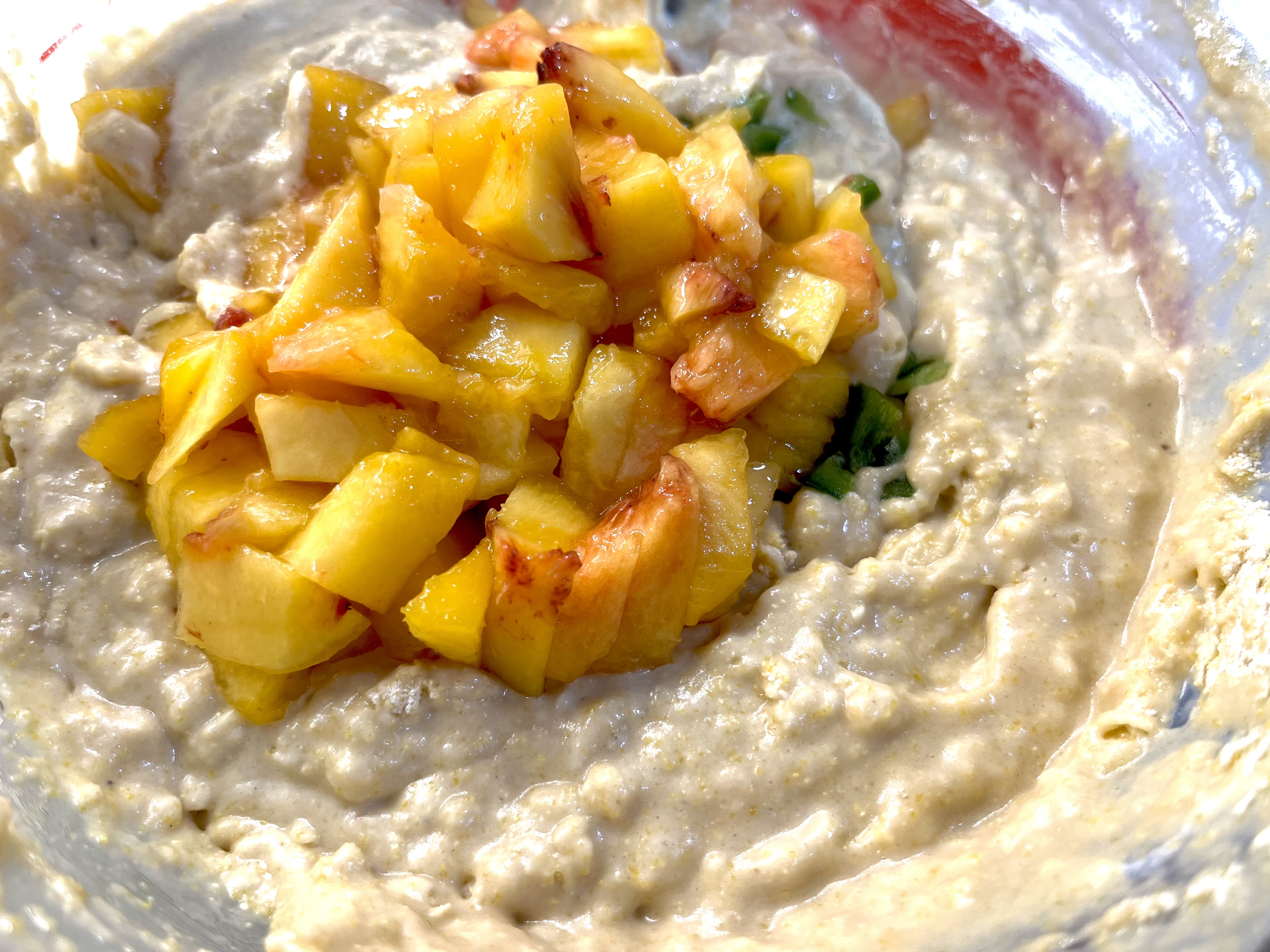 - STIR TOGETHER THE WET AND DRY INGREDIENTS; ADD PEACHES + JALAPEÑO: Pour the wet ingredients (sour cream mixture) into the dry ingredients (flour mixture), along with the peaches and jalapeño. Stir until just combined.