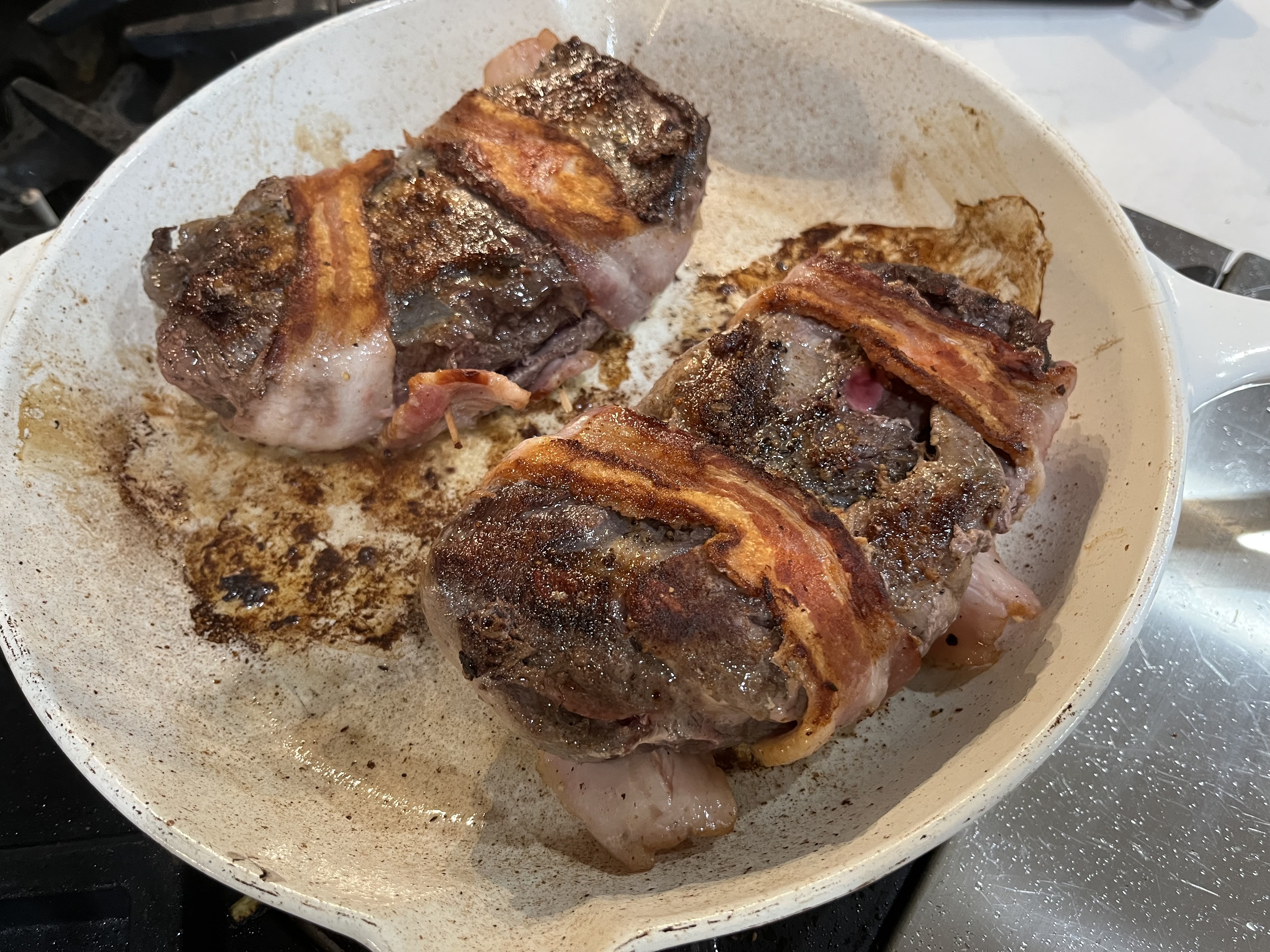 - PREP AND COOK THE GOOSE BREASTS: Preheat the oven to 300 ° F. Set rack at center. Sprinkle goose breasts all over lightly with salt and pepper and wrap each in two pieces of bacon, securing with four toothpicks on each breast. (Remember how many toothpicks you used!) Heat a large oven-proof skillet over high flame and add breasts to dry pan. Brown well on both sides. Place in oven for 20-25 minutes or until instant read thermometer reads about 160 °F. Remove to cutting board. Let rest for 2-3 minutes. Reserve drippings on cutting board (if you have some) and drizzle on goose while plating. Remove toothpicks. Slice thinly. Cover and place on stovetop to keep warm if sauce isn’t done yet. (Warm plates/shallow bowls in oven as possible.)