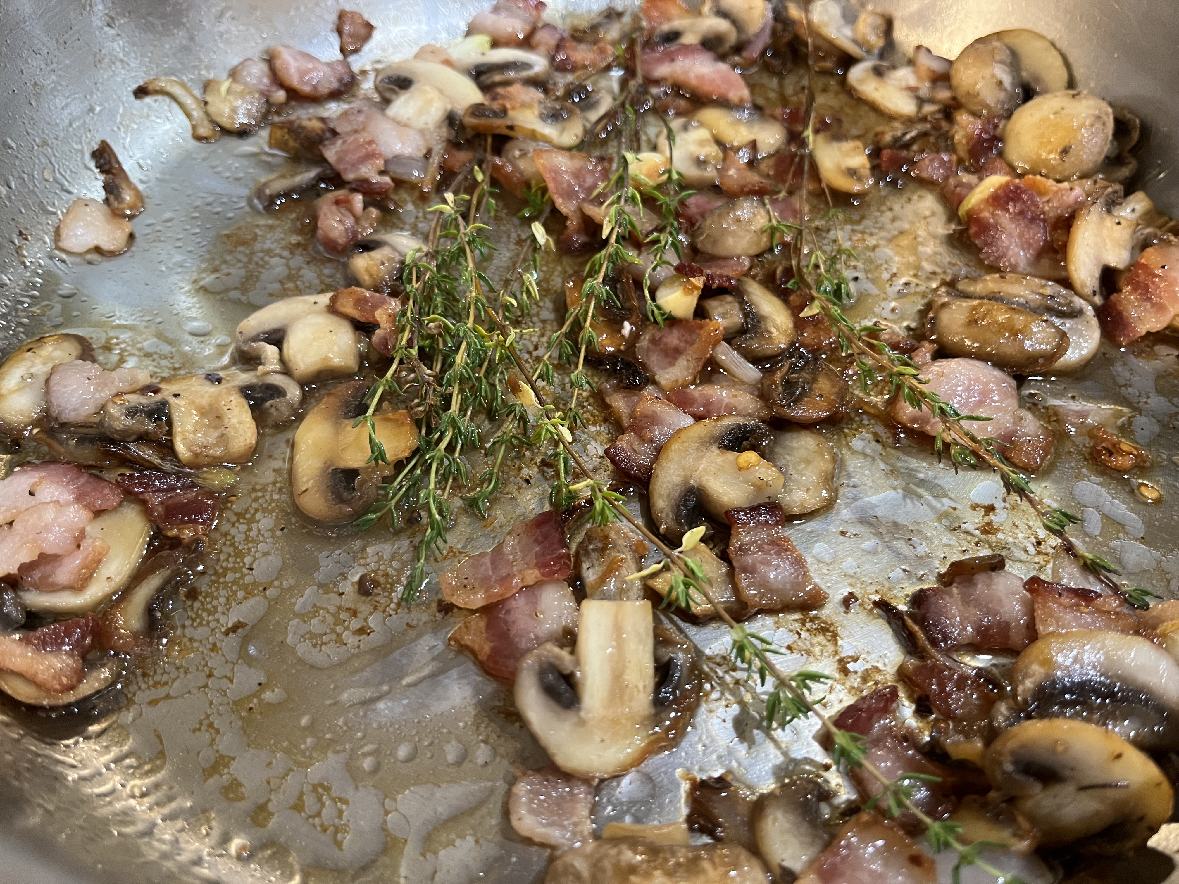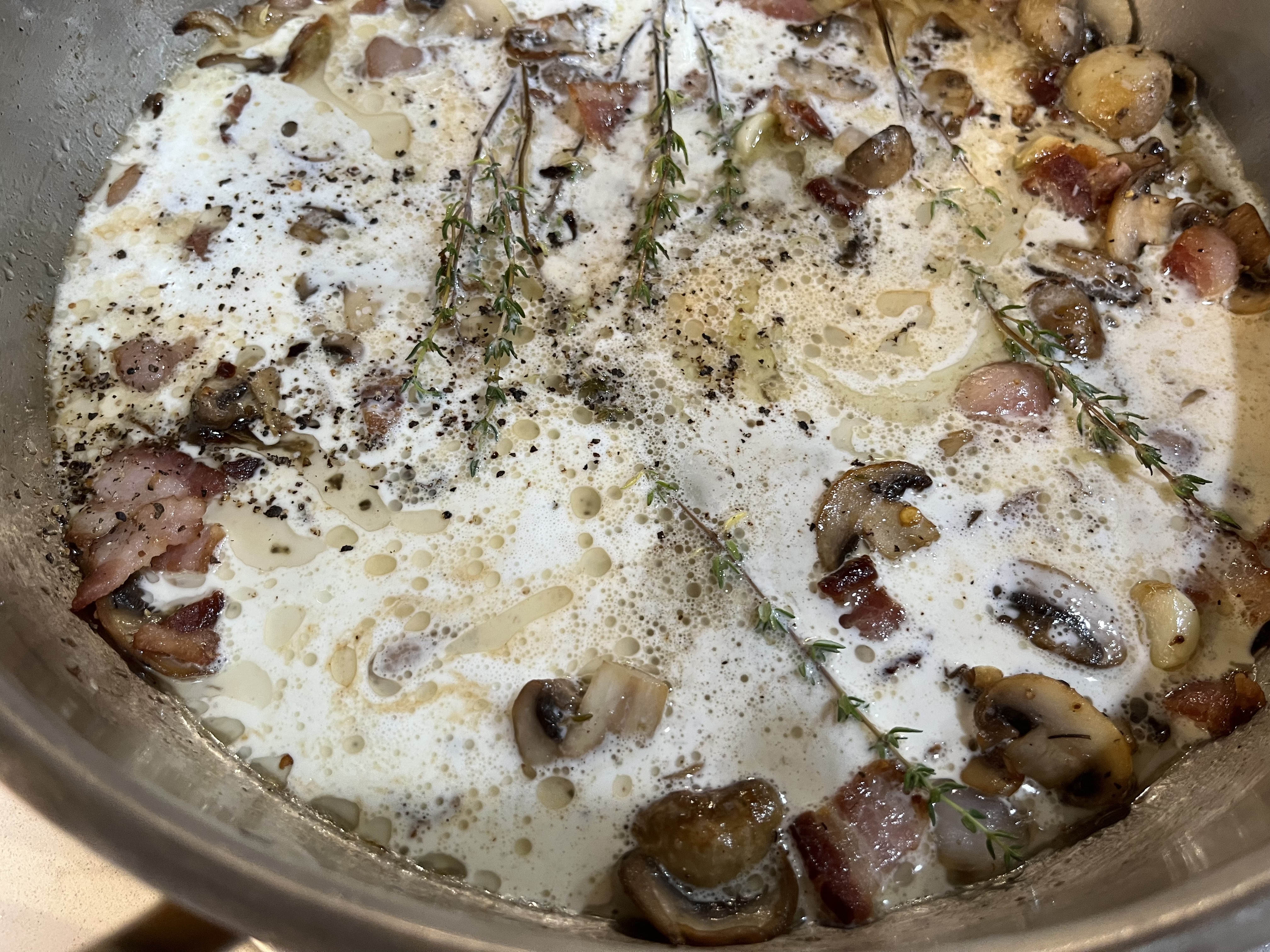- MEANWHILE, MAKE THE BACON-MUSHROOM SAUCE: In a large skillet over medium flame, cook the diced bacon with the mushrooms and thyme sprigs until the bacon is crisp and the mushrooms tender. Stir in the shallot, garlic, and a pinch of crushed red pepper. Pour in the brandy and simmer until the brandy is reduced by half. Pour in the stock and cream. With a table fork, mash the butter and the flour. Sprinkle into the sauce and heat gently, stirring a time or two, until thickened. Remove thyme sprigs. Taste and season to taste with salt and pepper. Remove from heat. If goose is not yet done, cover to keep warm or reheat gently when needed. When seasoning this sauce, remember it will go over a larger amount of food it will need to flavor; you may want to increase the salt and pepper a bit extra to compensate just as you would for gravy and mashed potatoes. Or try a sample and see what you think. You can also pass the salt and pepper at the table if needed.