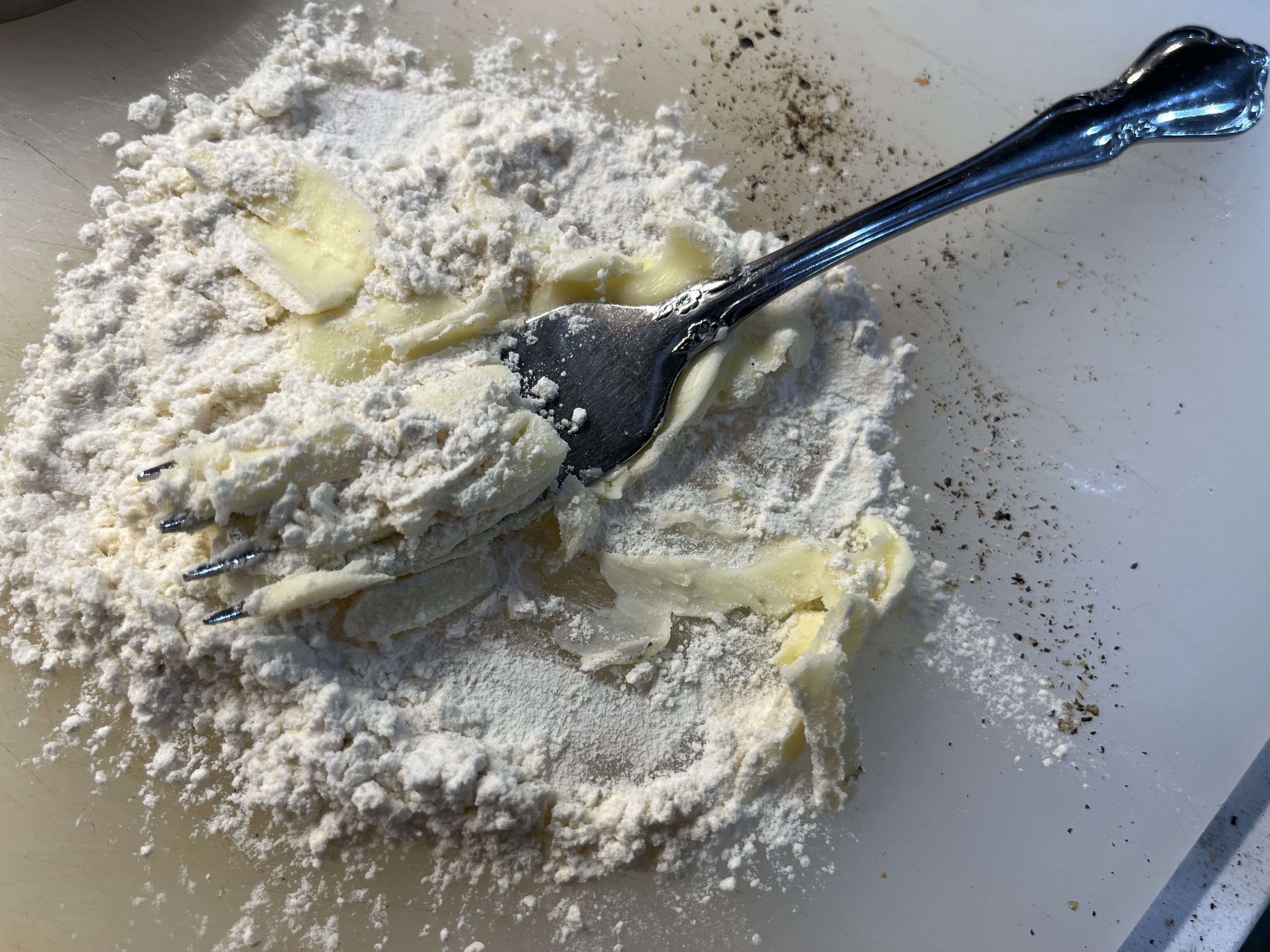WHAT’S A BUERRE MANIÉ (bur man-yay) or kneaded butter? You know how to thicken a sauce or gravy or stew with flour or corn starch or maybe with roux, but a buerre manié is a bit different. Mash up equal amounts of softened butter and flour and stir it into a simmering sauce. In a minute or two, et voila! A beautiful thickening occurs. Serve it up right then, though; the thickening doesn’t keep forever. I like it for two reasons: 1. it tastes good and 2. you can do it at the last minute as a saving grace to thicken up and make silky any sauce or soup or stew. Pronounce it here.