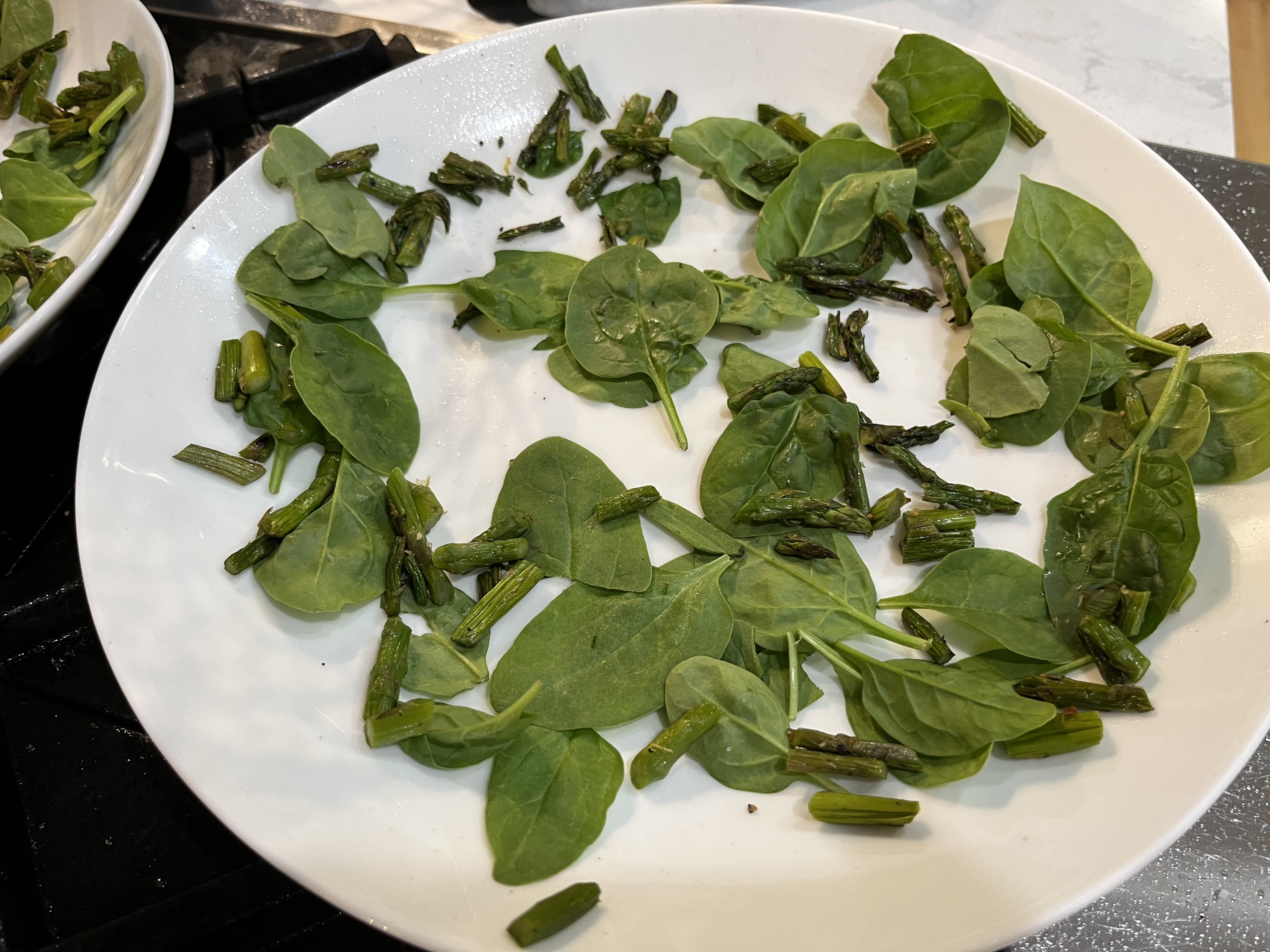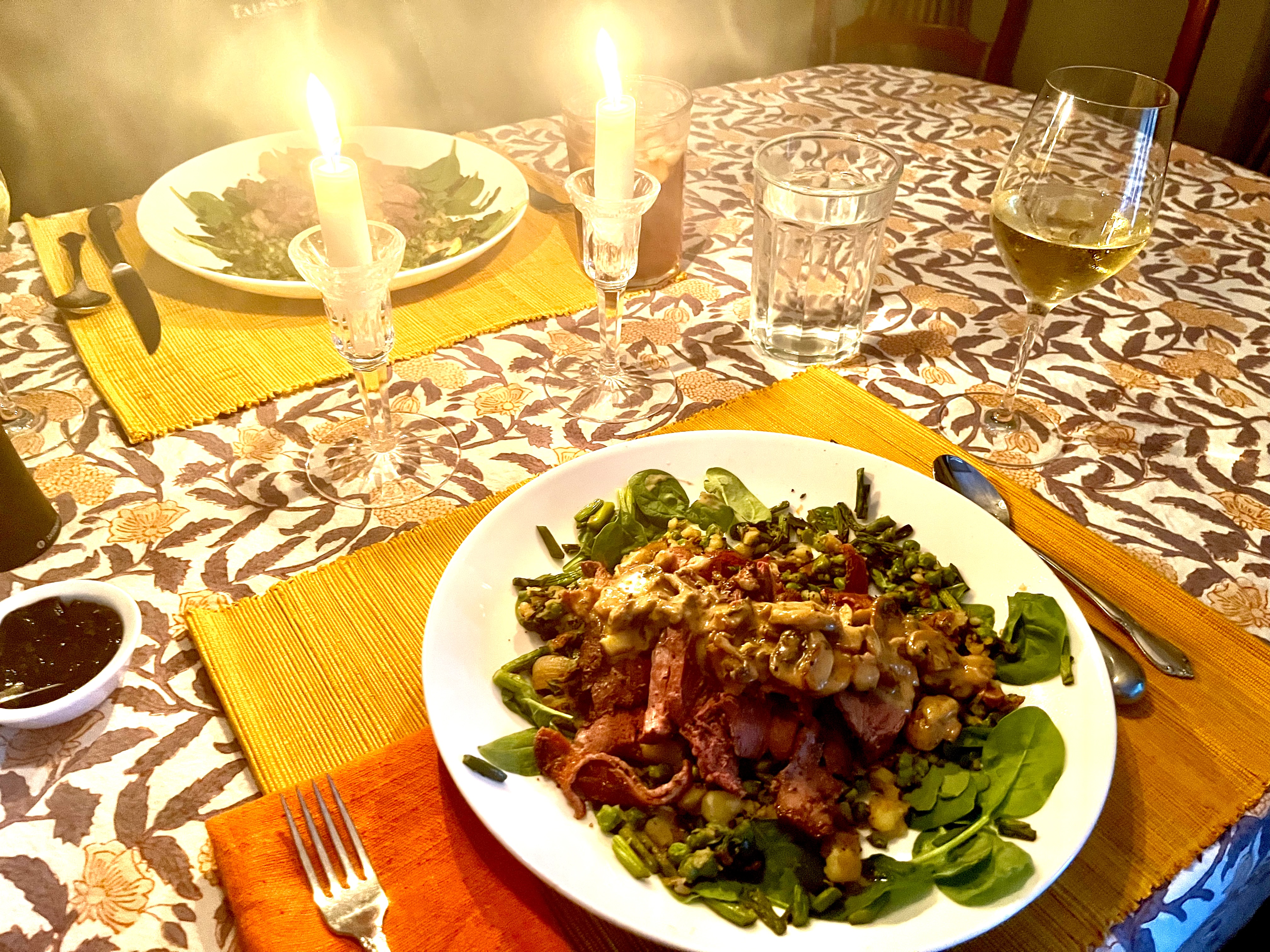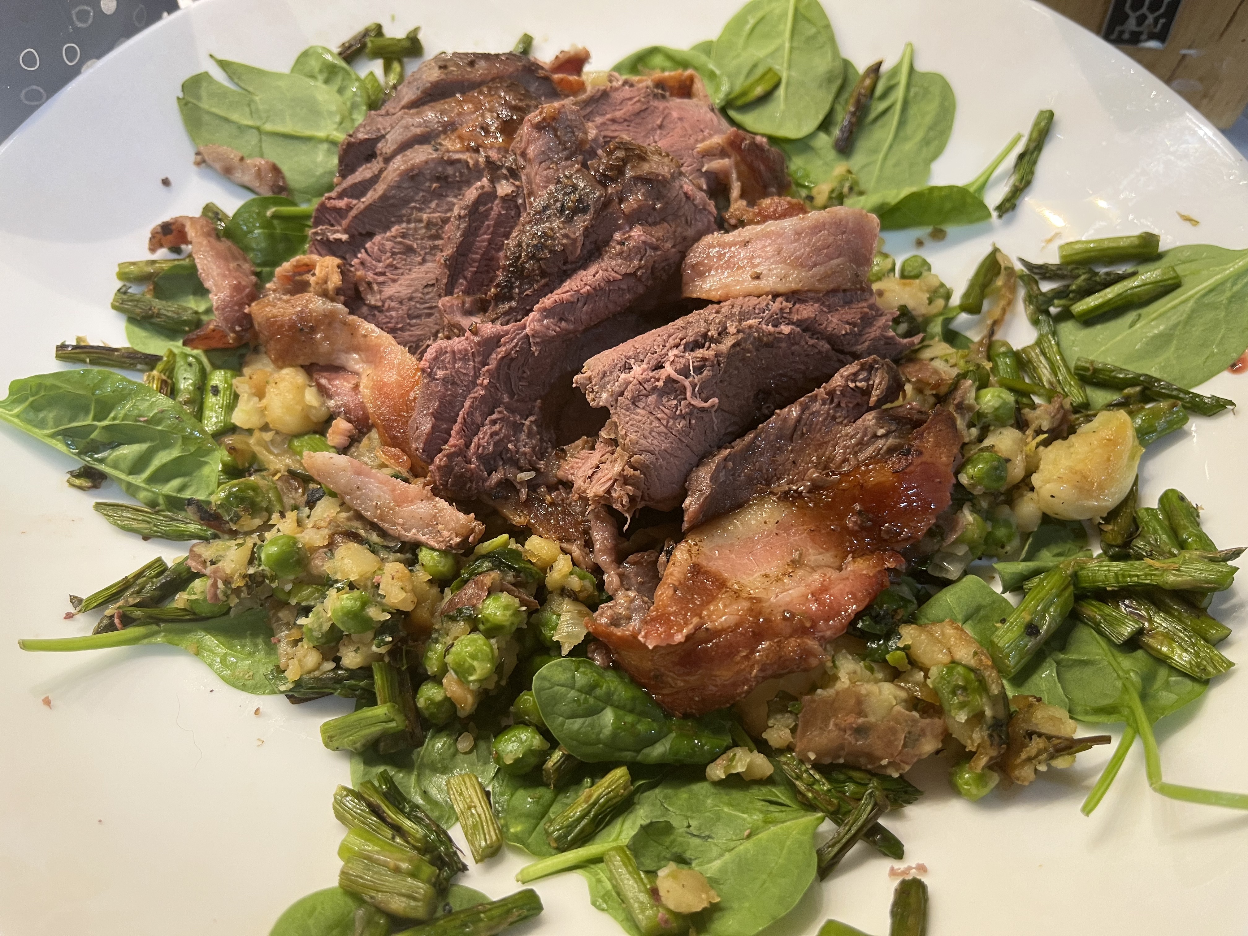 - PLATE AND SERVE HOT or warm: Add a cup of spinach leaves in a circle or at edge to each plate. Sprinkle very lightly with salt and pepper. Spoon smashed potatoes and peas into the center. Fan sliced goose breast over the potato mixture (add drippings if you have some) and ladle the bacon-mushroom sauce over the goose and bacon. Serve with currant jam at the table.