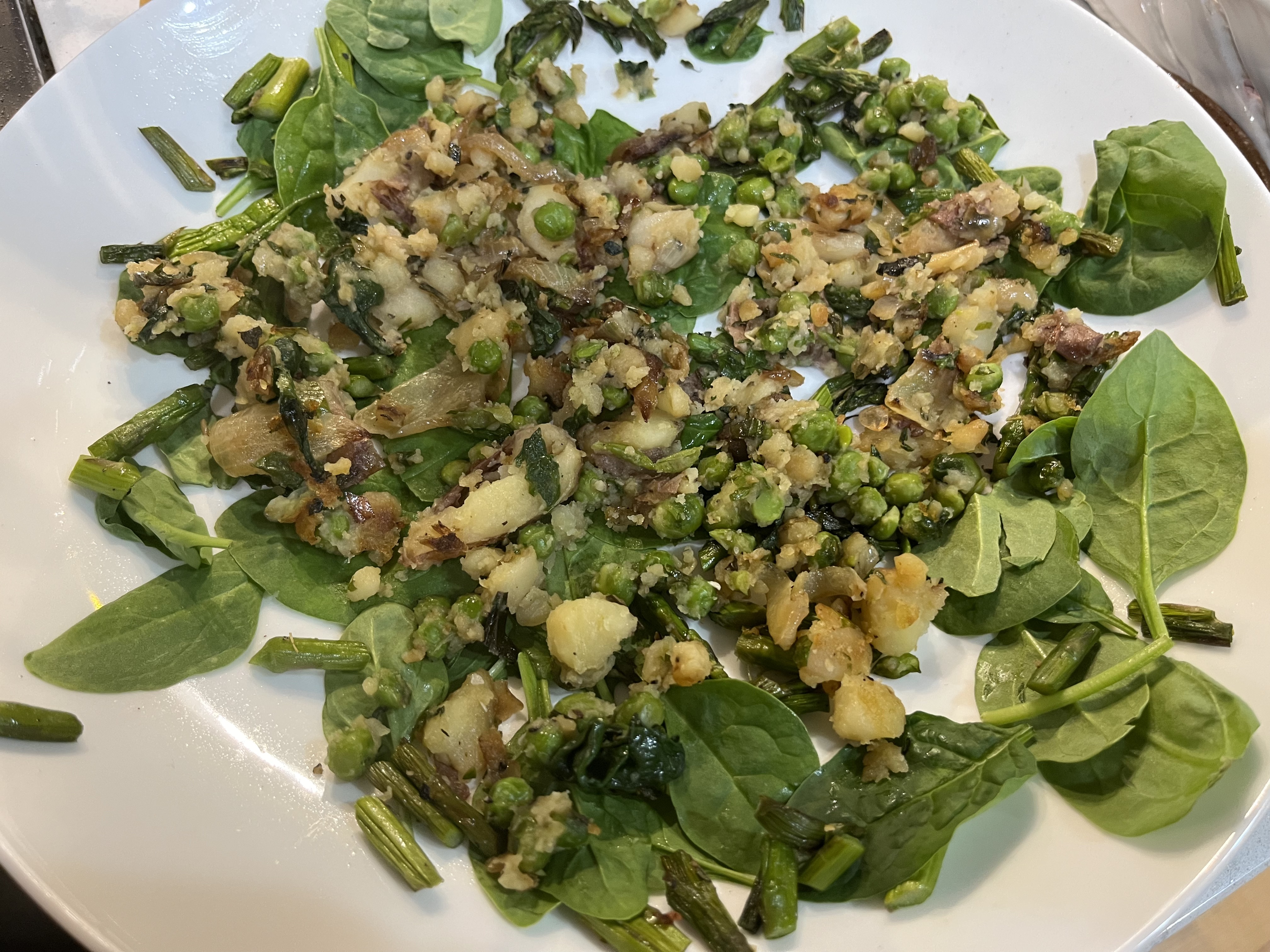 - ADD THE POTATOES TO A 4 OR 6-QT POT, cover them with water plus an inch or two, and add a teaspoon of kosher salt, half-teaspoon of pepper, and a pinch of crushed red pepper. Cover, bring to a boil, reduce to simmer, and cook uncovered until nearly tender—about 20 minutes. Add the peas (fresh or frozen) for the last few minutes. With a slotted spoon, skim off the peas into a cup. Drain the potatoes, return them to the pot, stir in a tablespoon of olive oil, and mash briefly. Add the peas back in, cover, and set aside.