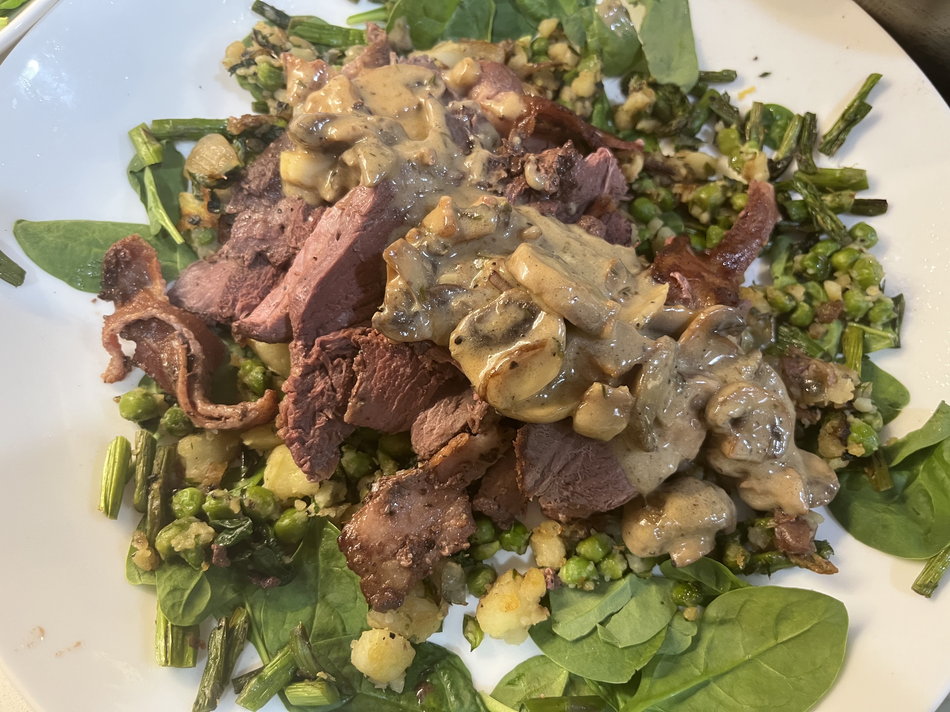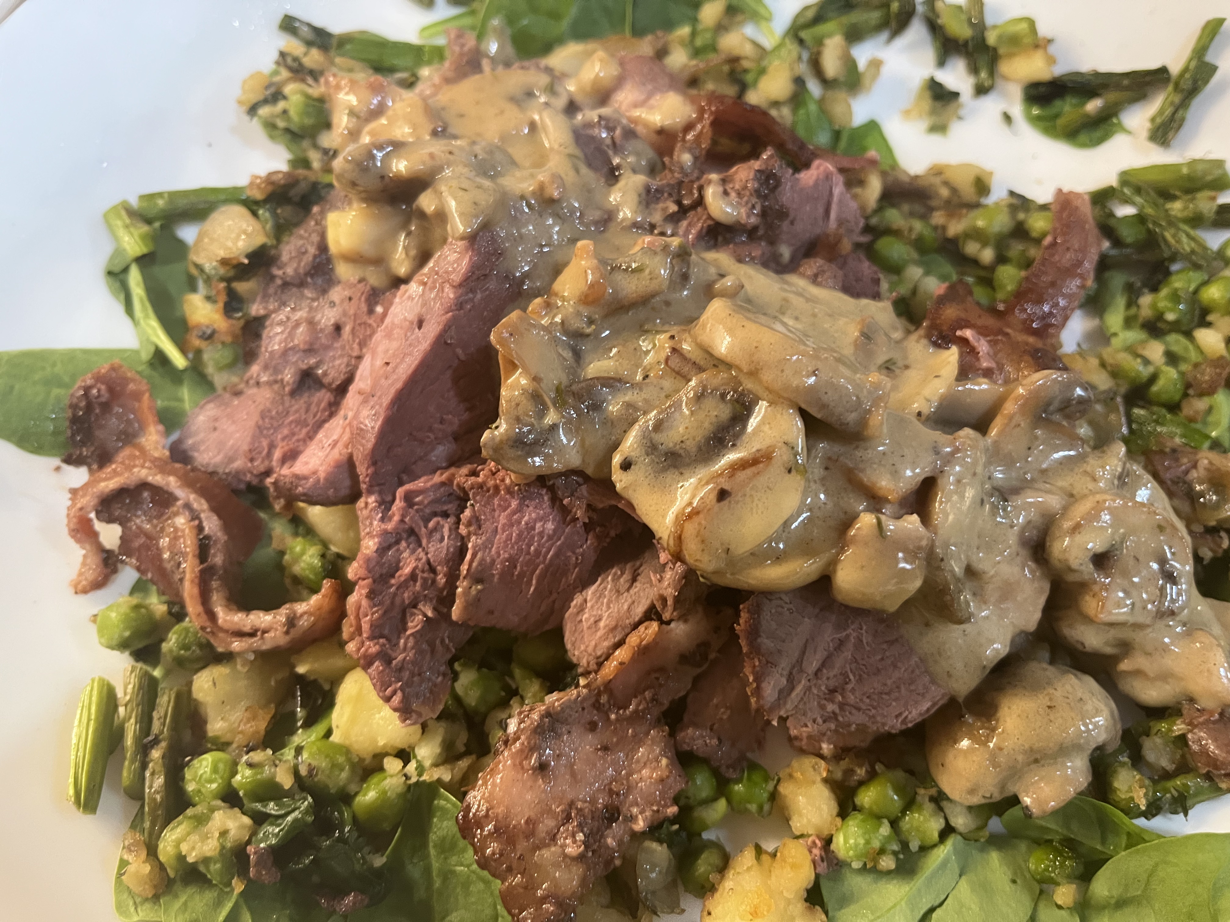 Wild Goose Breast on Smashed Potatoes and Peas with Bacon and Mushroom Sauce