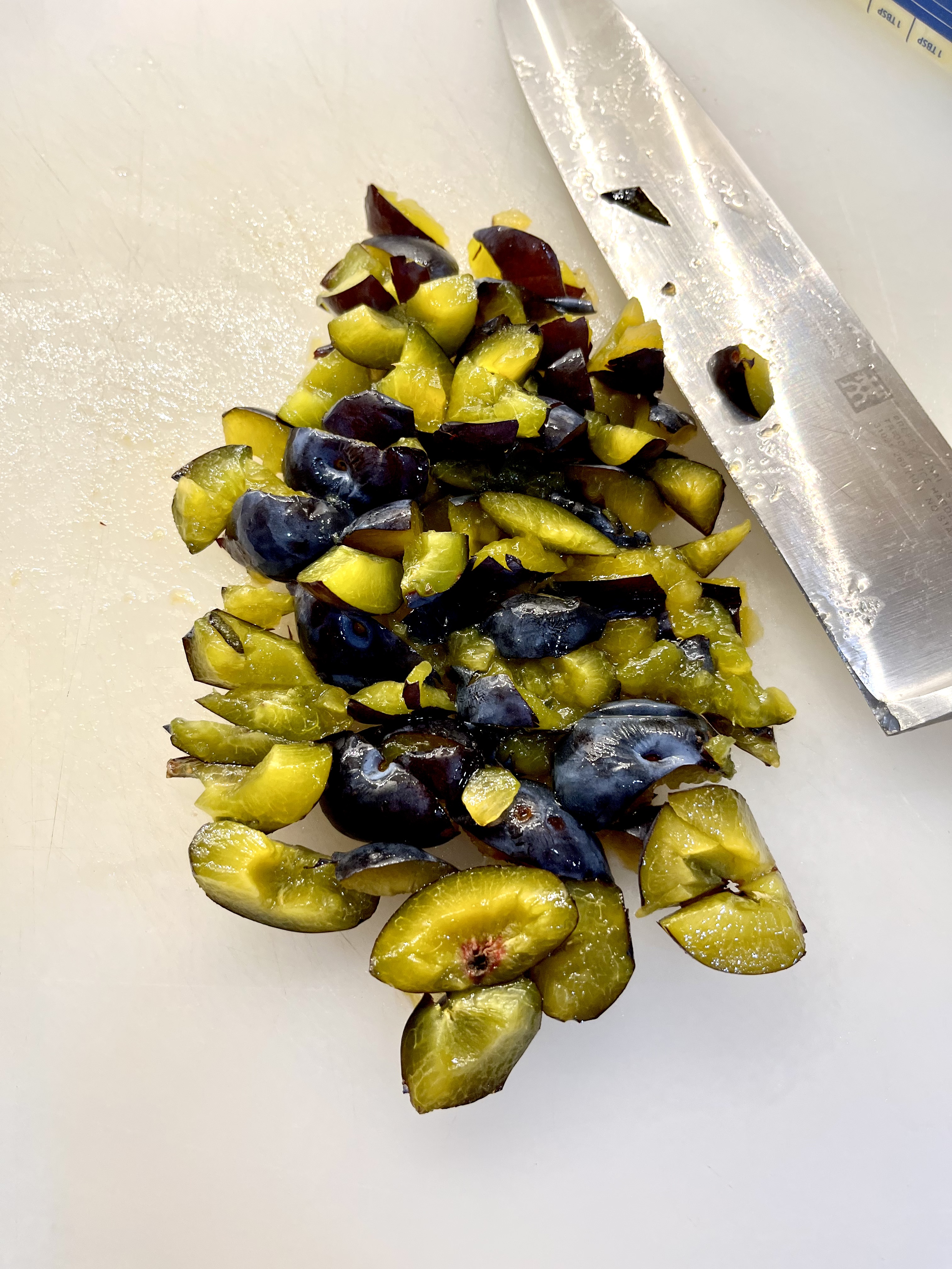 - 1 cup (190 grams) peeled, pitted, fresh ripe plums, patted dry with paper or cloth towels and diced into ½-inch pieces