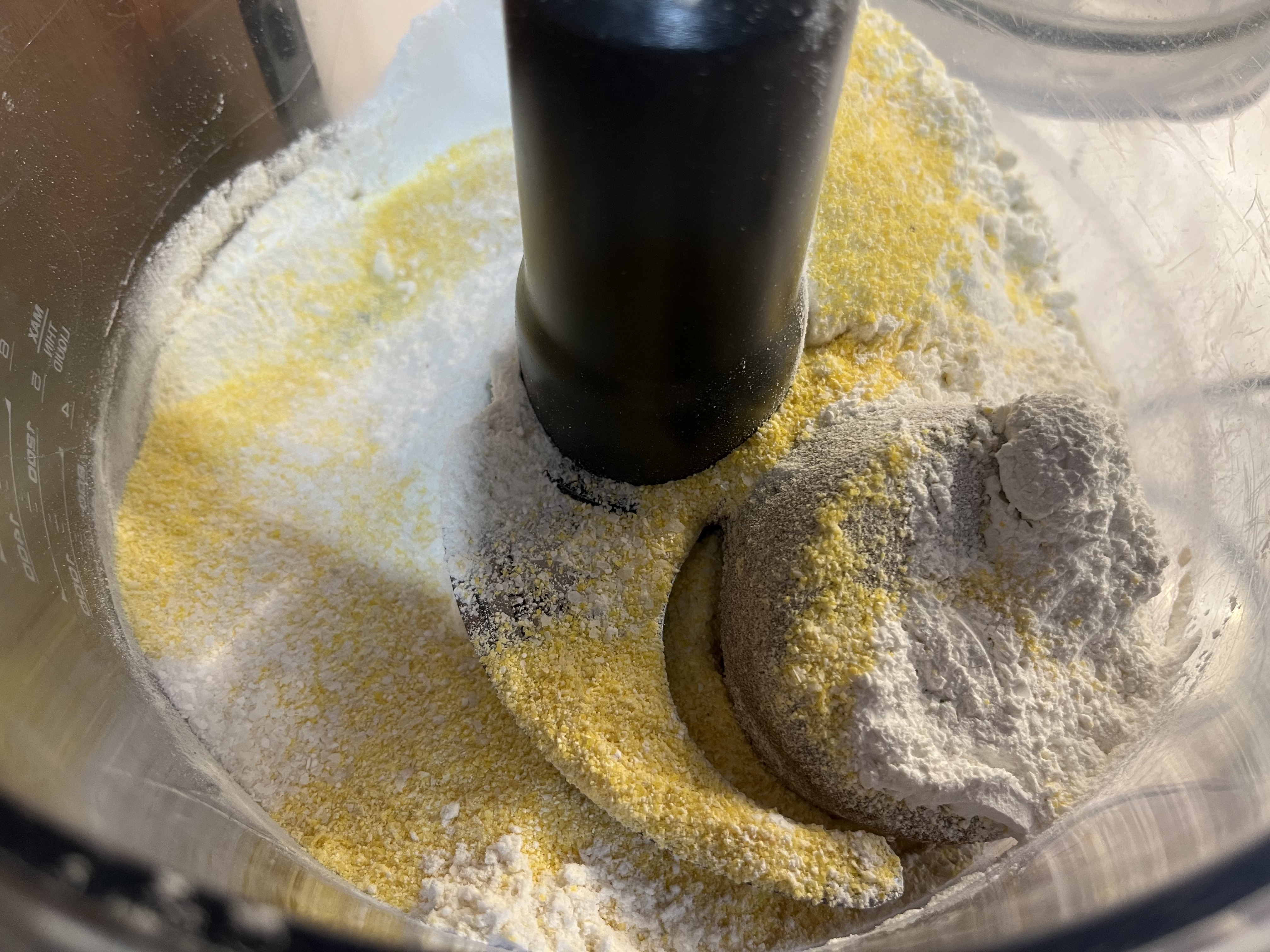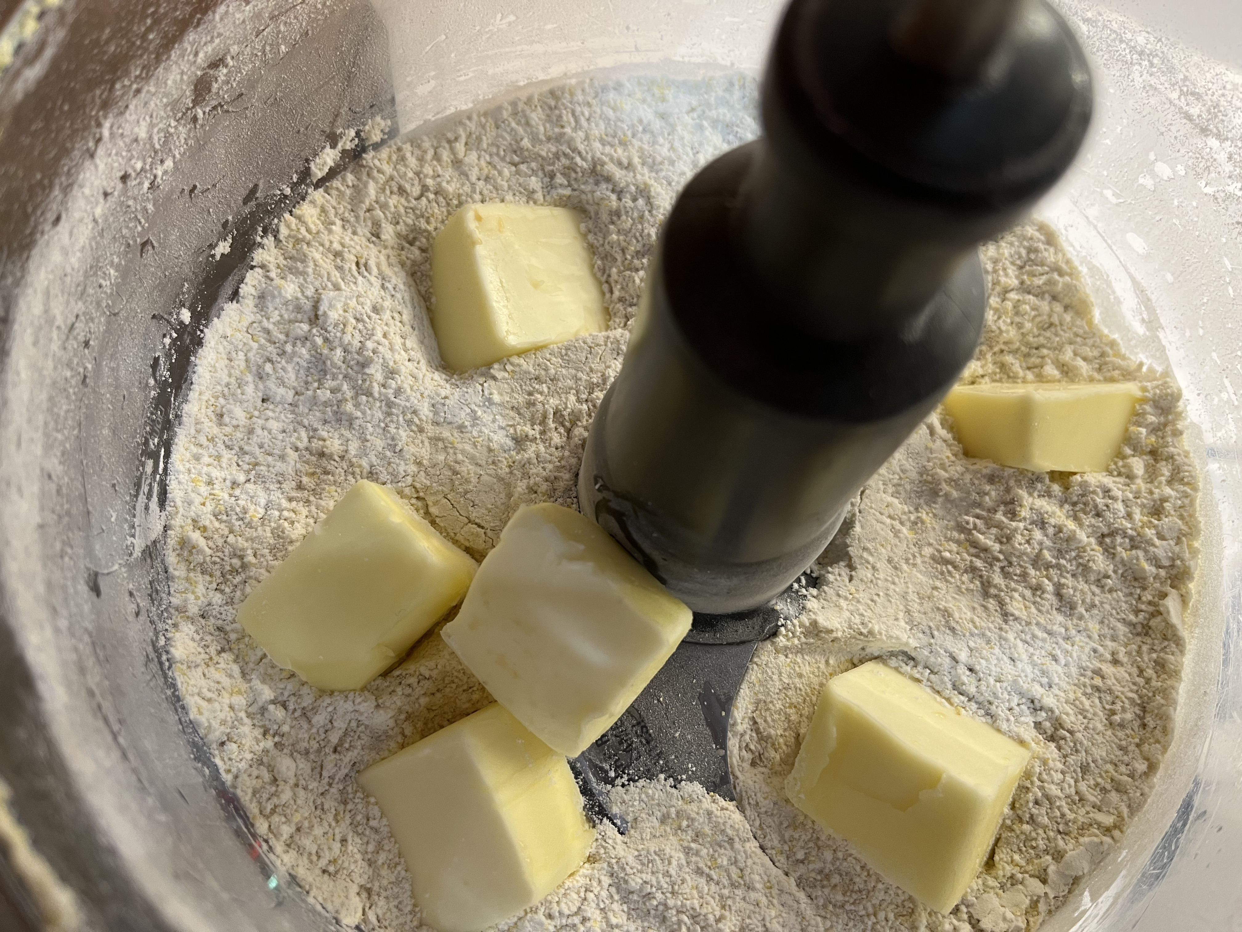 - MIX DRY INGREDIENTS/CUT IN BUTTER: In the bowl of a food processor fitted with a steel blade (or in a large bowl using a pastry cutter or your fingers), measure in the flour, cornmeal, brown sugar, baking powder, and salt. Pulse/stir a few times to mix. Add the pieces of butter and pulse/cut in/rub into the flour carefully until you have pea-sized and smaller pieces of butter.