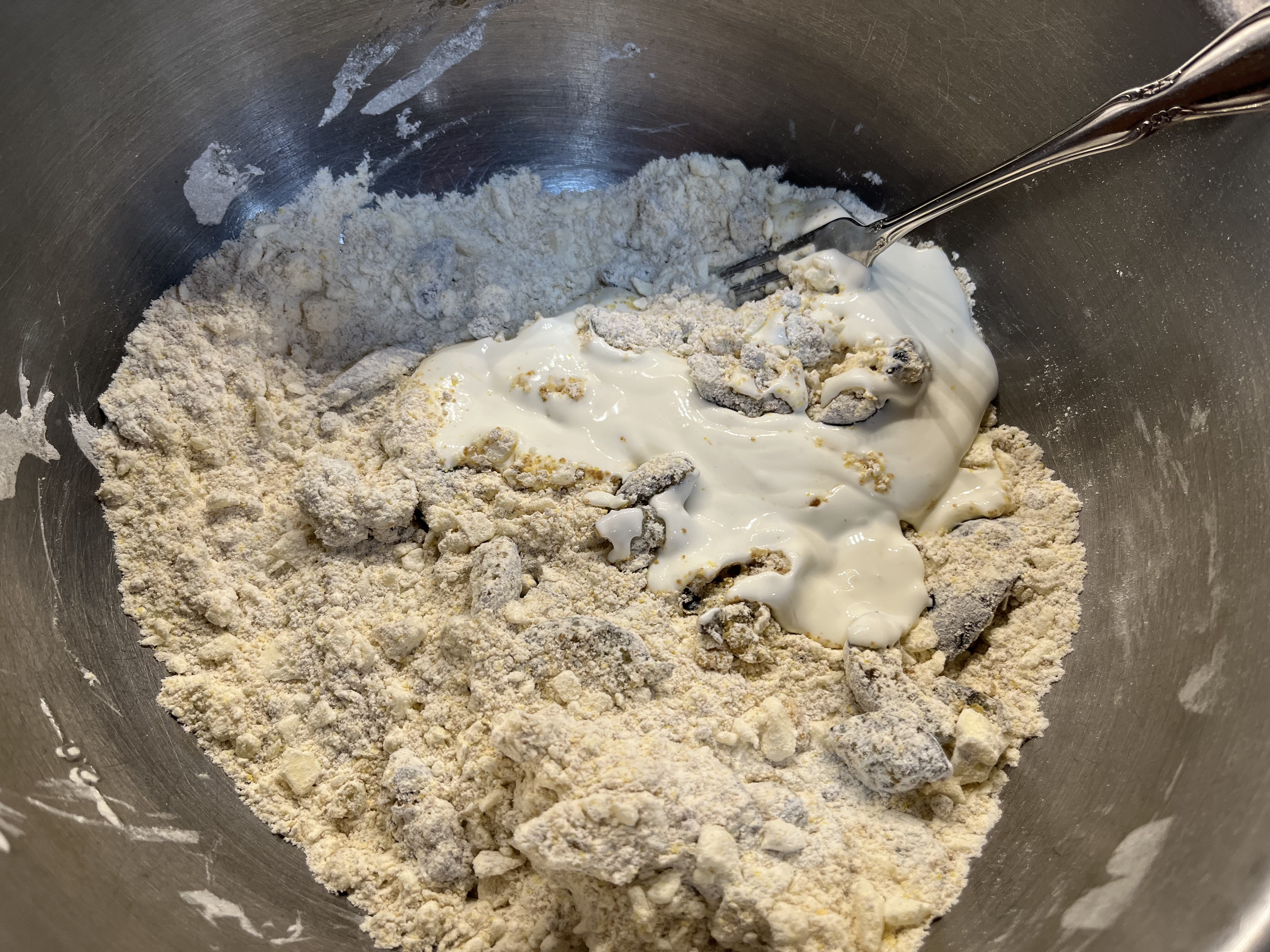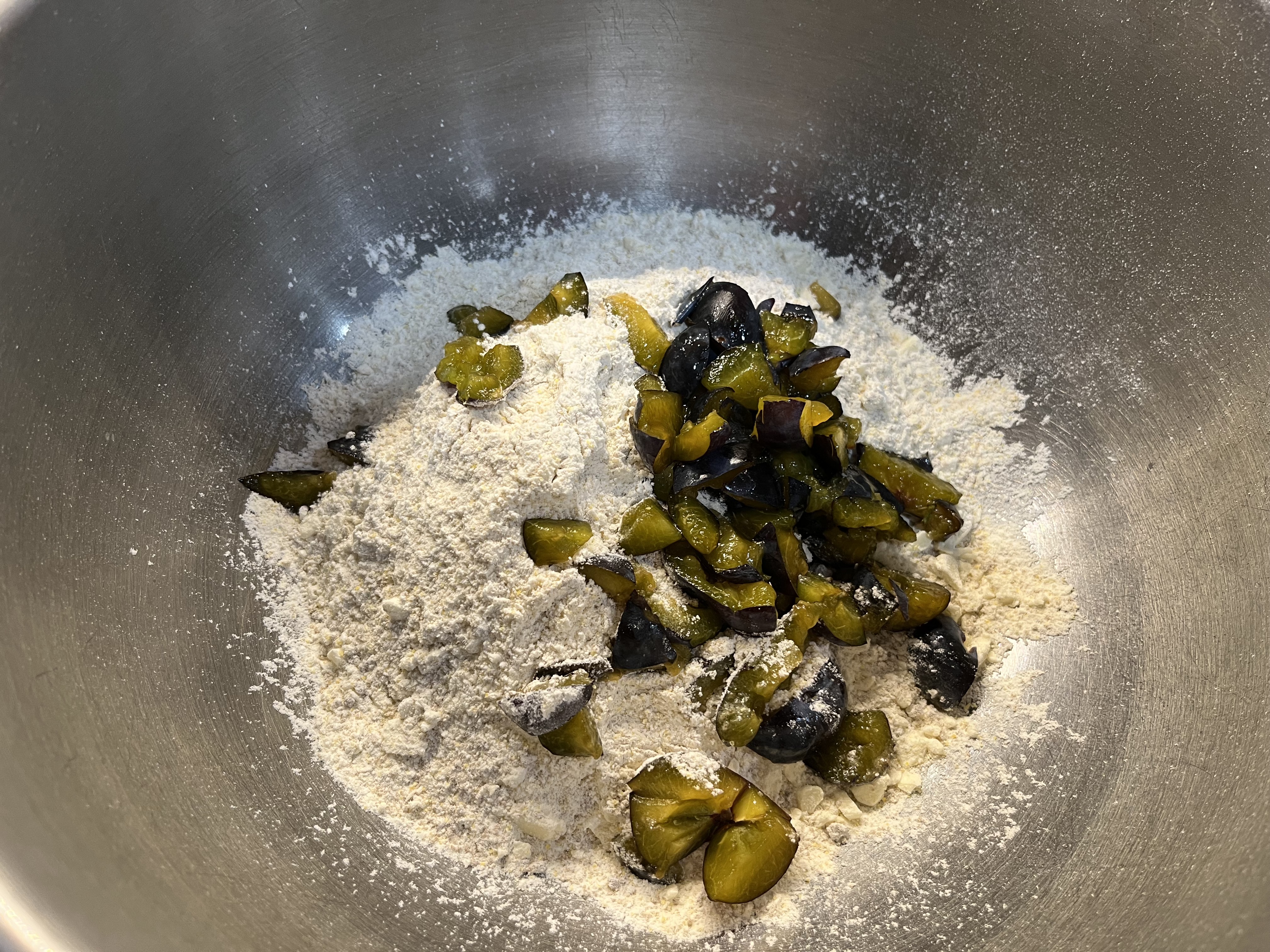 - TURN OUT FLOUR MIXTURE INTO A LARGE BOWL (if using the food processor/if you're using a pastry cutter or your fingers, the mixture will already be in the bowl) and stir in the diced plums. In a measuring cup, whisk together the sour cream or yogurt, milk, and almond extract, and pour that into the bowl. Using a table fork, stir until all the dry bits are incorporated, but the dough is still shaggy. Knead a few times until the dough barely holds together, then turn it out onto a lightly floured counter or board. The dough shouldn’t be uniform, smooth, or neat. Do not overwork the dough. (If by chance the dough is too sticky to work –and it shouldn't be if you've patted the fruit with paper towels — sprinkle with another tablespoon of flour.)