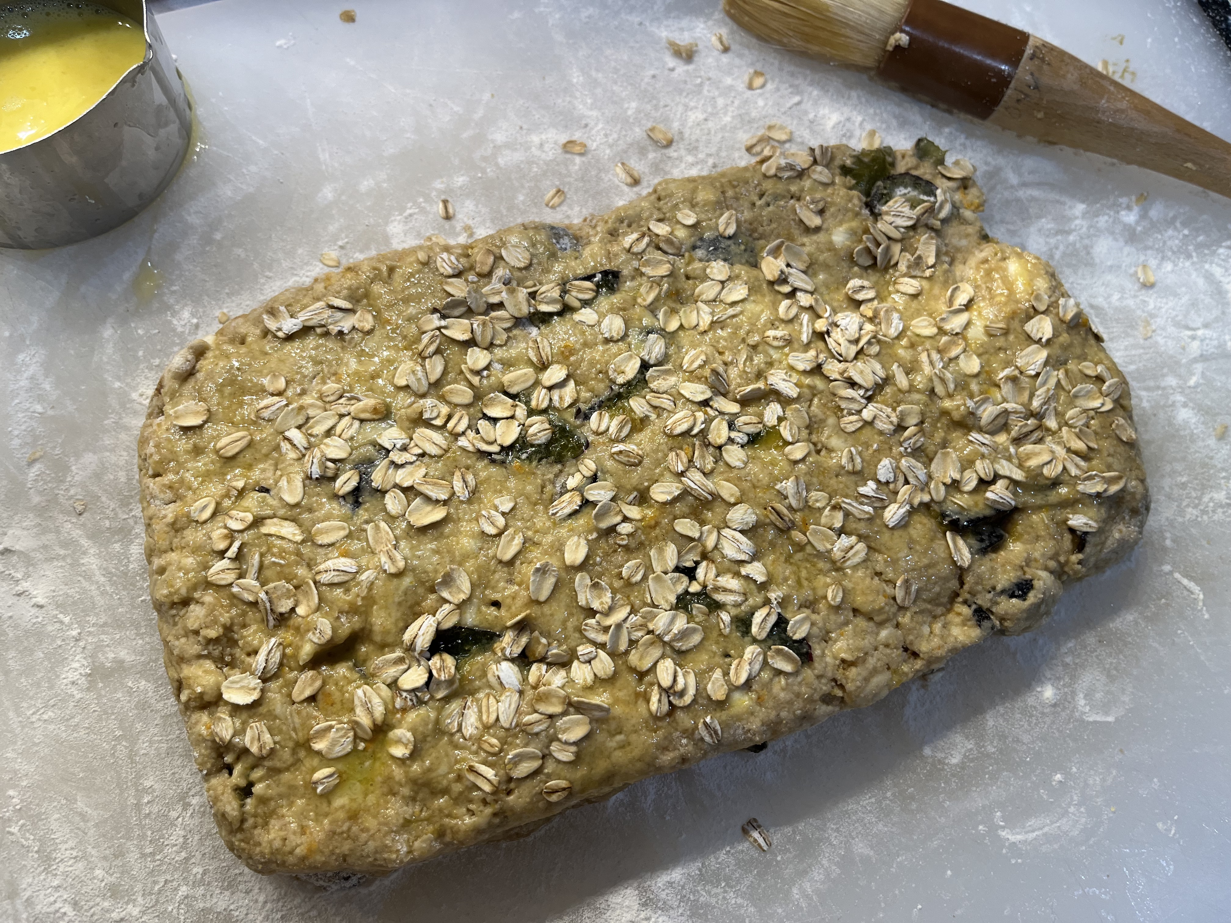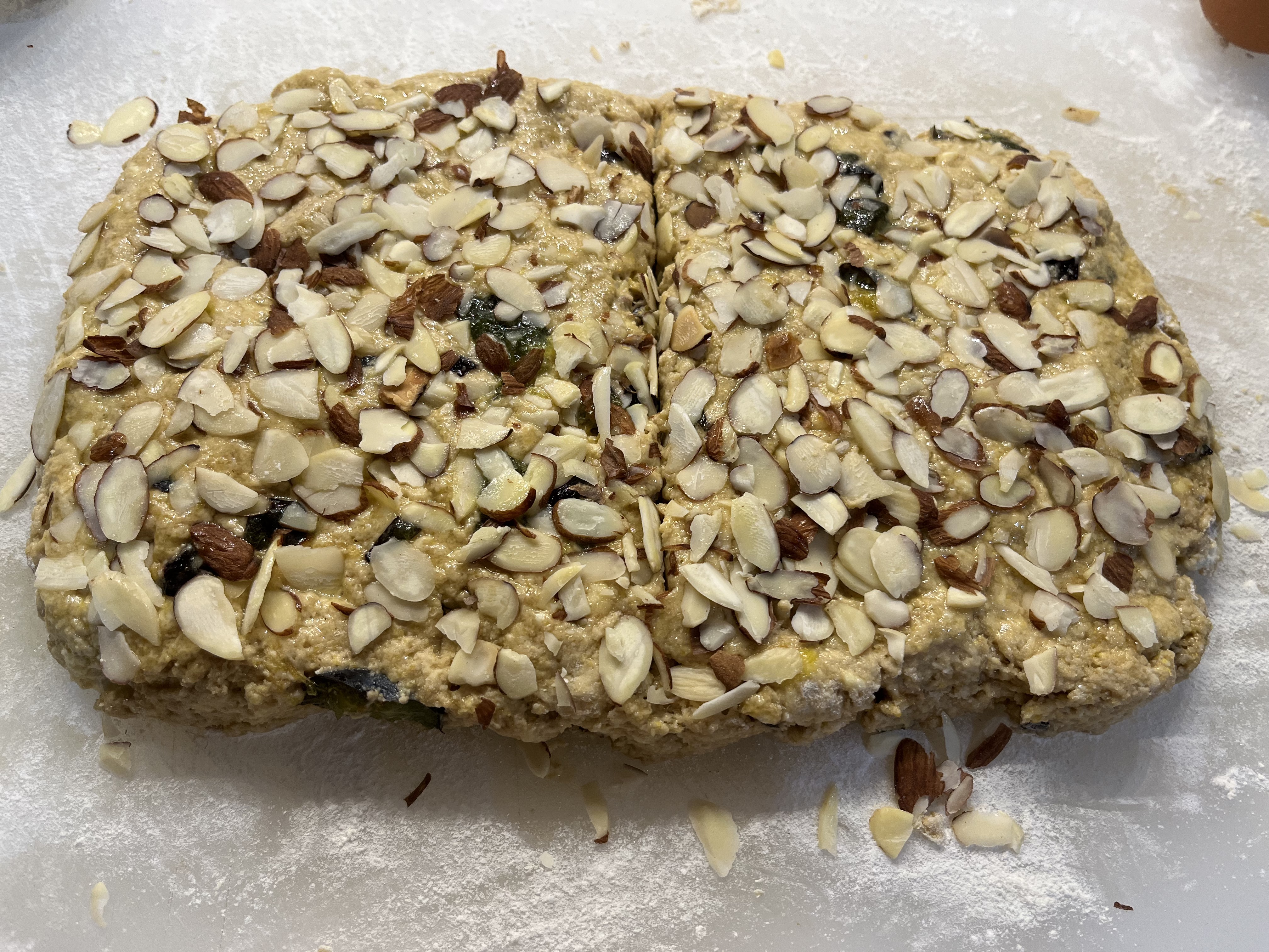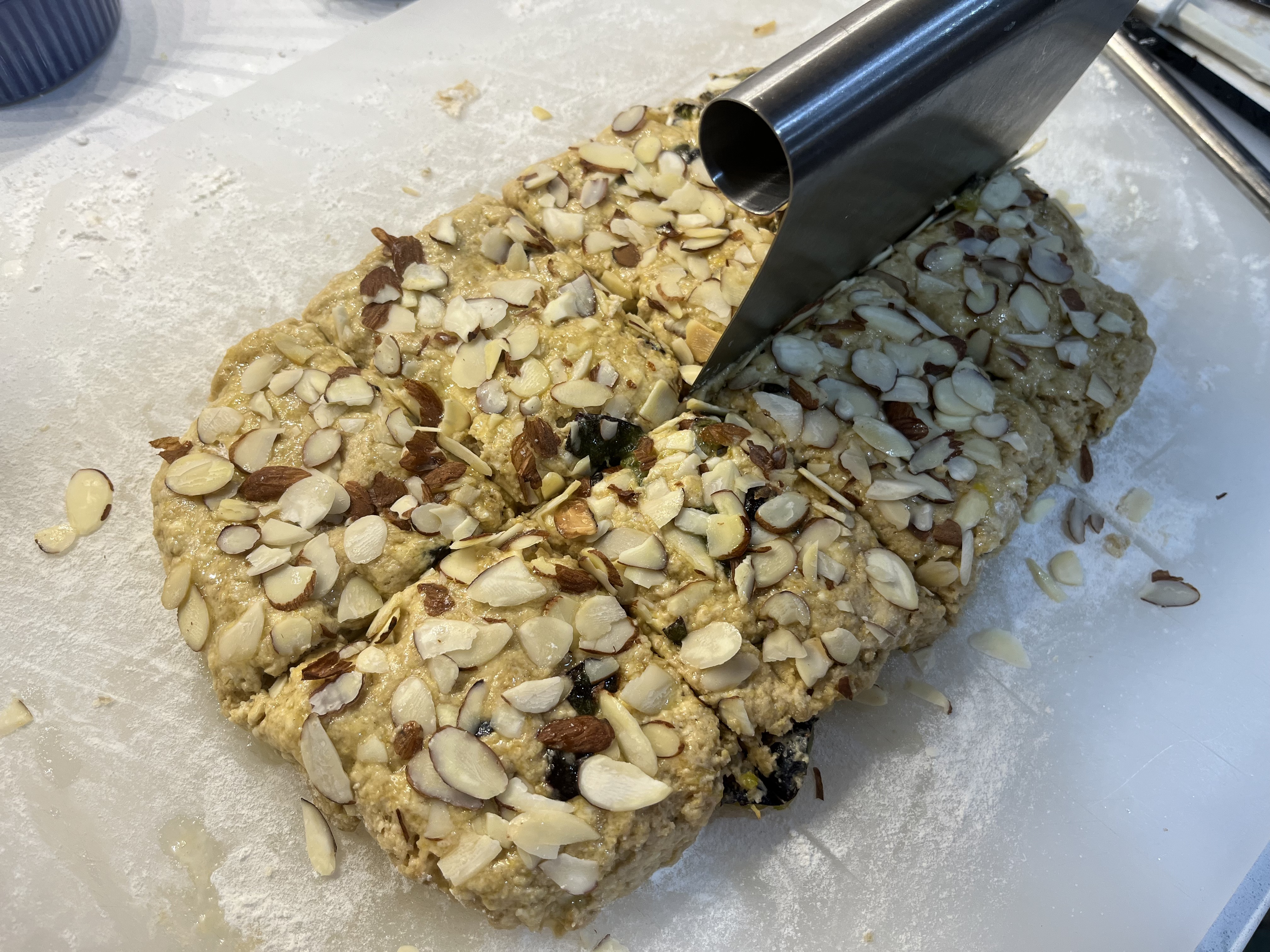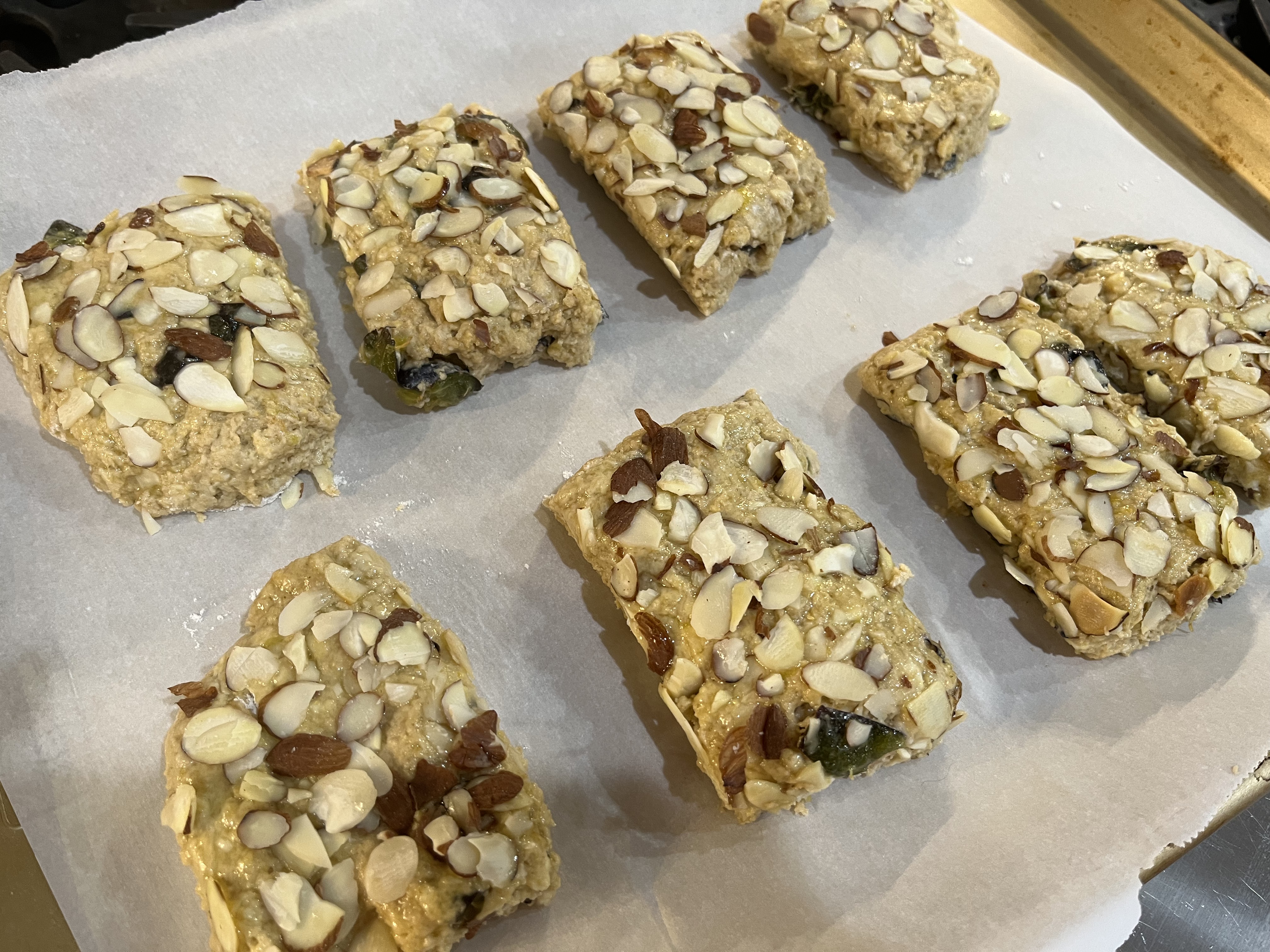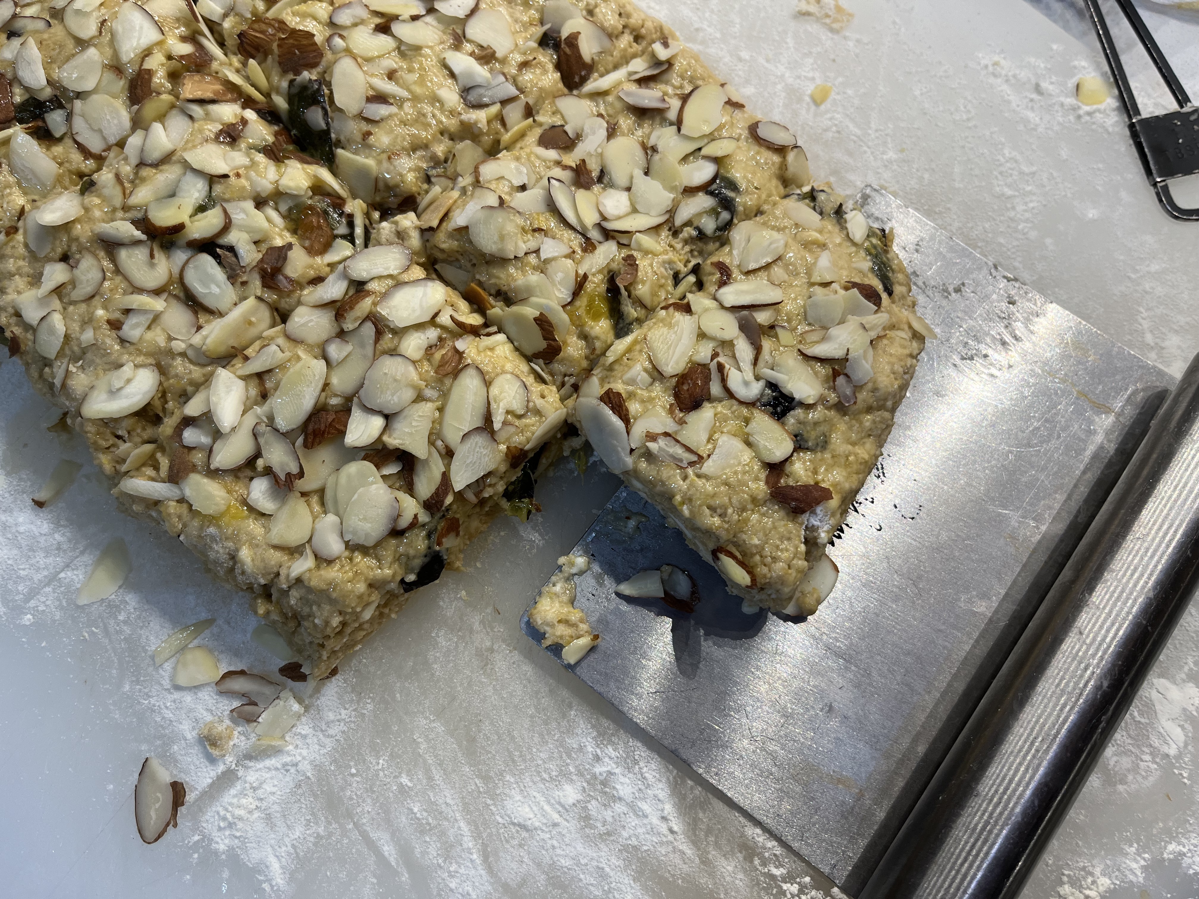 - PAT DOUGH with floured hands into a 1-inch-thick rectangle approximately 6” x 10”. Brush with lightly with about a tablespoon of the egg mixture and sprinkle with a little granulated sugar— 1 or 2 teaspoons. (You will have egg leftover you can cook for yourself or the dog.) Sprinkle the sliced almonds evenly on top and pat gently into the dough. Using a bench scraper or a knife, cut into first 2, then 4, then 8 (or then 16 for small scones—chill an hour before baking) rectangles. I like using the bench scraper to move the scones to the sheet pan. Place on prepared sheet pan as far apart as possible.