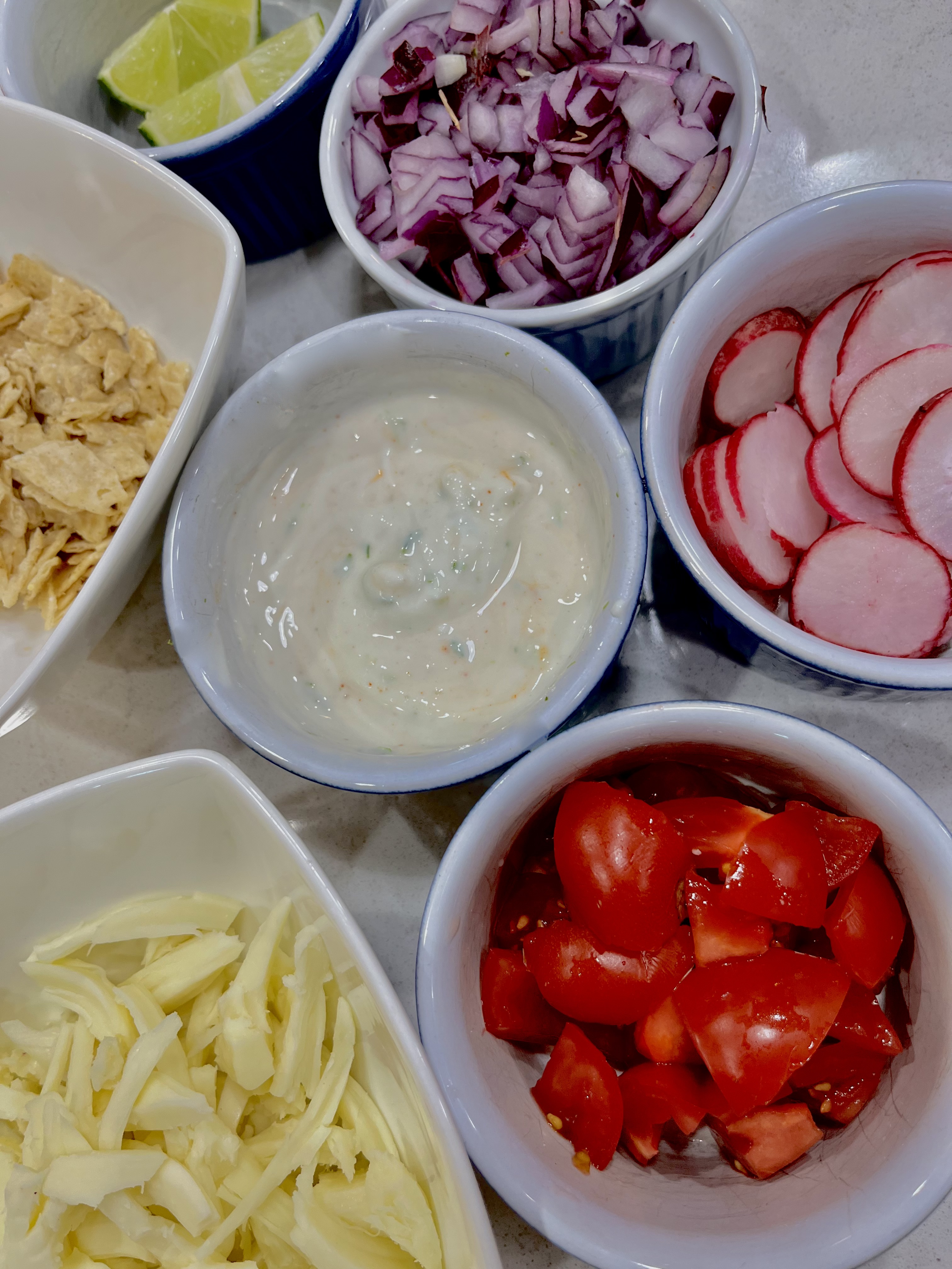 Served with any toppings you like a la chili or posole, I went with crushed tortilla chips, lime wedges, chopped red onions (you could use pickled onions), lime crema (recipe included below), sliced radishes, and shreds of Oaxaca cheese. Later, I tried some sharp Cheddar and liked it just as well. Queso fresco or Cotija (a bit saltier Mexican cheese) are other options.