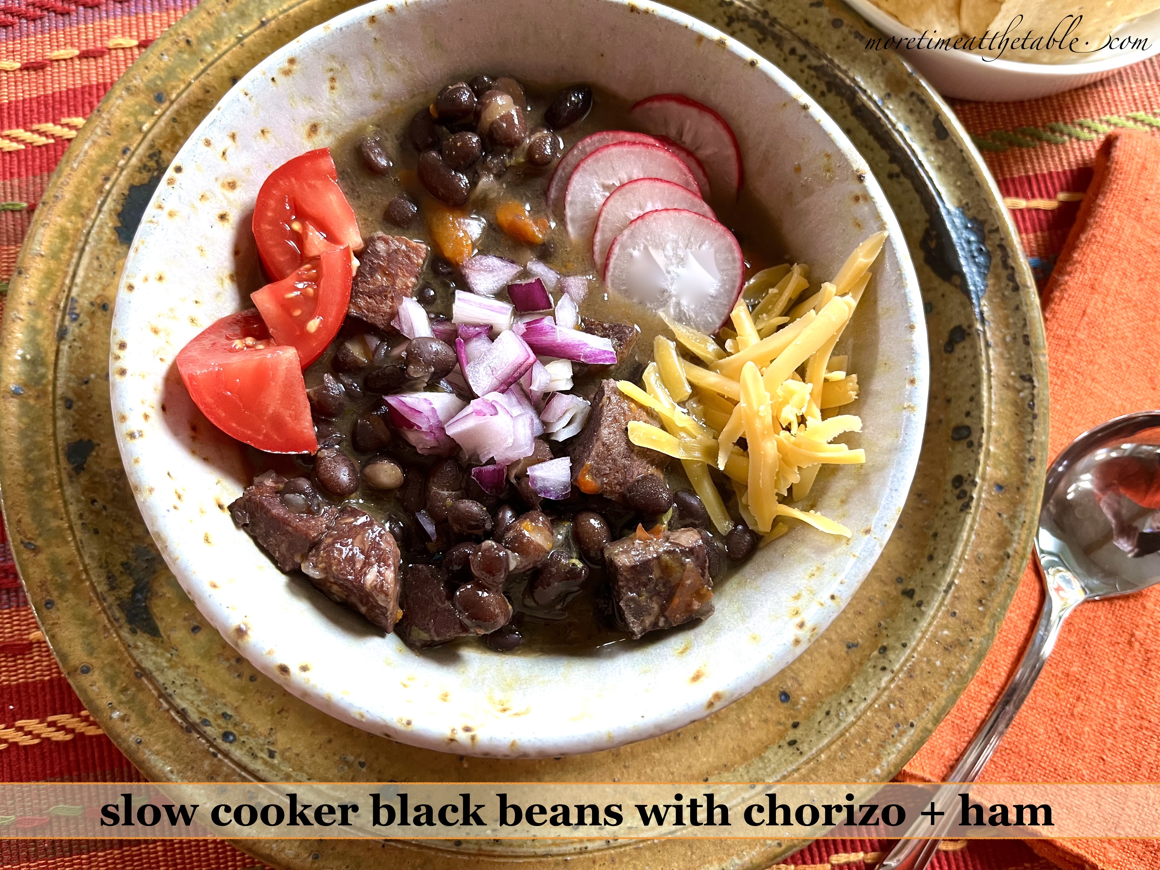 It’s been a crazy sort of few weeks around our house. Which made it a great time to work on a new slow cooker meal that’s up and cooking a big pot of dinner in not too many minutes at all. Isn’t that how slow cooker recipes should be?! Welcome SLOW COOKER BLACK BEANS WITH CHORIZO AND HAM….just in time for November football games and holiday gatherings…or for just the two of you with a few quarts in the freezer for later. Move over chili, there’s another great pot in the house easy to customize with your very favorite usual suspect toppings, including crushed tortilla chips, red onions, queso fresco or Cheddar, lime crema, tomatoes, avocado, sliced jalapeños, or….