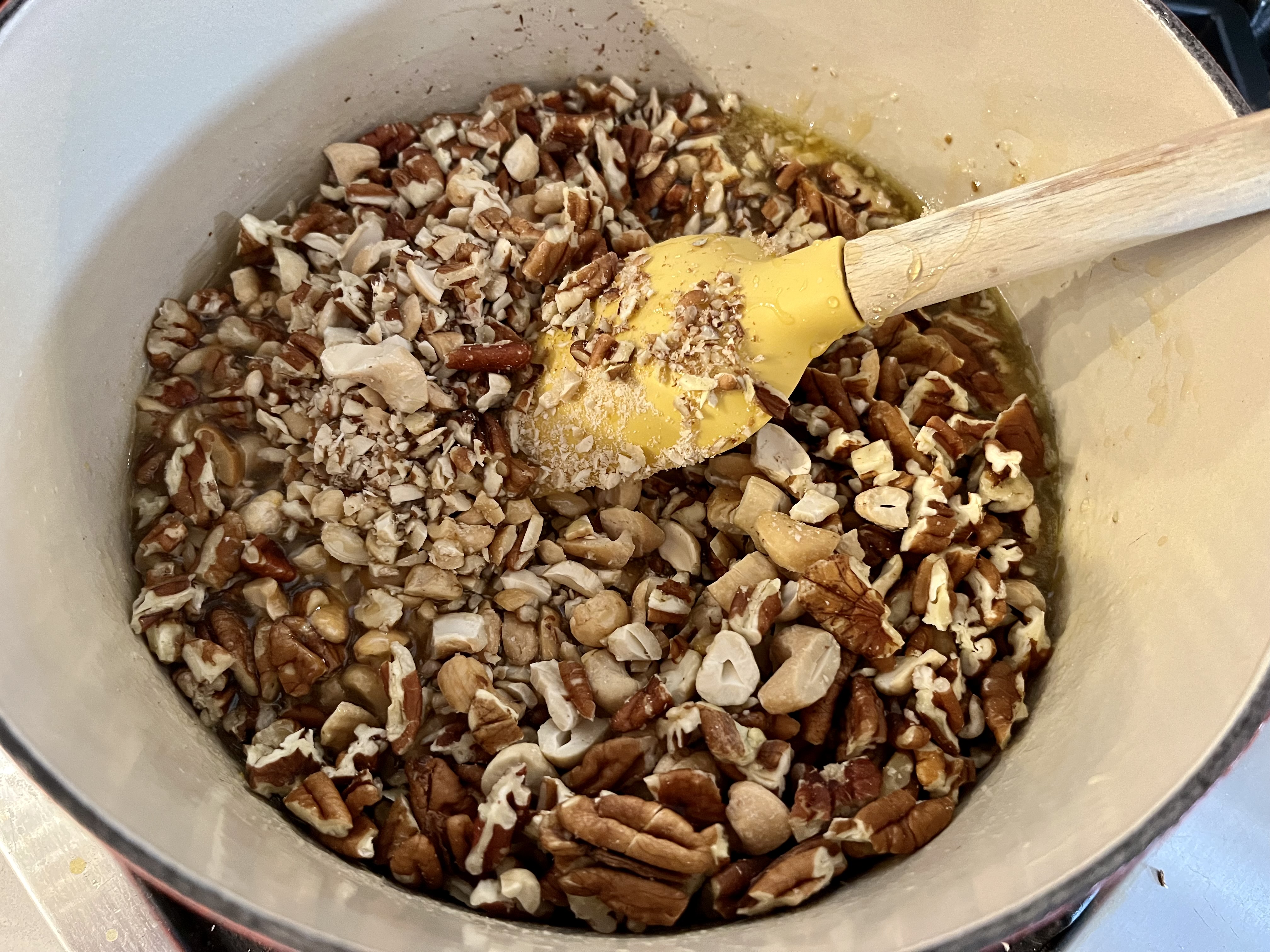 - Mix the melted butter, honey, heavy cream, brown sugar, vanilla extract, almond extract, and orange zest. This might take a minute or two to make sure it's all well-combined. Stir in the chopped nuts until evenly coated.