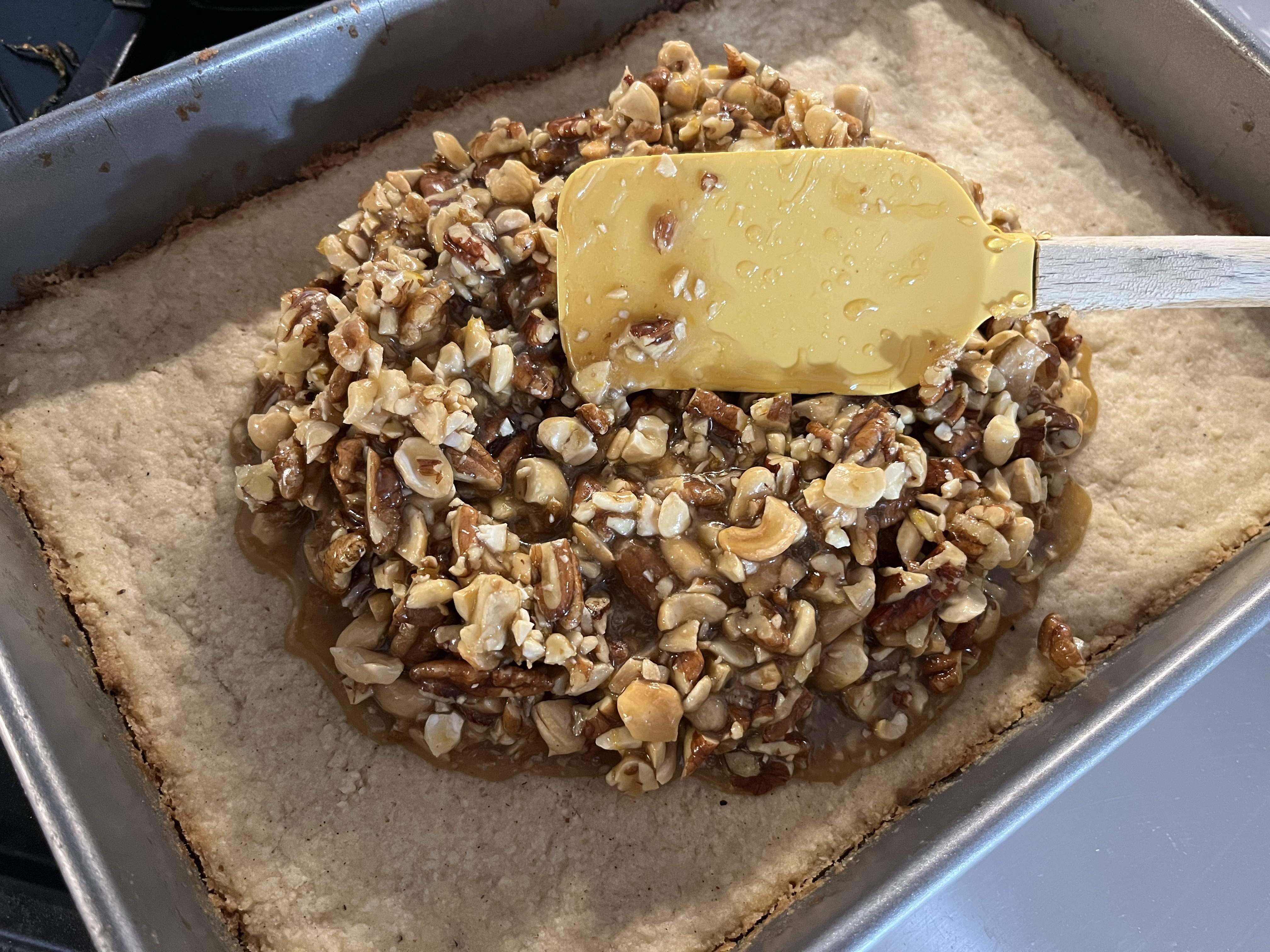 - Spread the nut mixture evenly over the baked bottom crust, trying not to let a lot of the topping go over the edges of the crust as possible.