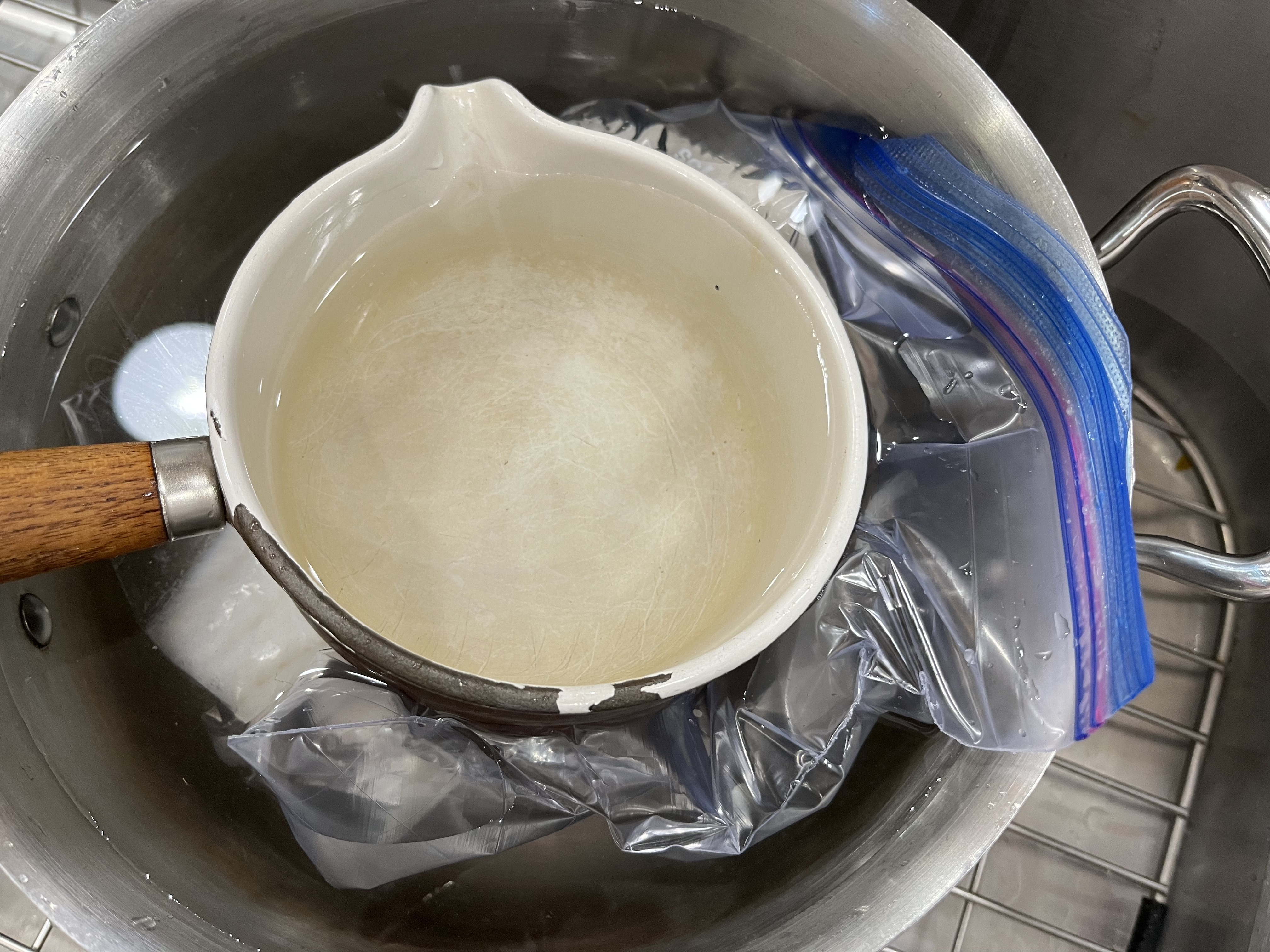 SAFETY TIP: If you’re thawing frozen fish fillets, remember to remove them from their plastic wrappers and thaw them either on a plate or in a sealable plastic bag to avoid the possibility of botulism poisoning. You can thaw overnight in fridge or place sealable plastic bag in a pot of cold water (shown here held down by a another small pan full of water) for a half-hour or so. Read up here.