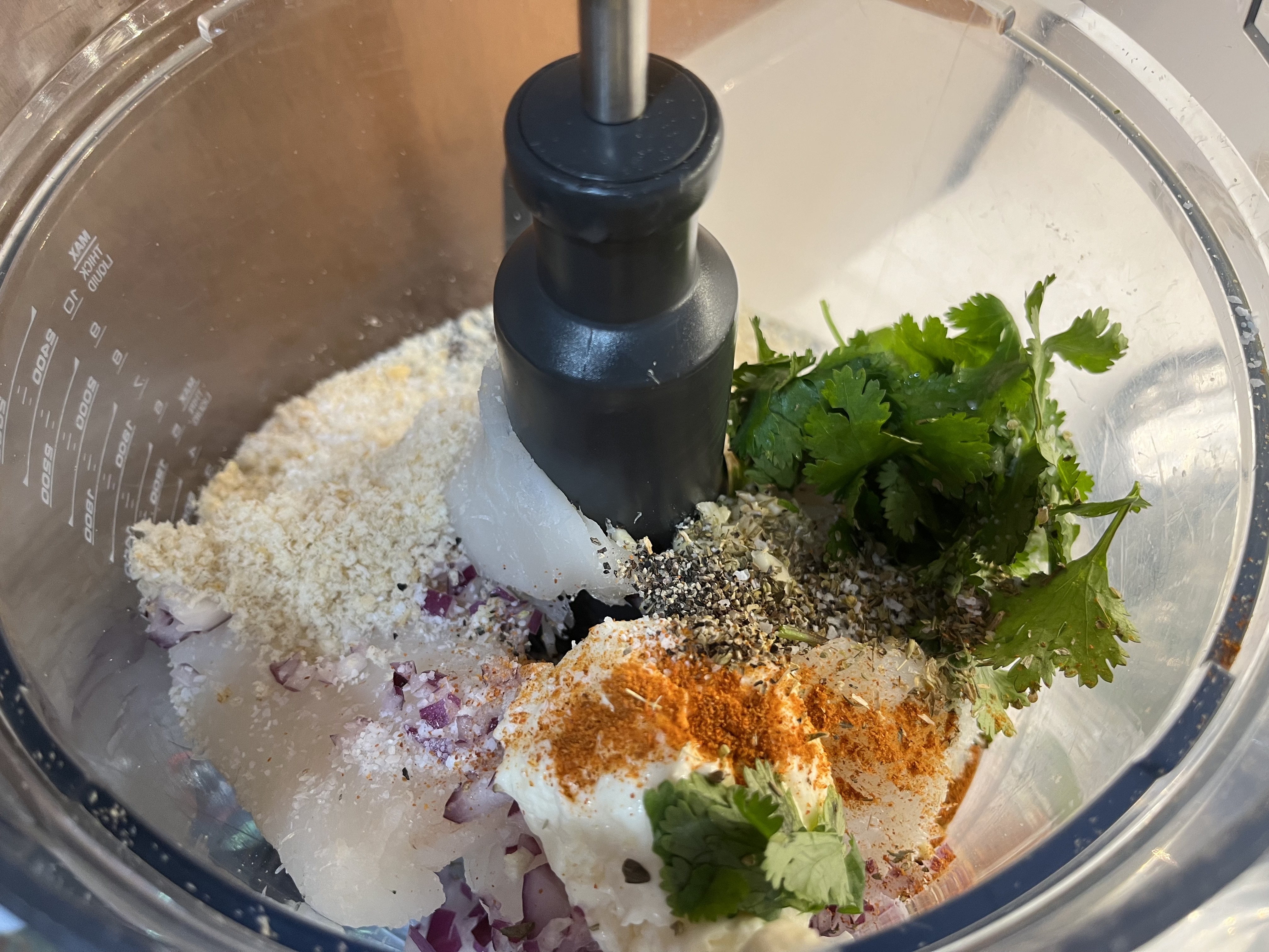 - MAKE THE FISH MIXTURE: Add the first ten ingredients to the bowl of a food processor (cod-cayenne pepper). Pulse slowly/carefully, scraping down the sides as needed, until everything is just barely mixed and holding together. (Alternately, chop fish finely and mix in a large bowl with remaining ingredients.) Do not overmix. If the mixture isn’t holding together well, add another tablespoon mayonnaise.