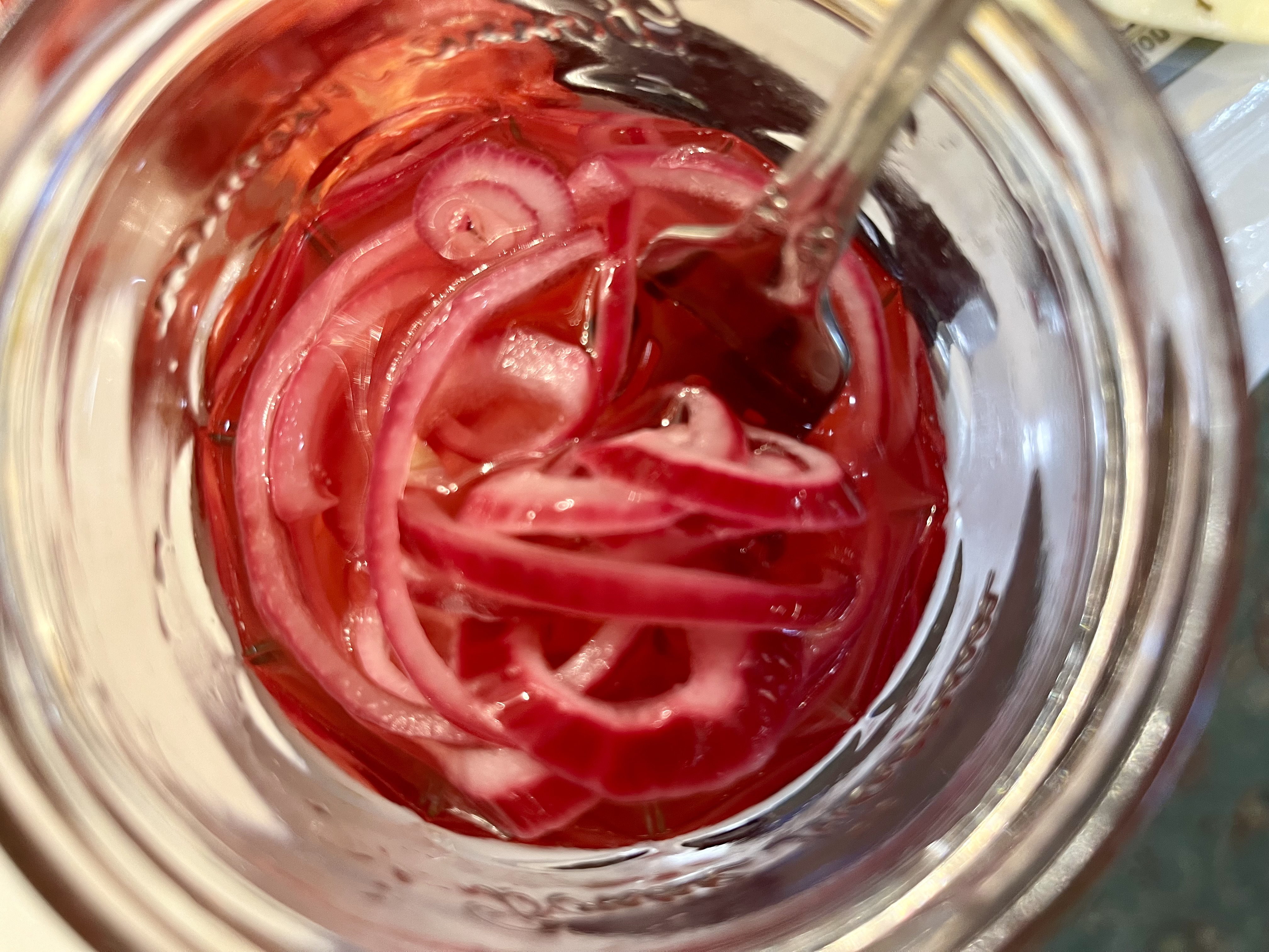 PICKLED ONIONS: Peel and slice a red onion and place it in a jar that has a lid. Heat half cup water and half a cup white vinegar with a tablespoon each kosher salt and granulated sugar in a small saucepan. Stir, cooking for several minutes until sugar and salt are dissolved. Pour hot mixture over the onions, add a pinch of crushed red pepper, and let cool. Close lid and refrigerate for up to a week or so. You can use these immediately though they’re better if they’ve chilled and rested a few hours.