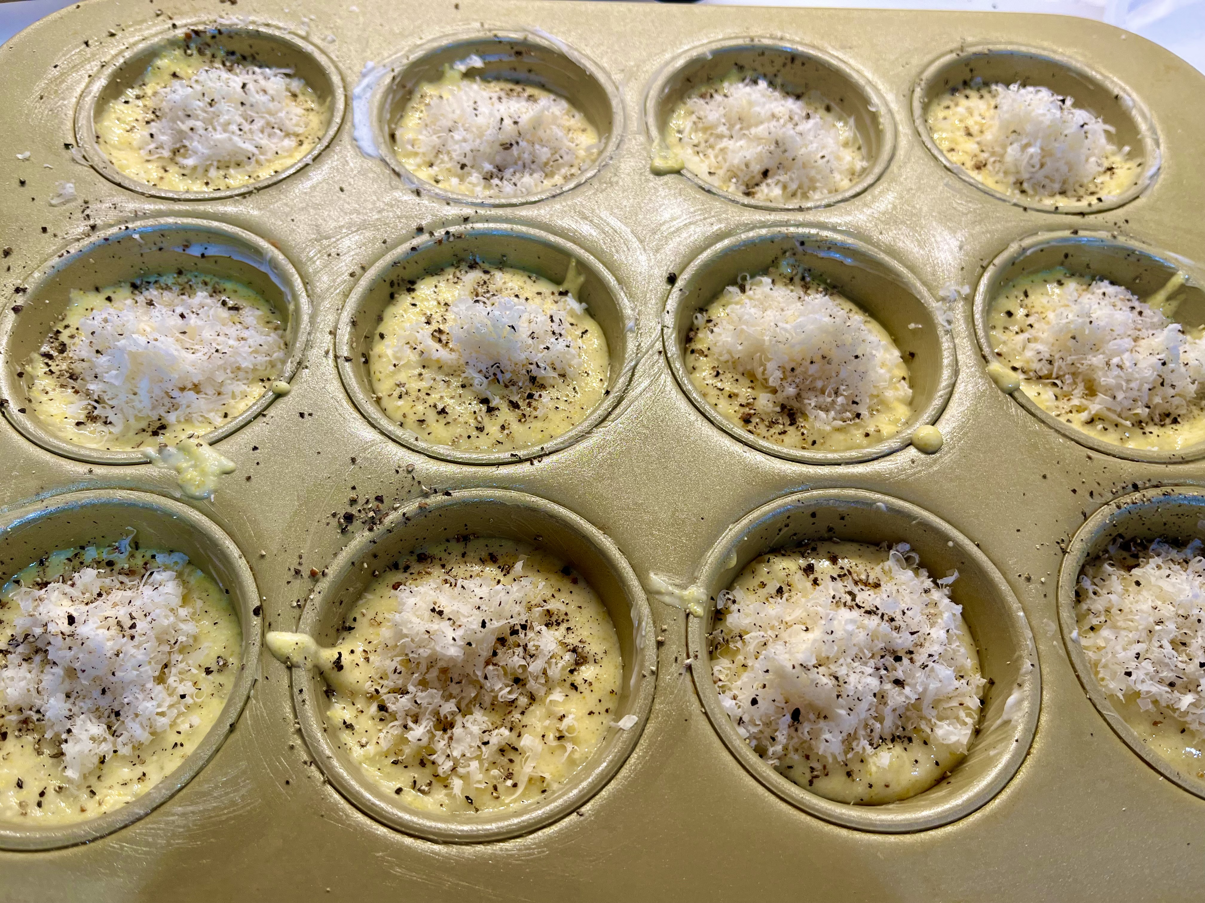 - USING A SPRAYED LARGE SCOOP, divide the batter into the greased muffin cups. Top each with some cheese – about tablespoon. Grind some black pepper over each; I use 3 twists of my pepper grinder.