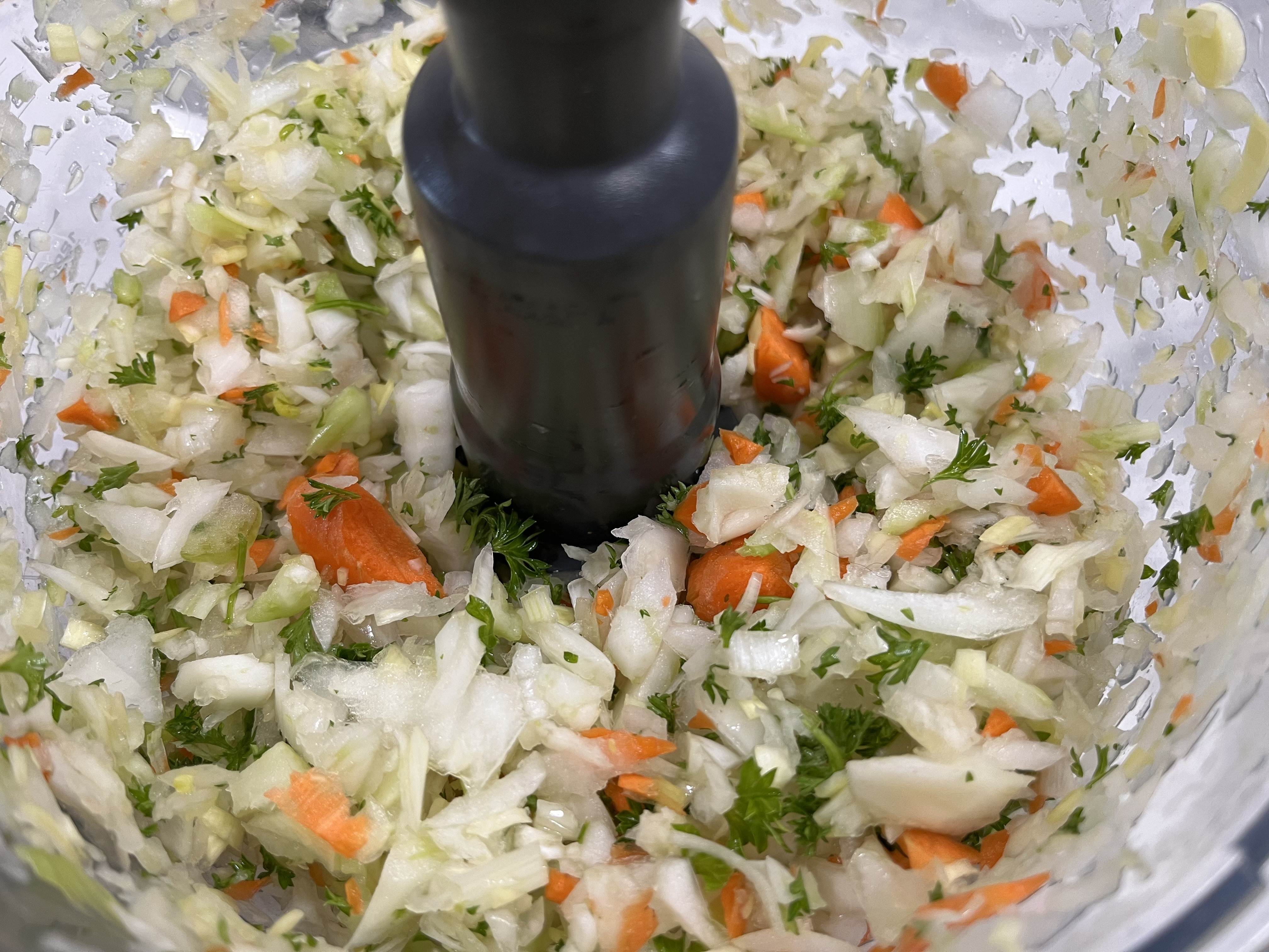 - 1 small yellow onion, cut into medium dice (Or use food processor for all of the vegetables and the parsley.)