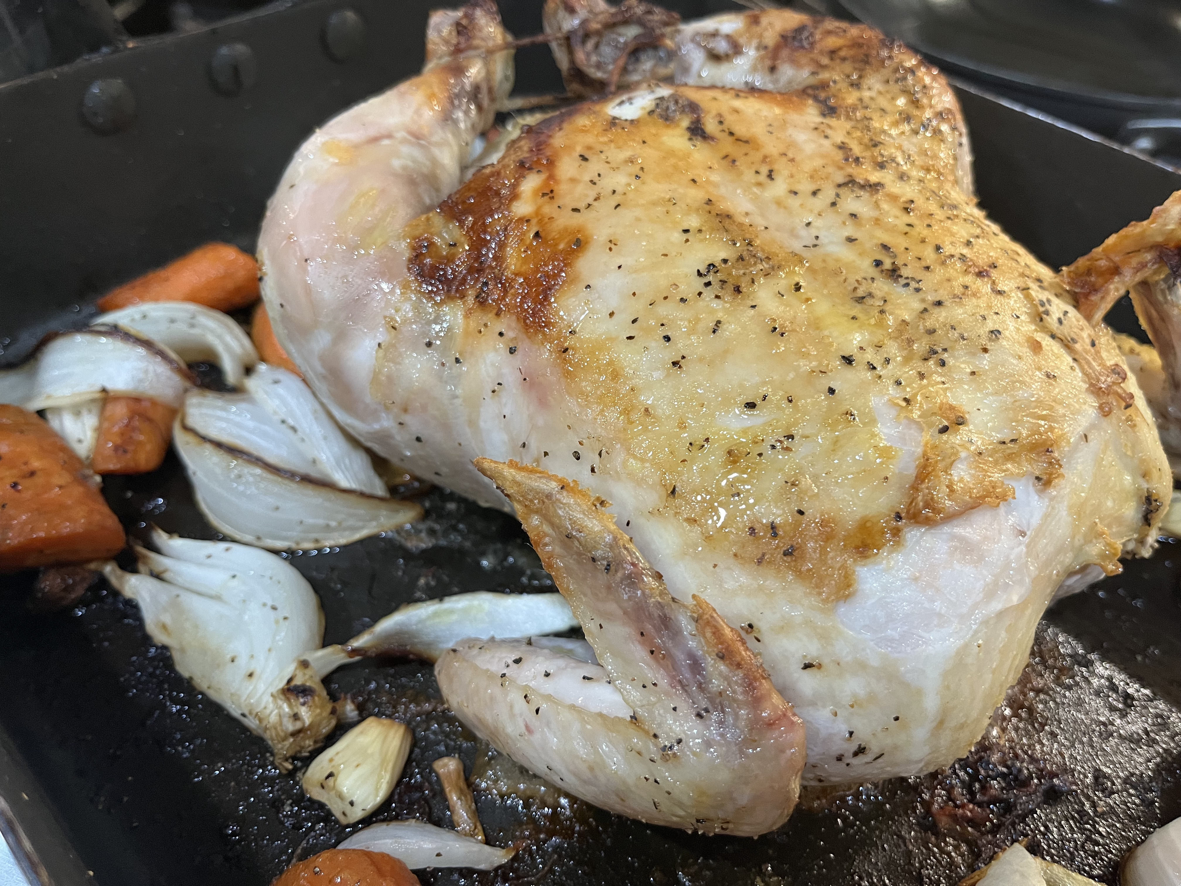 So, Alyce, why is your roasted chicken so brown on the breast and not on the legs? I cook my whole chickens breast-side down for the first 30 minutes at a higher temperature to insure complete, even cooking. When I turn the bird over, this is what it almost always looks like–perhaps because I tie the legs?