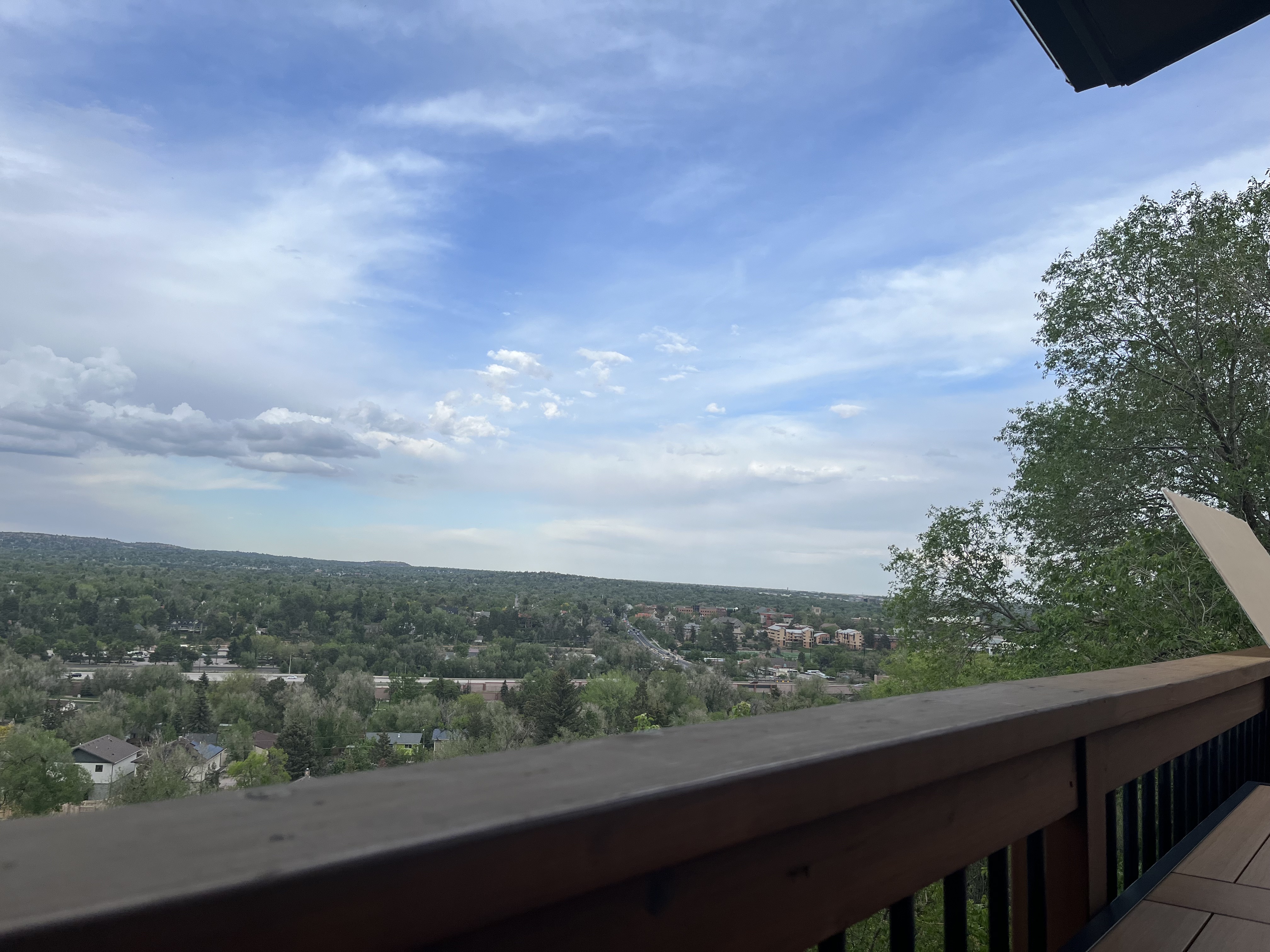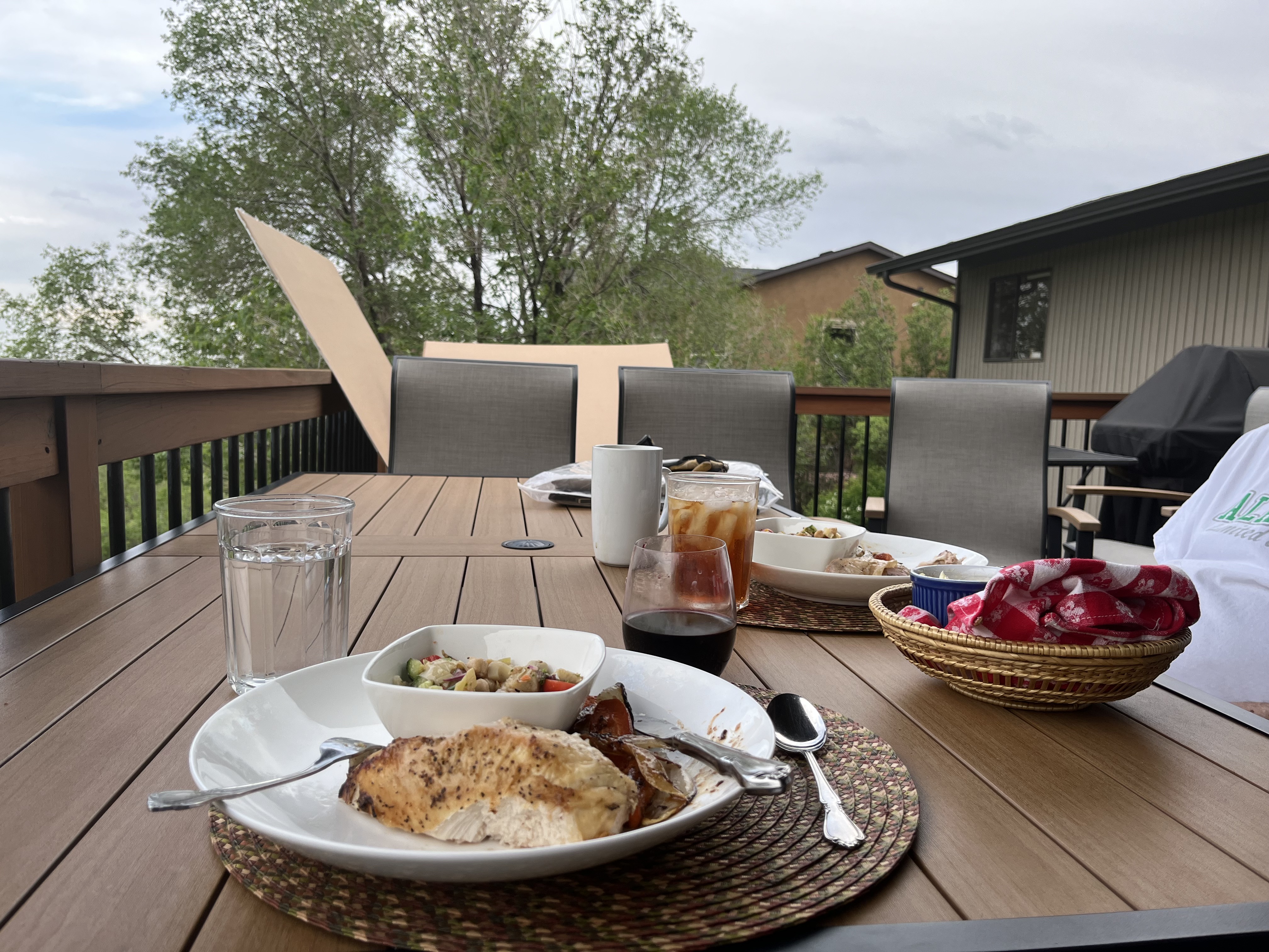 Cool evenings and lack of a table and chairs–ours had bit the dust and went away with the great GOT JUNK? guys a week or two ago– have kept us eating indoors until last night. Husband and best sous Dave spent the afternoon putting together a new outdoor dining set and the weather held! We, as always, sat and watched the eastern sky in wonder and amazement at our good fortune despite living here nearly 20 years. I made the salad you’ve read about and served it with a roasted chicken, something I make twice a month or so. Dave had the salad plus feta today for lunch and he’ll have a chicken sandwich for lunch tomorrow when he goes to work at Habitat for Humanity. (I’m finishing some Chicken-Mushroom Bolognese from Saturday night.) Tuscan Chicken Stew is on the menu tomorrow for dinner; I hope I get time to make the chicken stock first. This morning, having left the windows open all night, we awoke to a temperature of 58 degrees F in our house. Colorado! It’s cool and rainy all day and tonight’s dinner will surely be indoors. But it was surely wonderful to eat on our deck for the first time last night. Thanks, God. Here’s to many more al fresco meals.