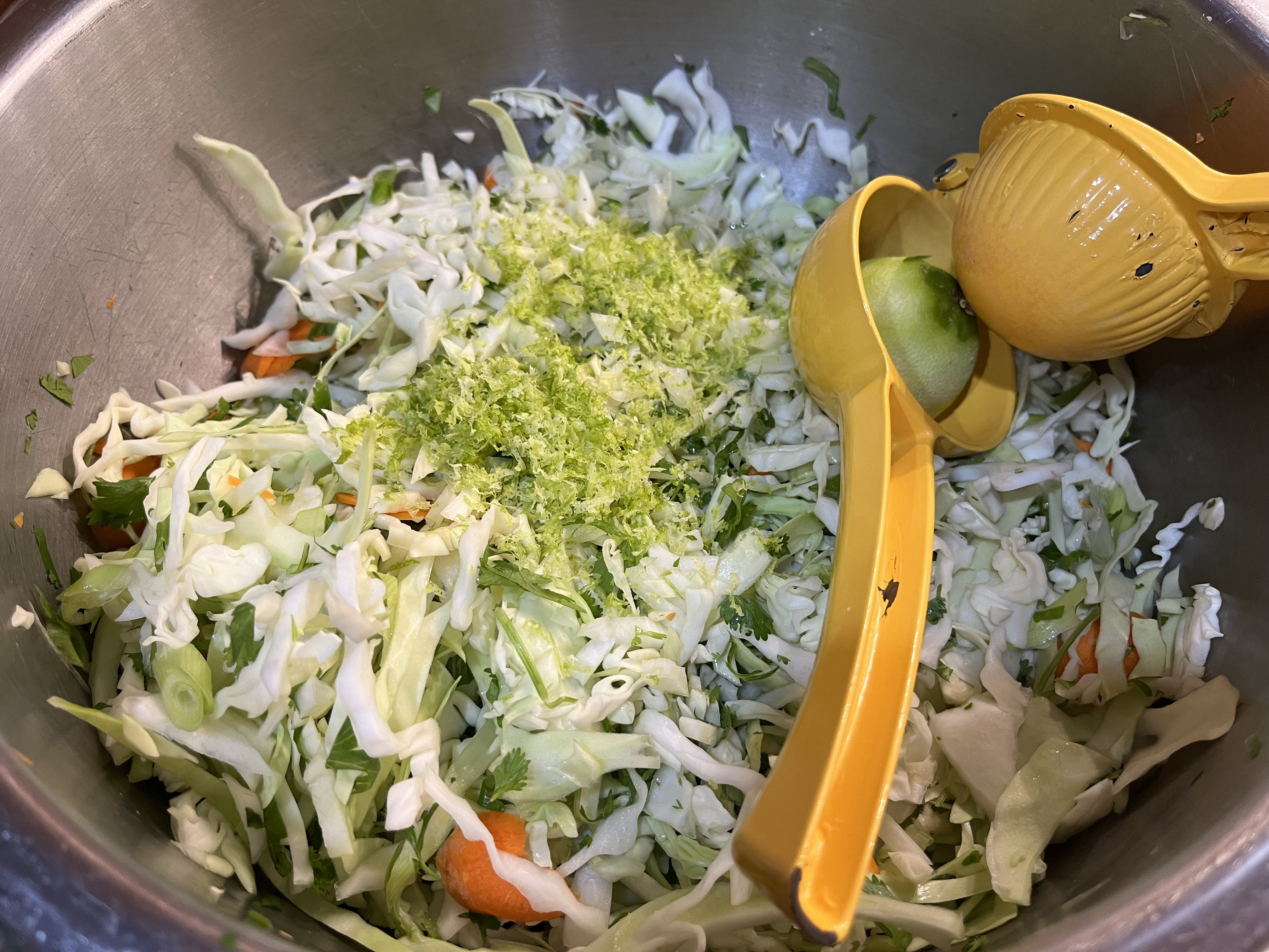 - In a large bowl, stir together the cabbage, fennel, cilantro, carrot, and scallions. Sprinkle with the lime zest and squeeze the lime juice on top. Stir in the sour cream, mayonnaise, salt, pepper, and pinch of crushed red pepper and mix well. Taste and adjust seasonings. Store in the refrigerator well-covered for 3-5 days.