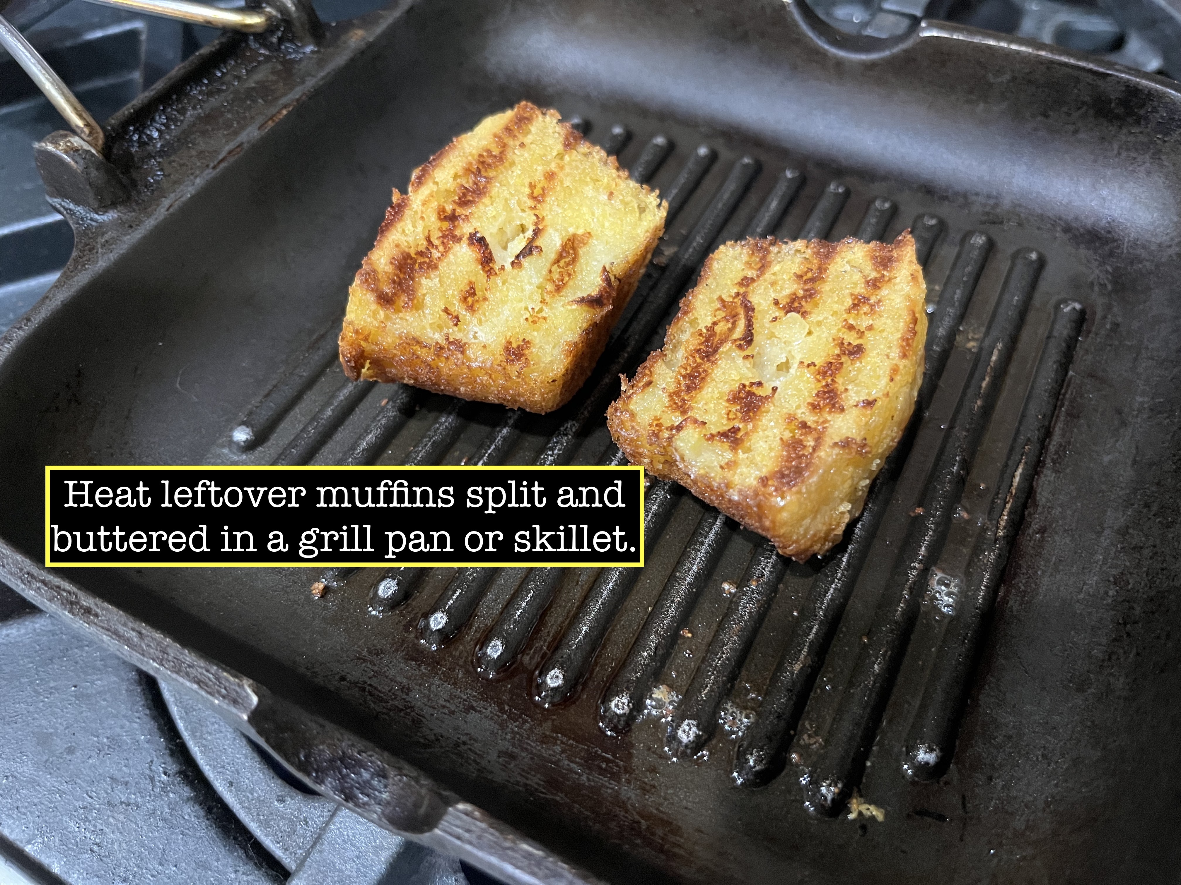 *REHEATING: While you can reheat a few muffins in the oven wrapped in foil, they’re best–and mostly quickly– split, buttered, and heated on a grill pan or in a small skillet. Try it and see; you’ll be surprised.