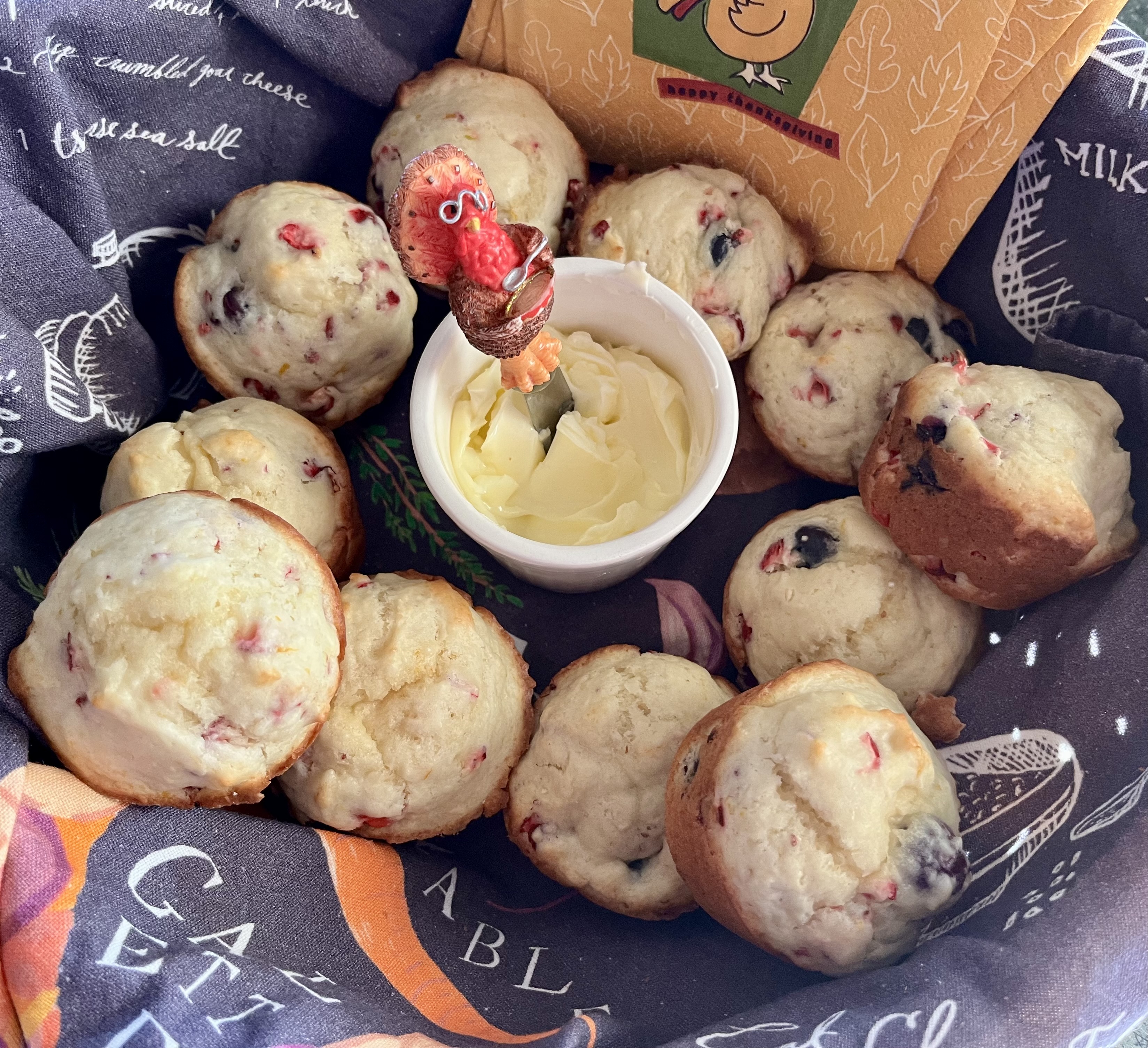 *Best eaten warm and fresh with copious amounts of butter and very hot coffee, muffins are also lovely at room temperature, great for car trip snacks, or for carrying to a meeting, class, or the Thanksgiving potluck. Stick them in a towel or napkin-lined basket, add a ramekin of butter with a spreader, cover with a towel or plastic wrap, and off you go.